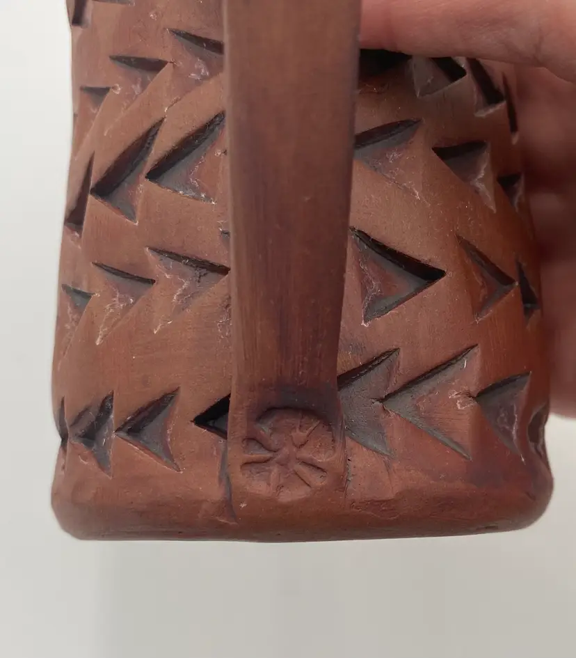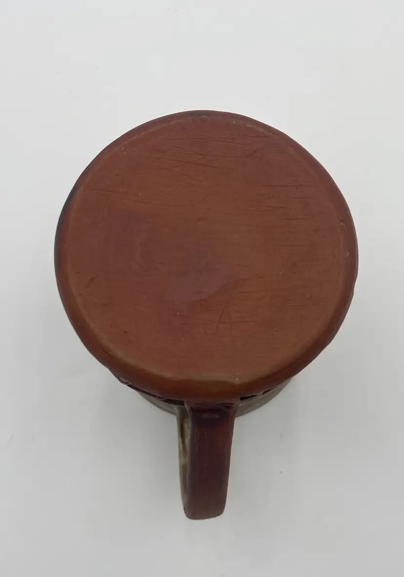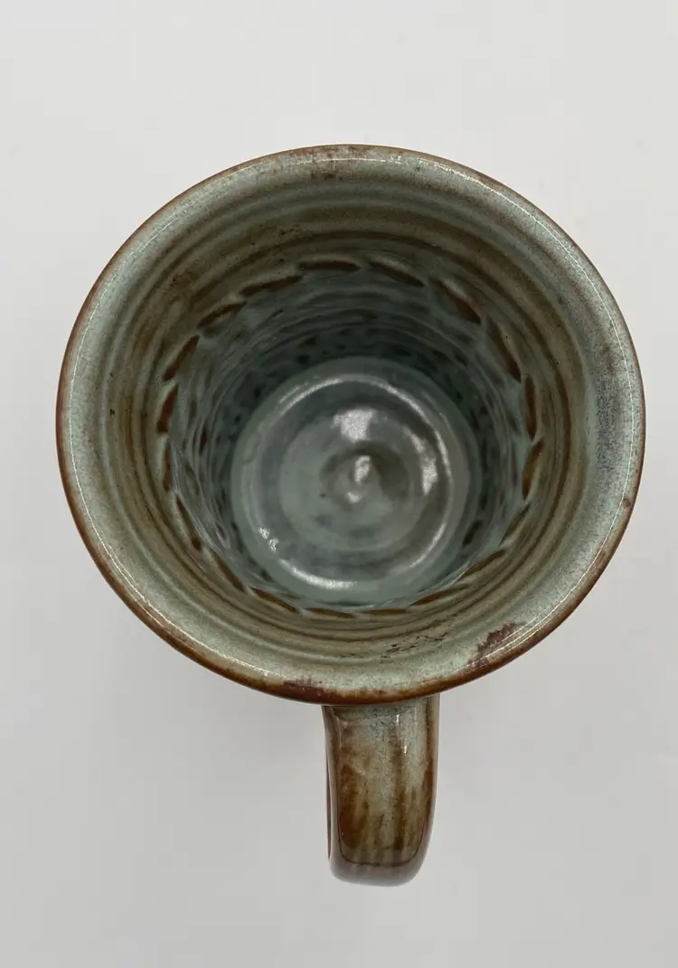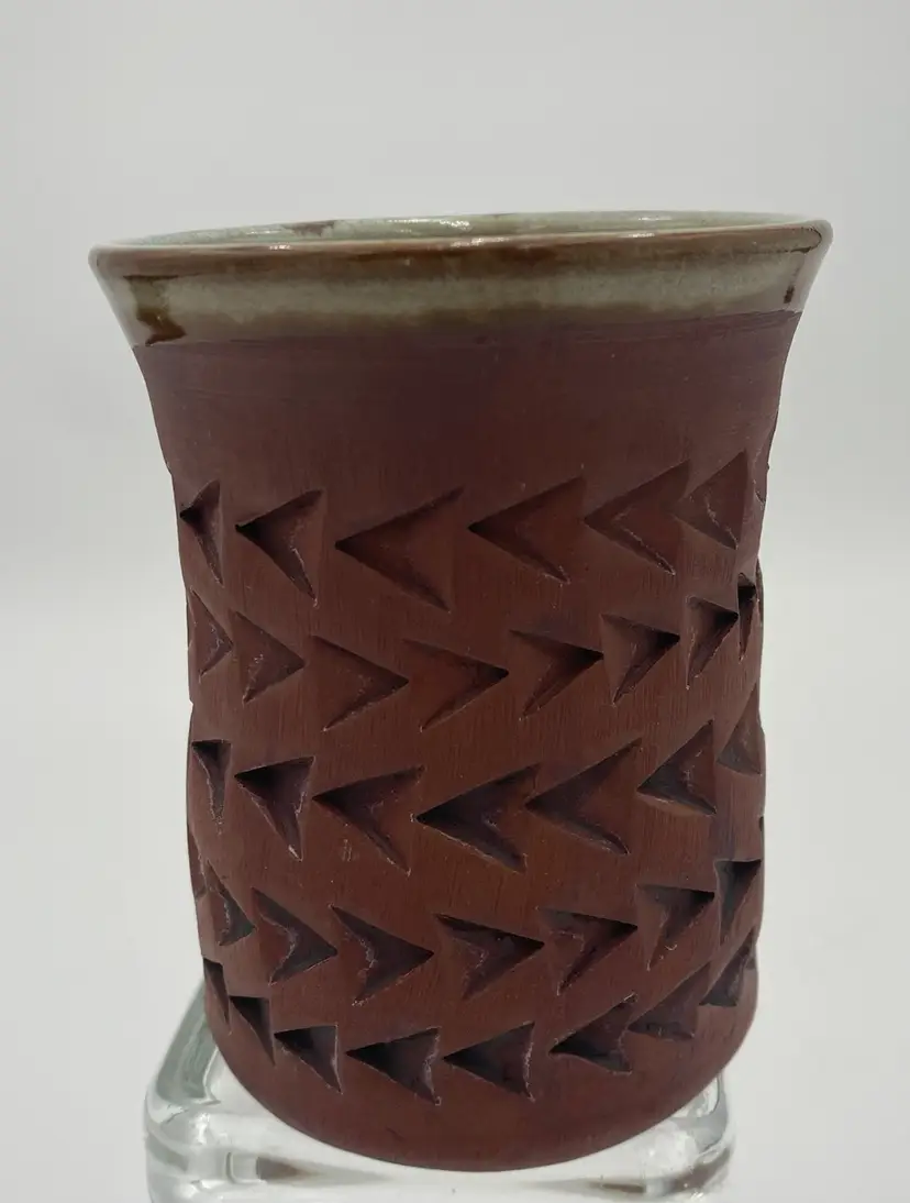 Crafted with an eye for tradition and a touch of modern artistry, this studio art pottery mug is a unique addition to any collection or daily routine. The mug is made of rich red clay, complemented by imprinted arrow patterns that lend a contemporary design aspect to the piece. Its light mint green Majolica glaze, stretching from the outer rim through the interior and top of the handle, adds a playful pop of color and made the cup watertight. With a comfortable 12-ounce capacity and measurements of 4.3 inches in height and 3.25 inches in diameter, this mug is designed for both hot and cold beverages. The hand-shaped and attached handle, complete with a distinctive mark, ensures a secure grip. This original piece embodies the spirit of the artisan pottery.
