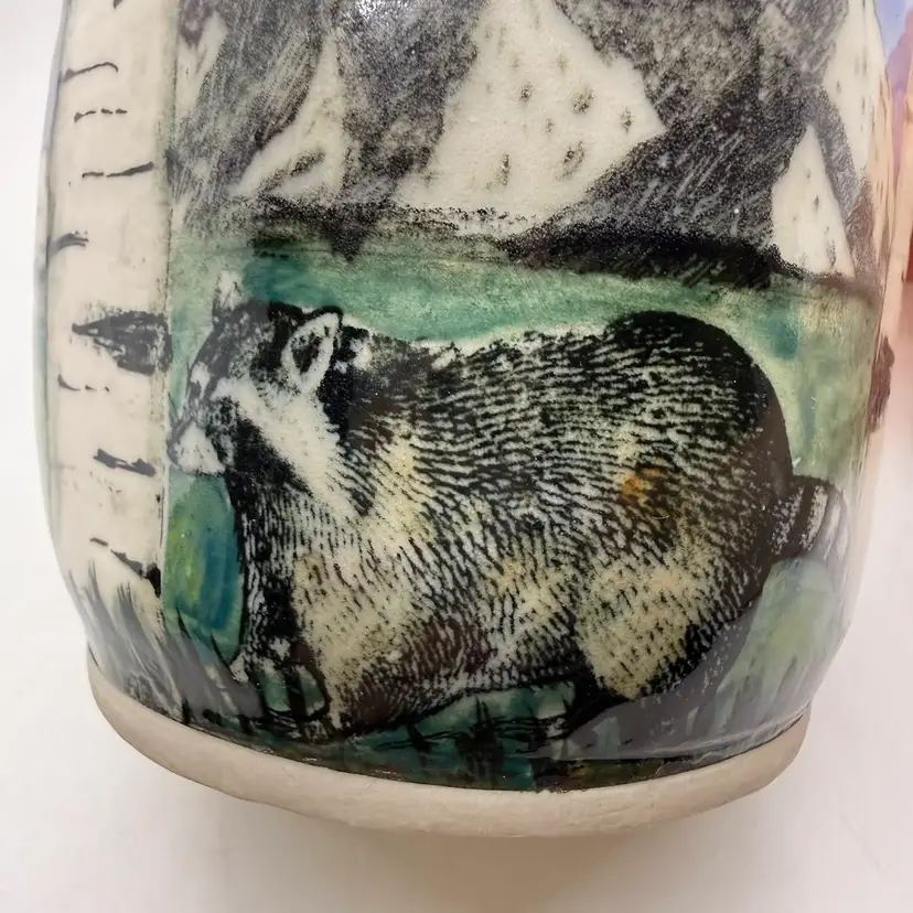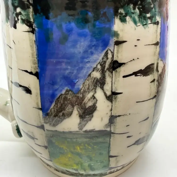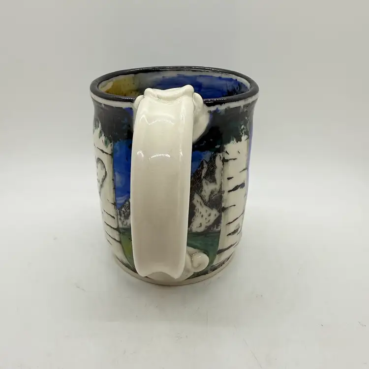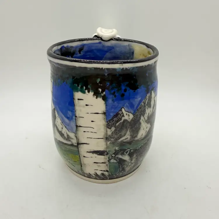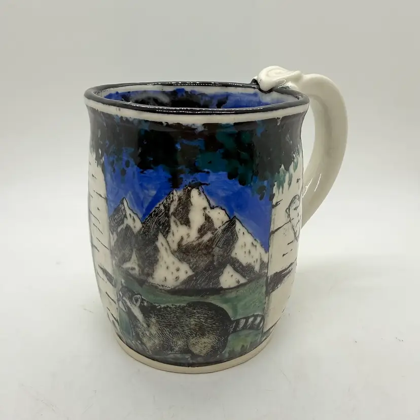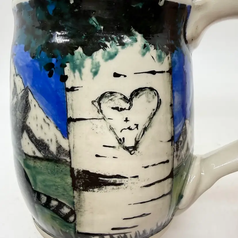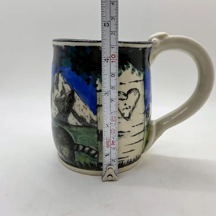 Melony Sawyer Studio Art Pottery Large Mug Forest Mountain Scene with Raccoon & Aspen Trees. No chips or cracks. Signs of light wear and use. Some crazing to the glaze, primarily on the inside.