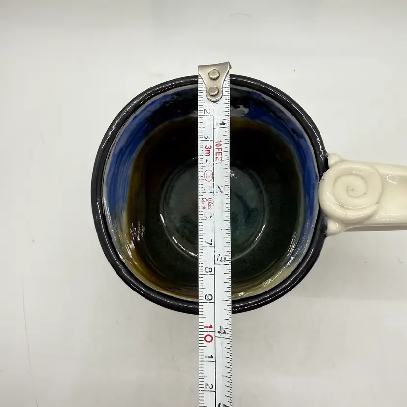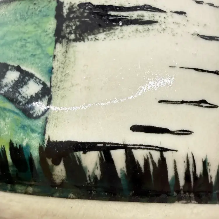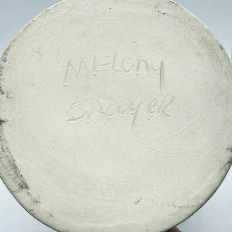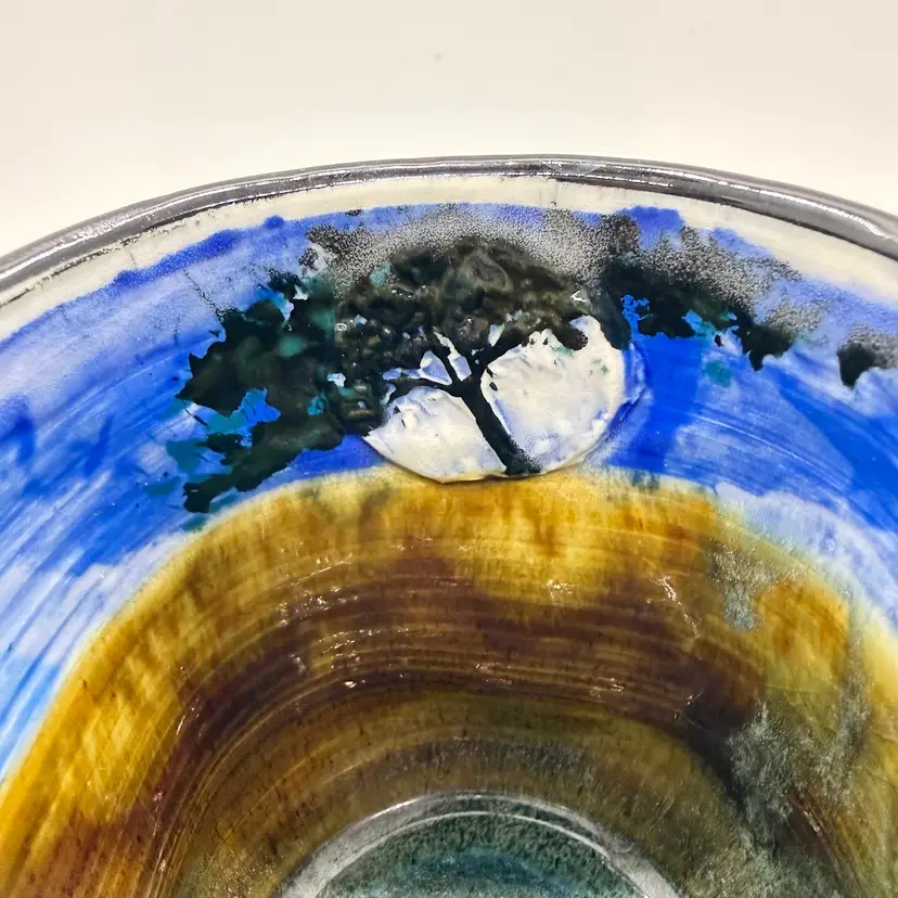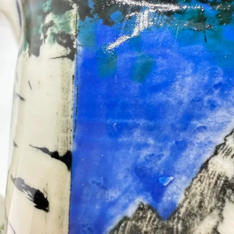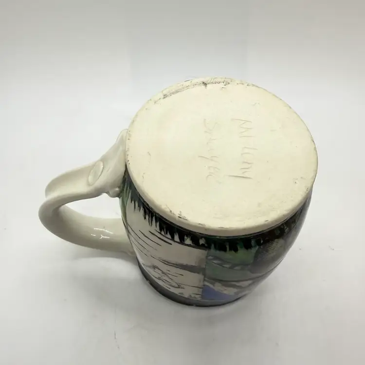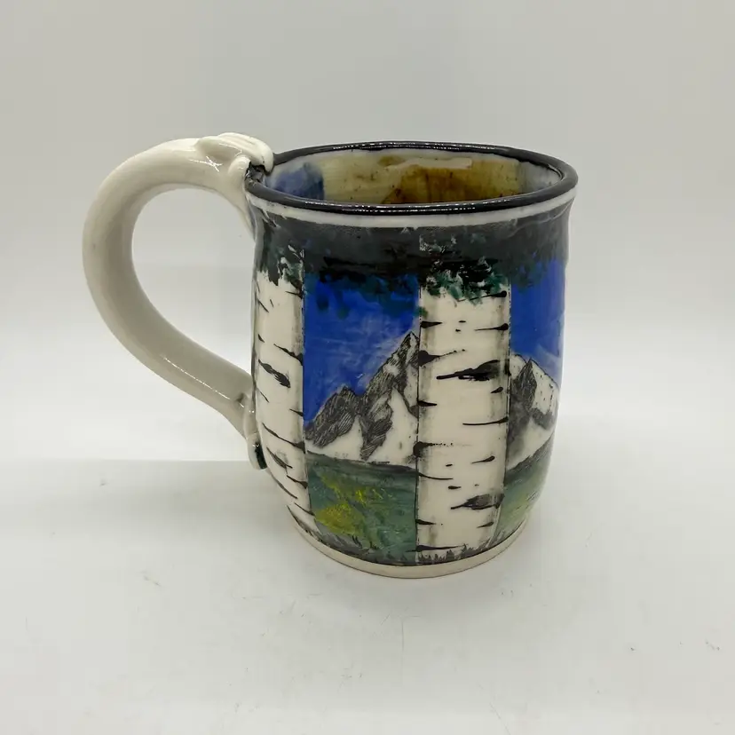 Melony Sawyer Studio Art Pottery Large Mug Forest Mountain Scene with Raccoon & Aspen Trees. No chips or cracks. Signs of light wear and use. Some crazing to the glaze, primarily on the inside.