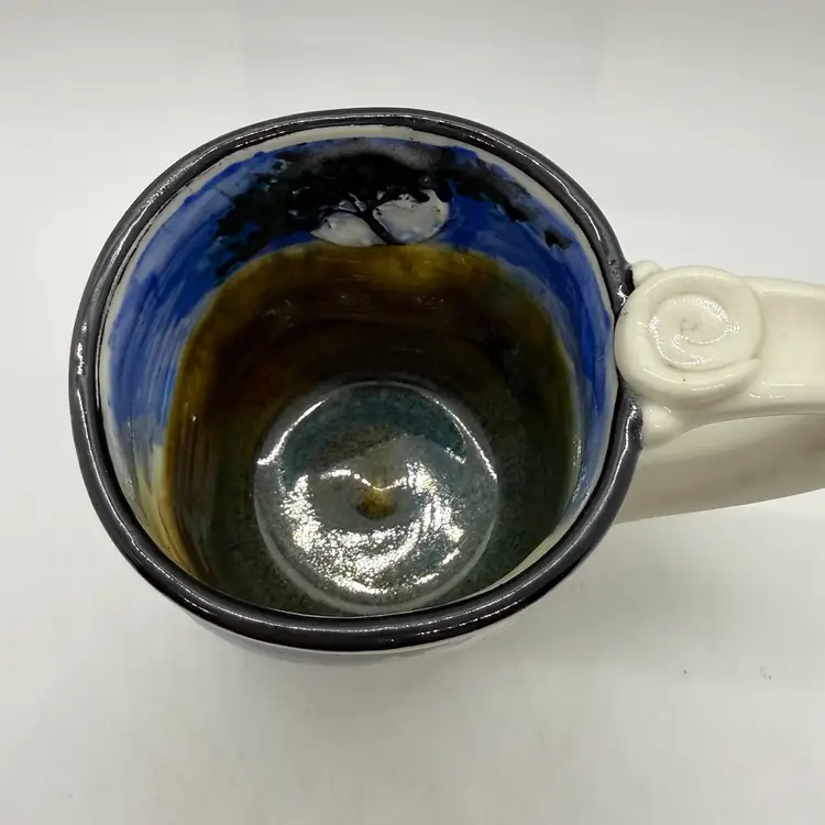 Keywords: coffee, tea, cup, ceramic, clay, stoneware, cabin, cottage, cottagecore, country, camping, hunting, wildlife, moon, trees, handmade, hand painted, Colorado artist, signed, marked, breakfast, kitchen, home, gift, present