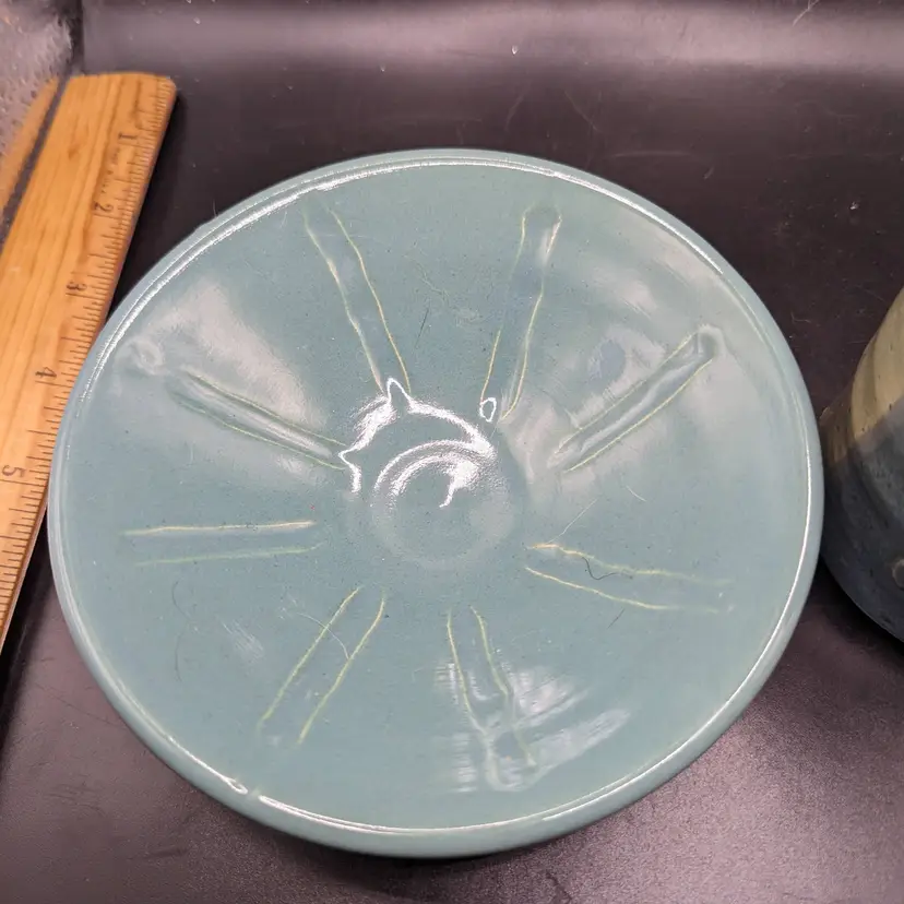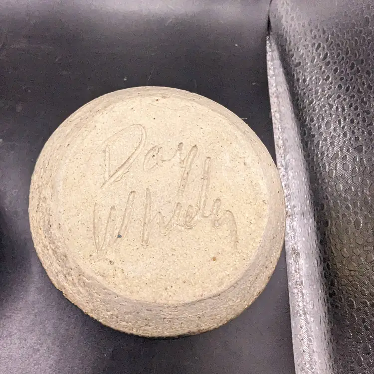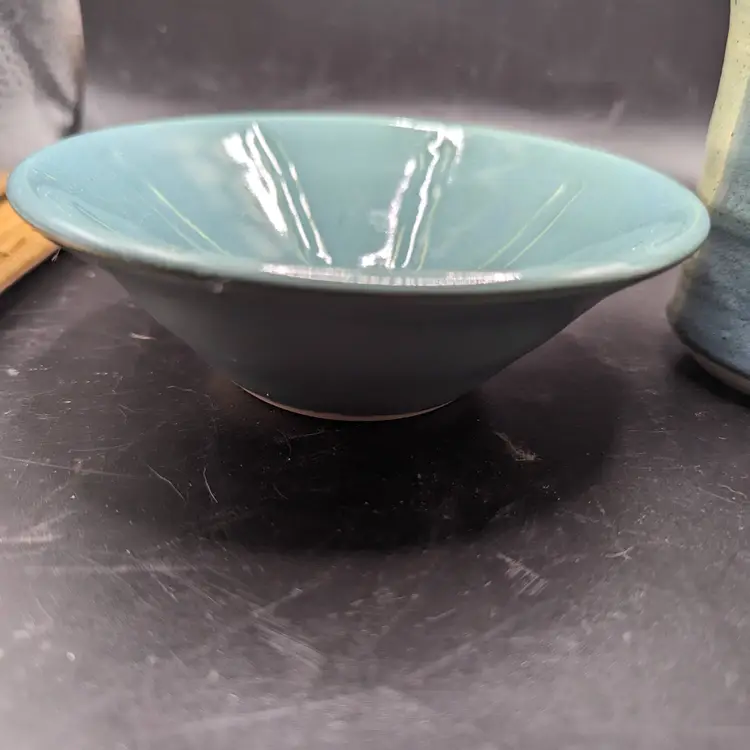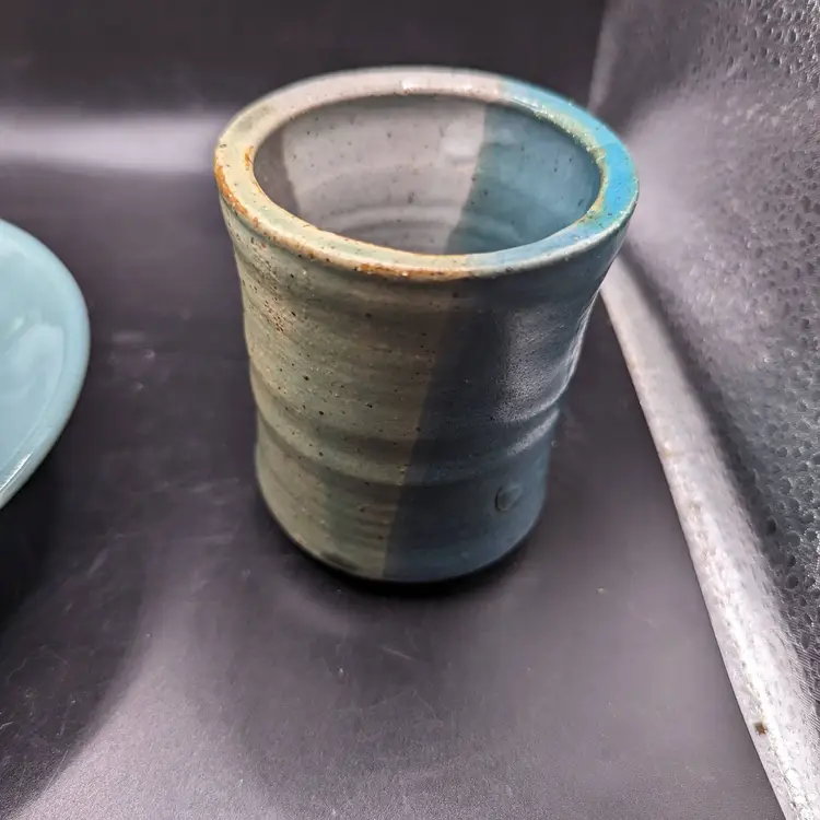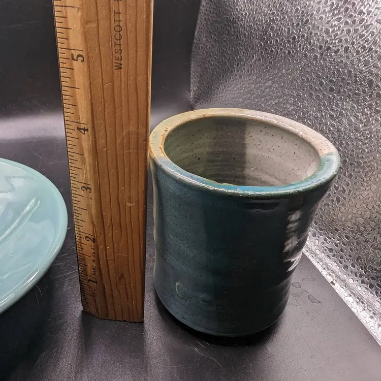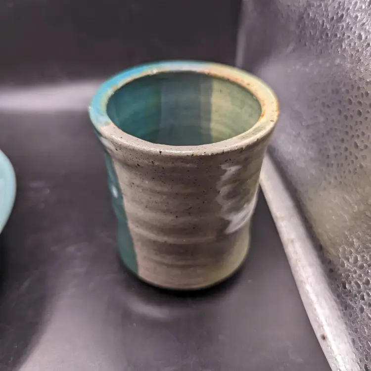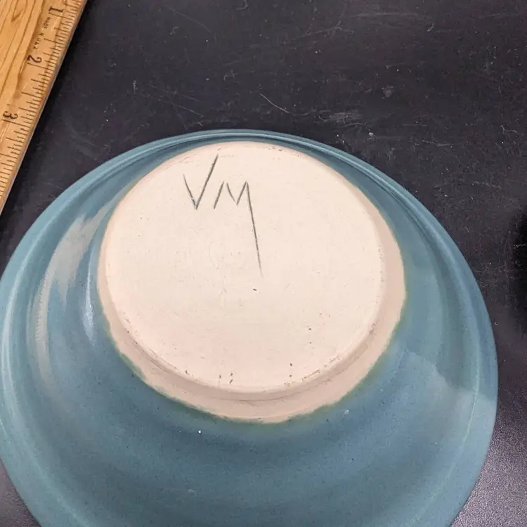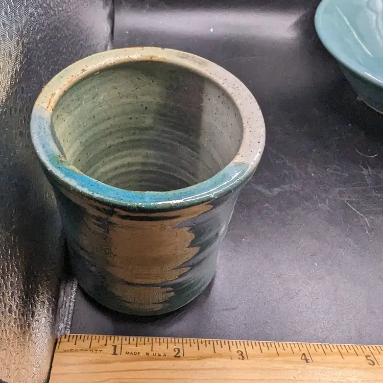 This is a lovely Studio Art Pottery Lot of 2 Cup by Day Whilz and Bowl Signed VM. The coloring of both looks like they could be a matching set. No chips or cracks. Please see all pictures for condition and measurements.