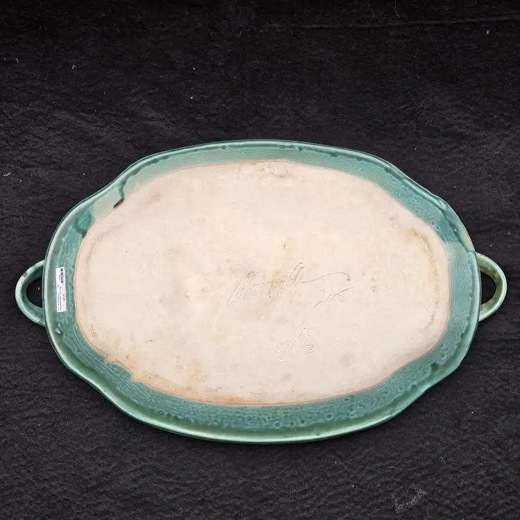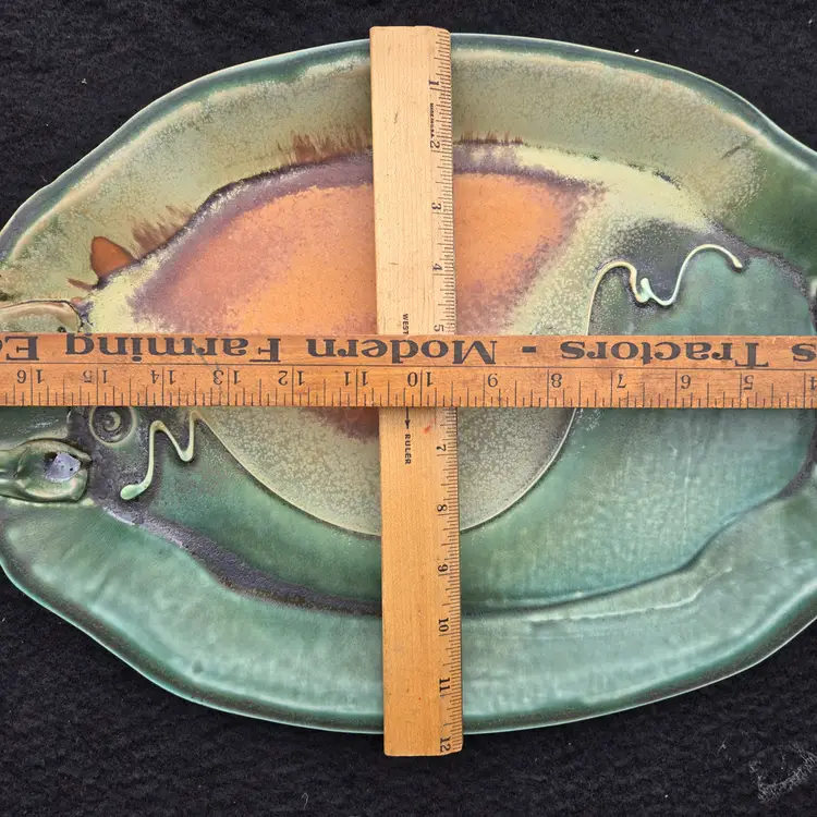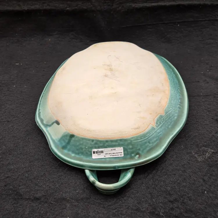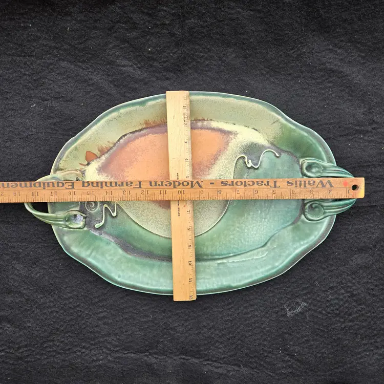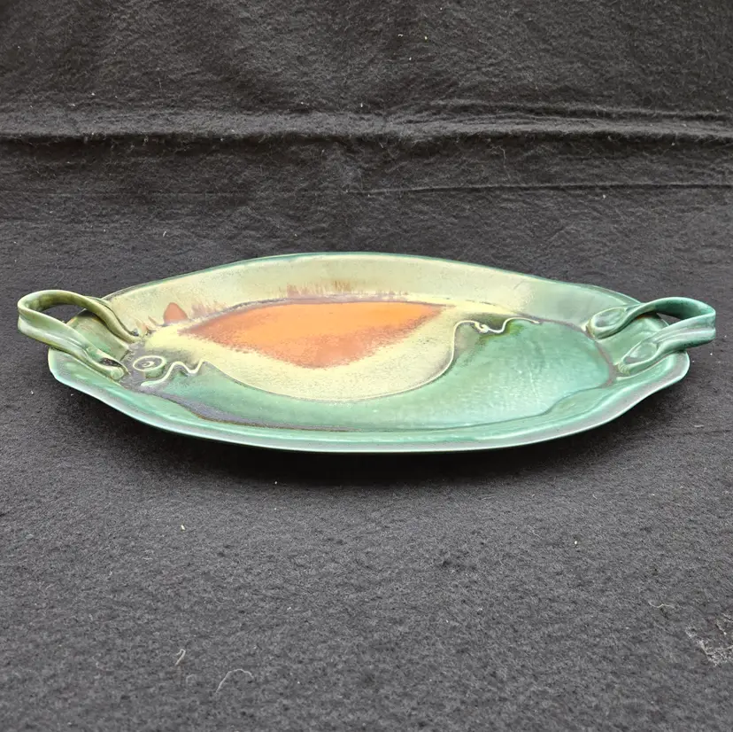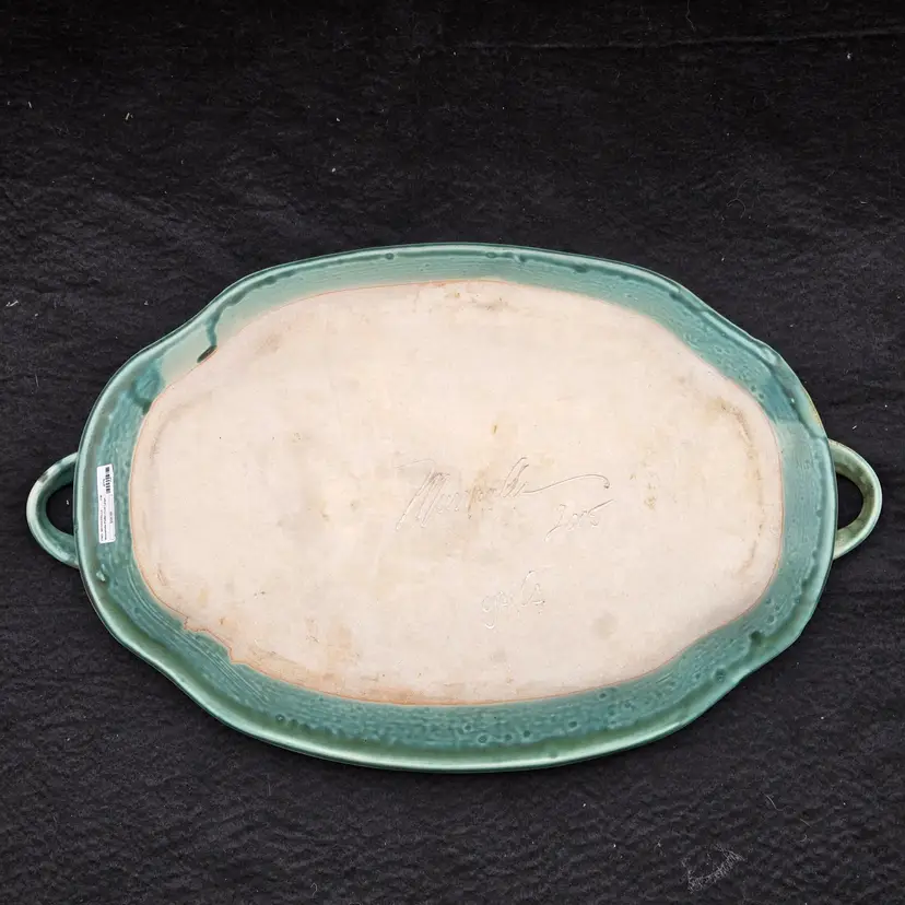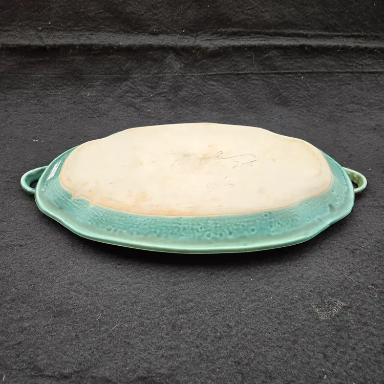 Studio Art Pottery MASSARELLA, Frank Serving Tray 18⅝" × 11¾" Ojai CA with Condition Issues. Used condition with one chip in one of the handles, dirt and stains from use. Please view all the photos and please ask any questions prior to purchase when possible. NOTE: color rendition may differ between the photos and the item you will receive due to lighting conditions.
