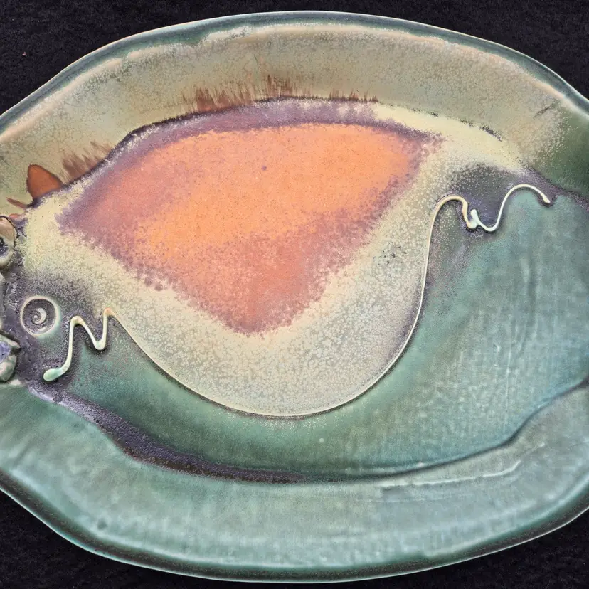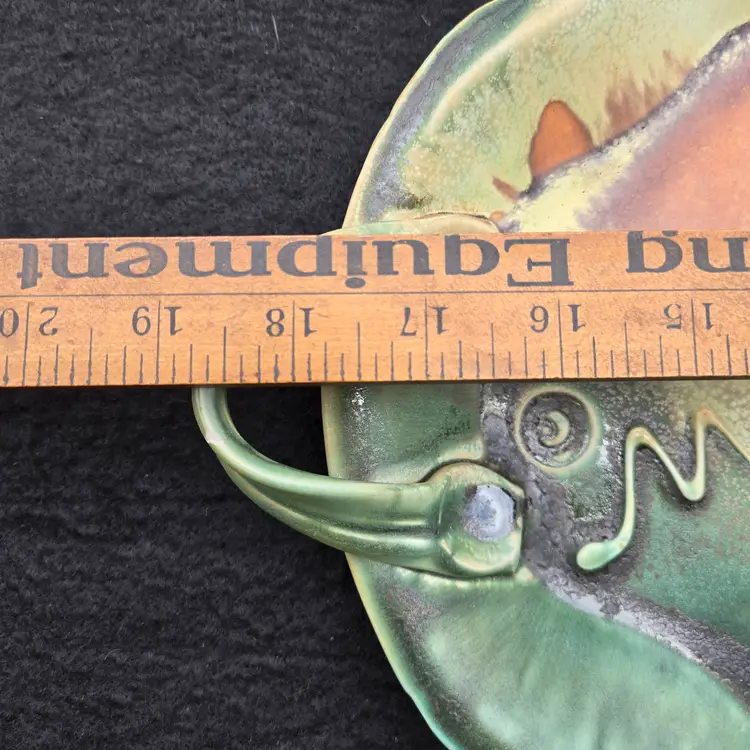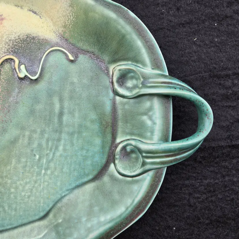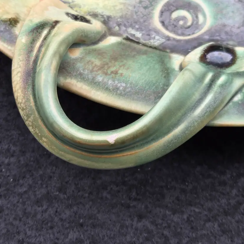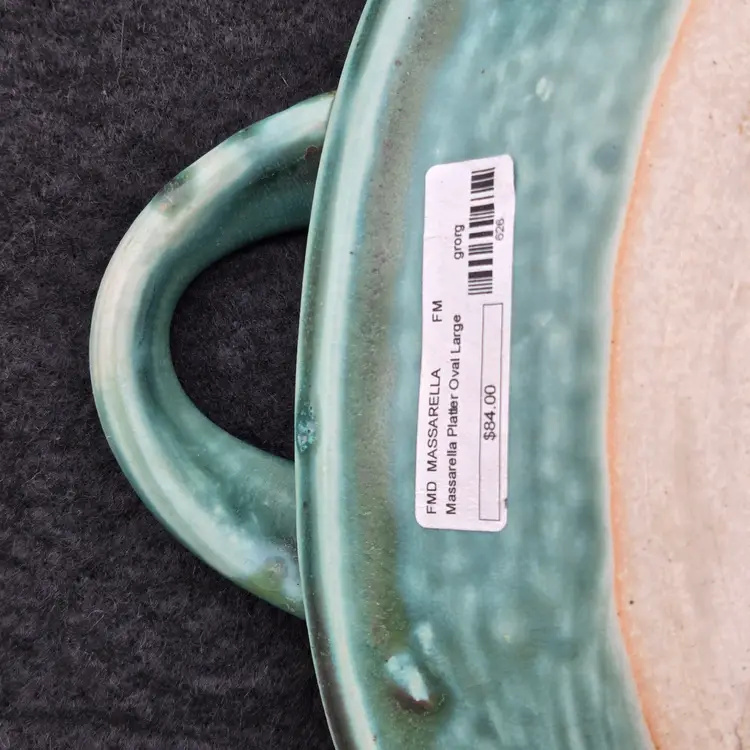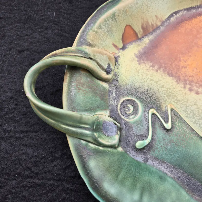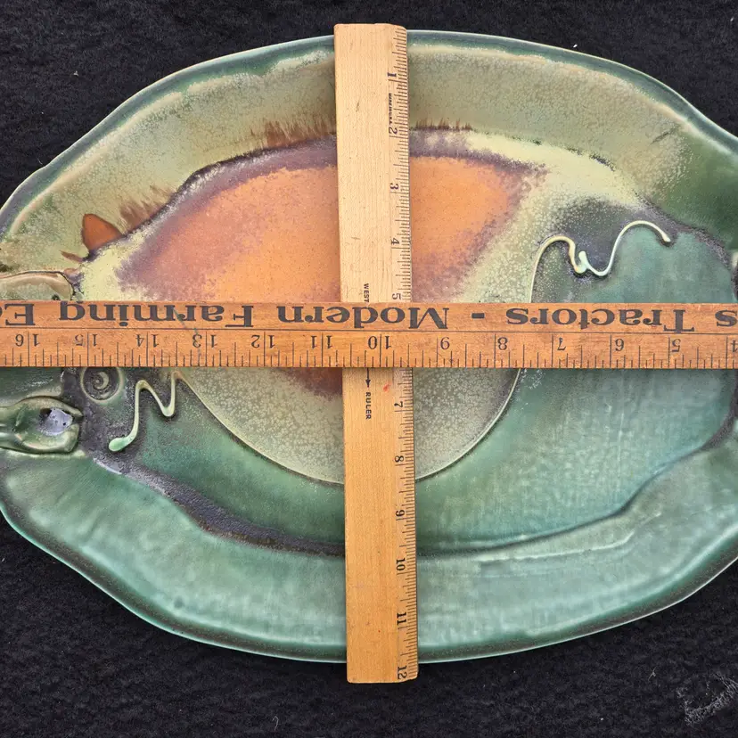 Studio Art Pottery MASSARELLA, Frank Serving Tray 18⅝" × 11¾" Ojai CA with Condition Issues. Used condition with one chip in one of the handles, dirt and stains from use. Please view all the photos and please ask any questions prior to purchase when possible. NOTE: color rendition may differ between the photos and the item you will receive due to lighting conditions.