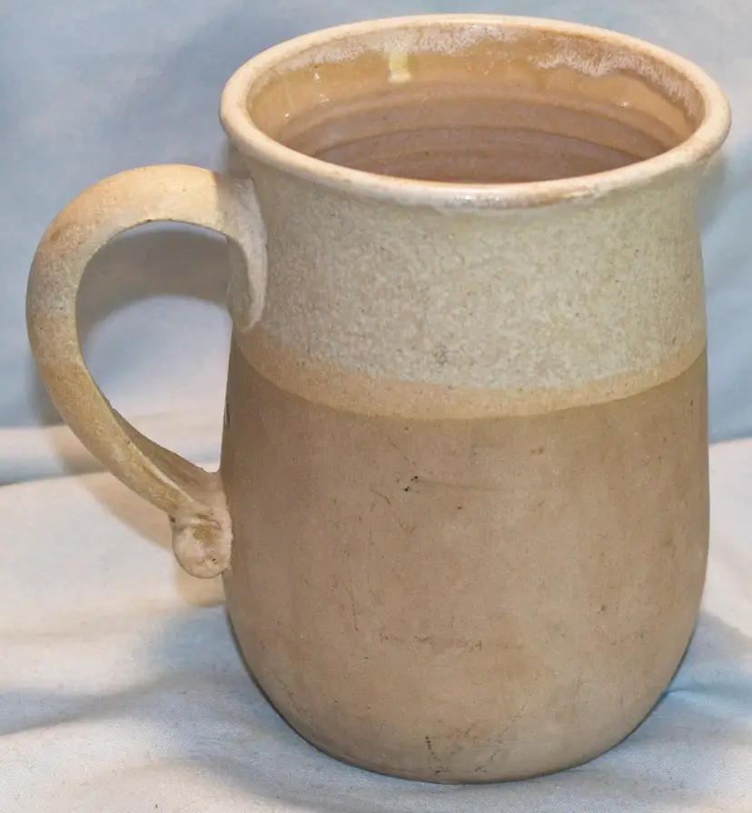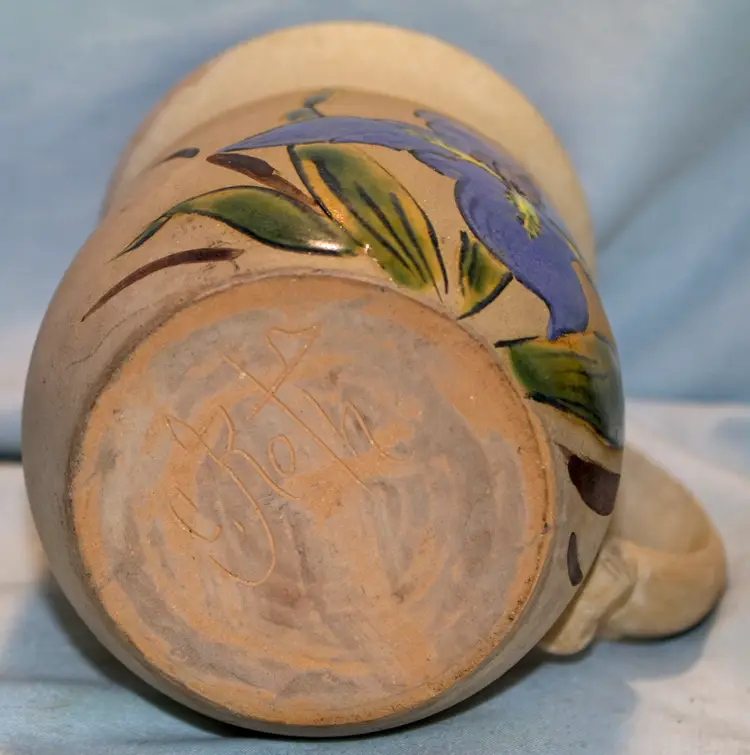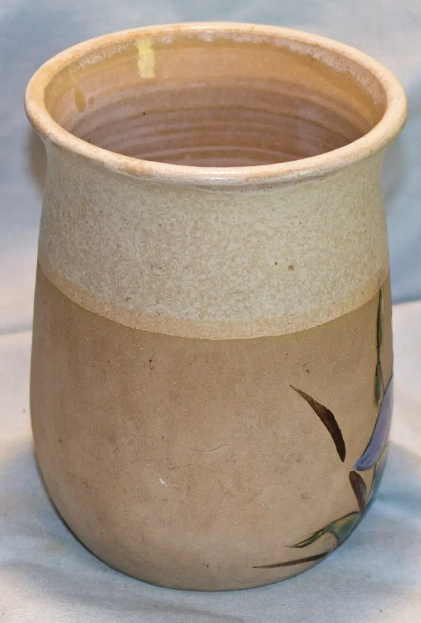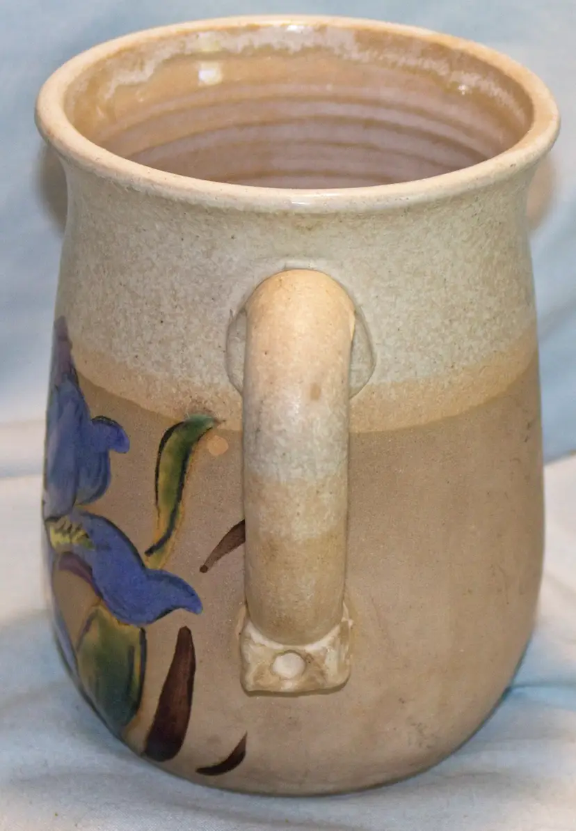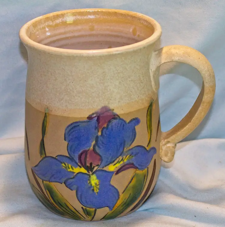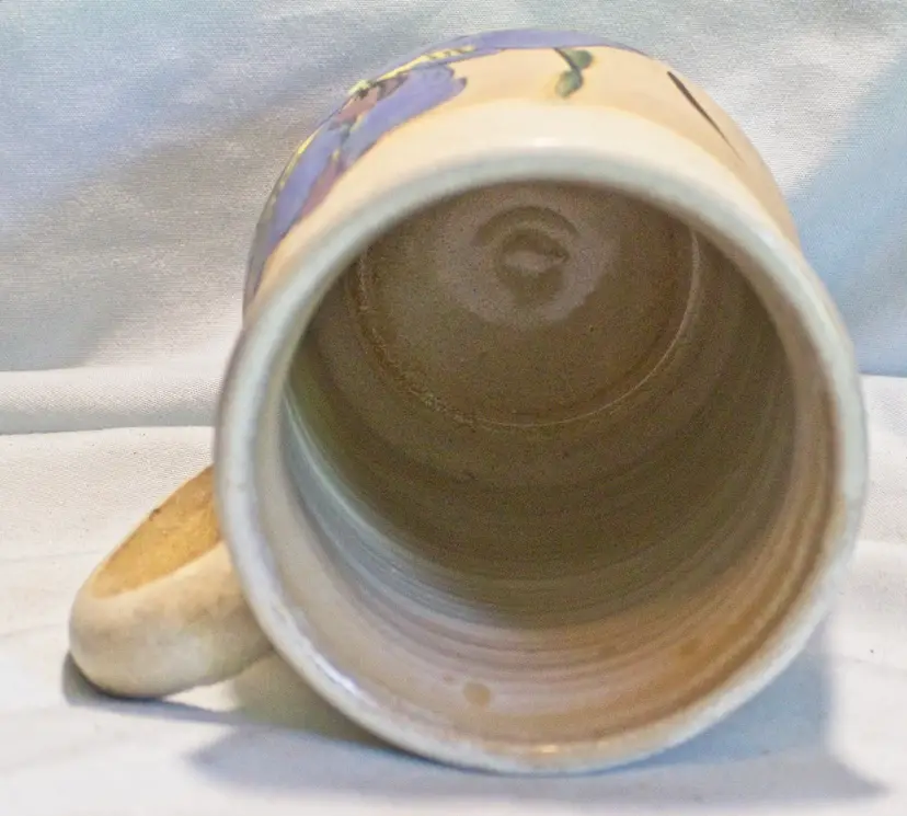 Studio Art Pottery Mug Purple Iris 16 Ounce Signed. In good condition. Holds 16 ounces. 5" wide x 3.5" deep x 5" tall
