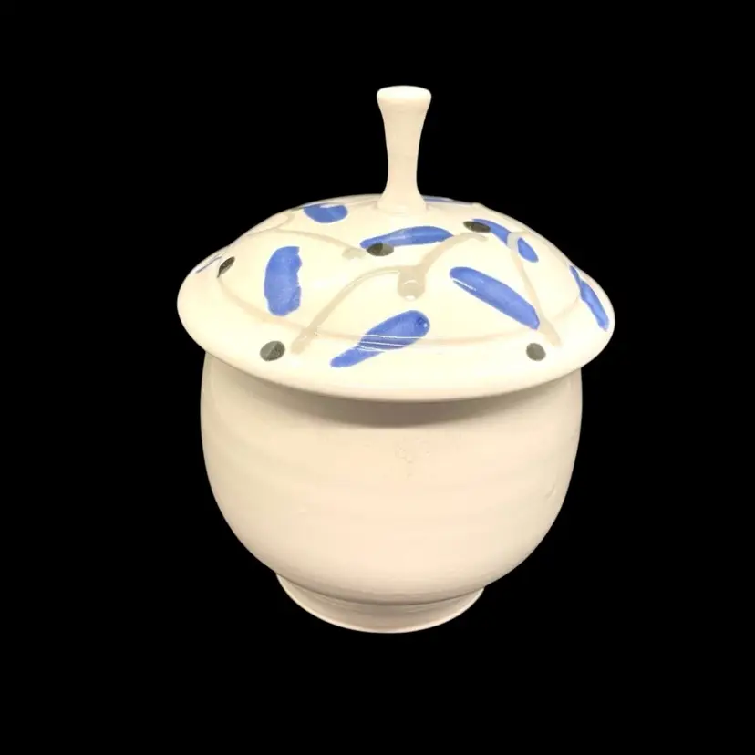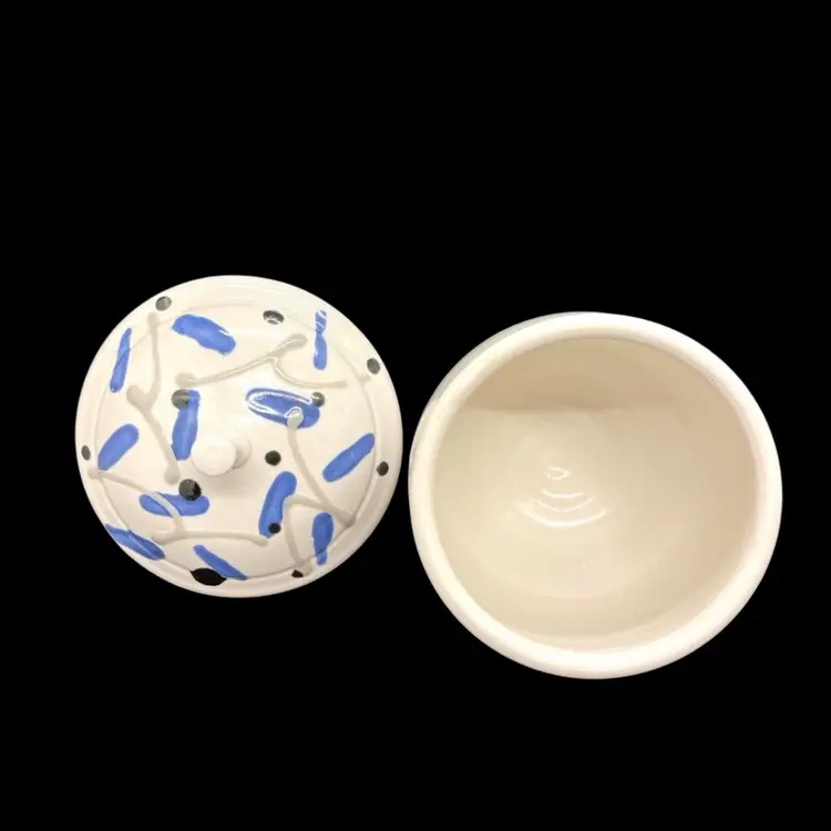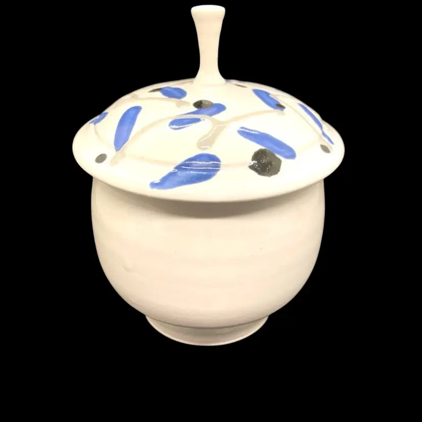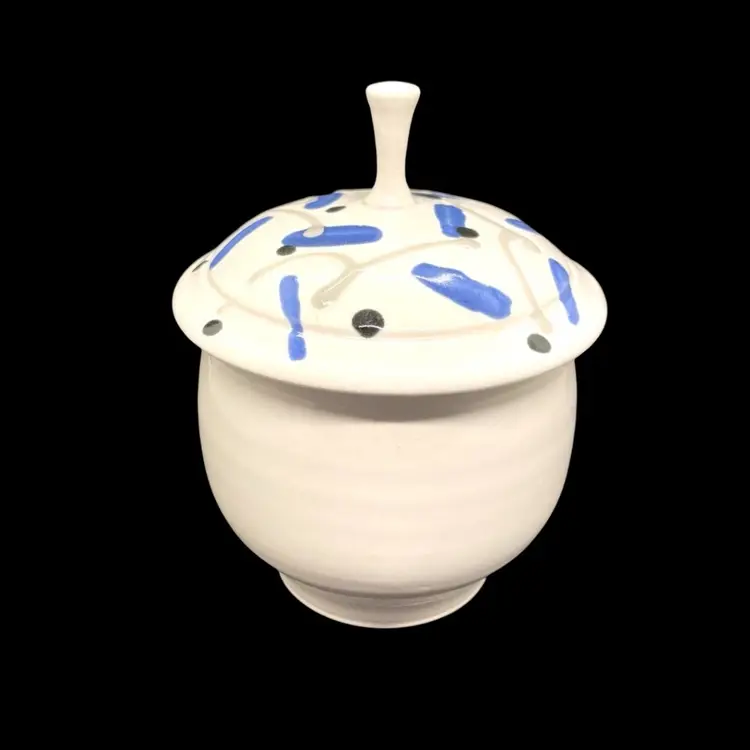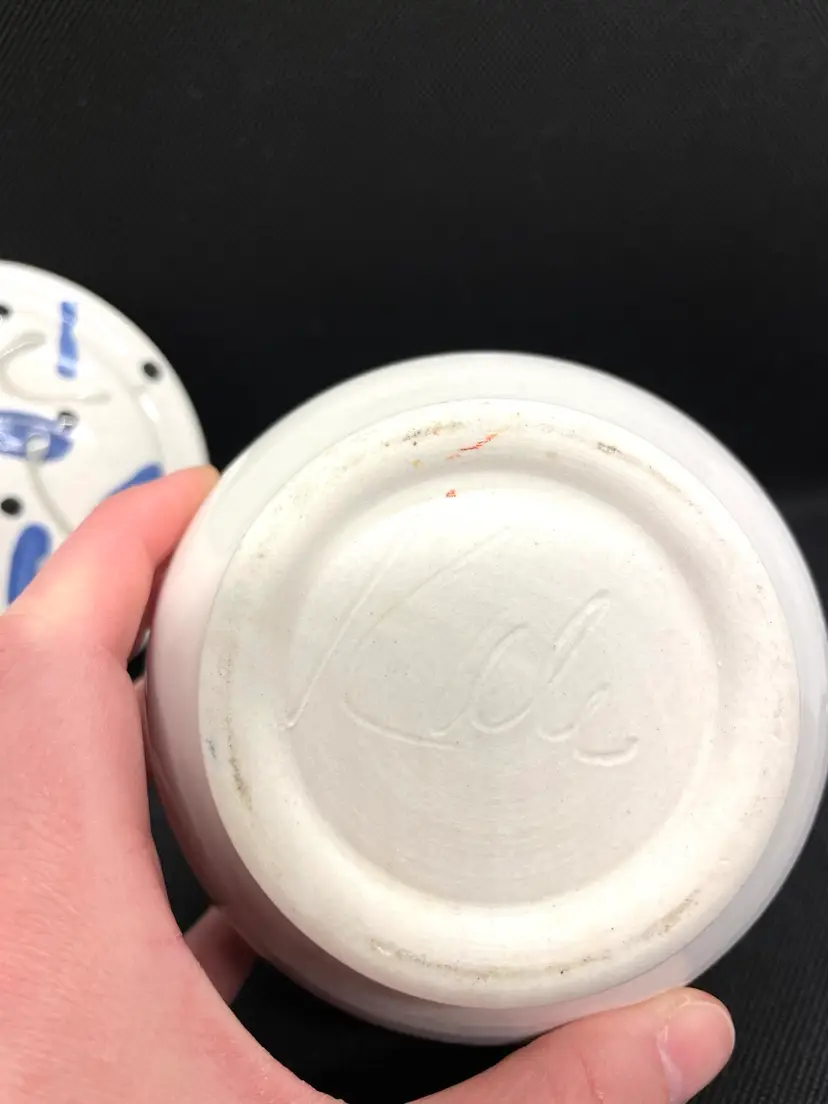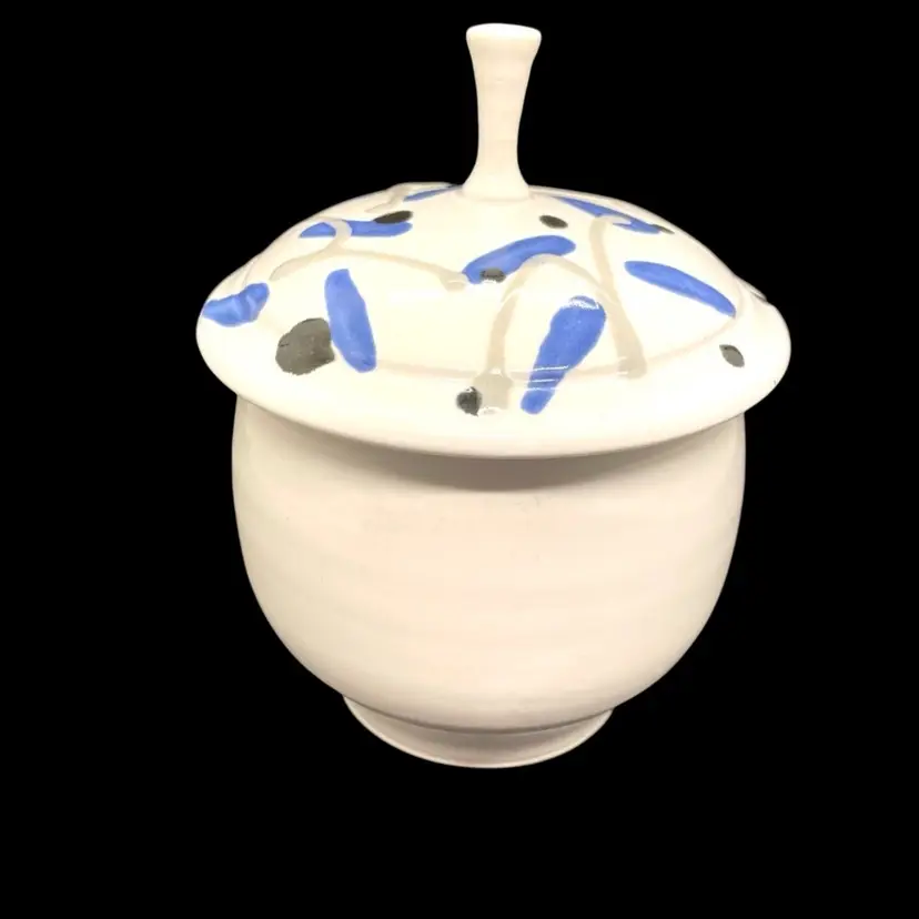 Nicely made studio pottery covered dish/sugar bowl. Signed on bottom, possibly Kule, or Kale? In very good condition, no chips or cracks.