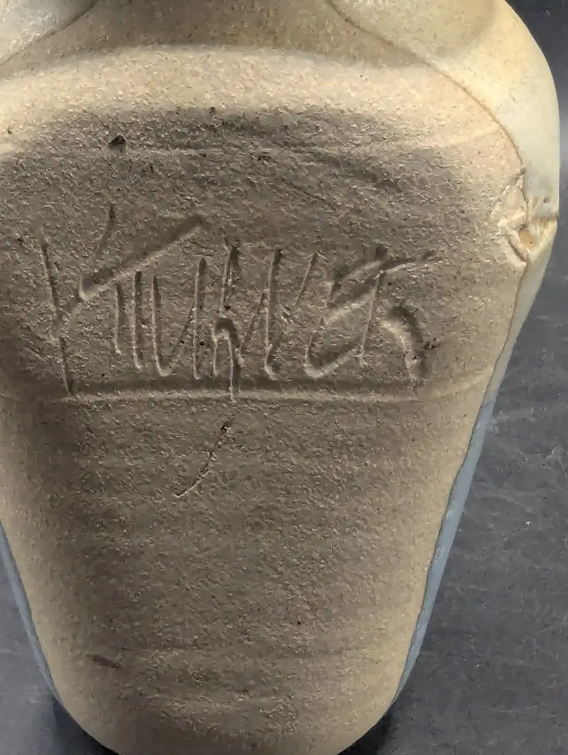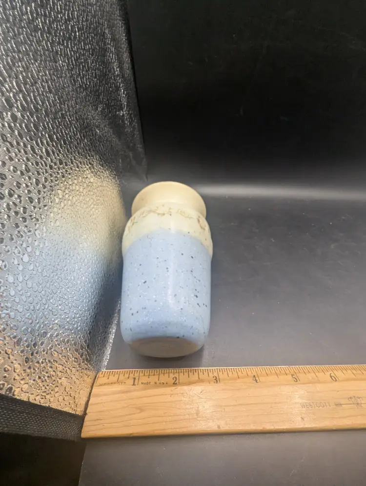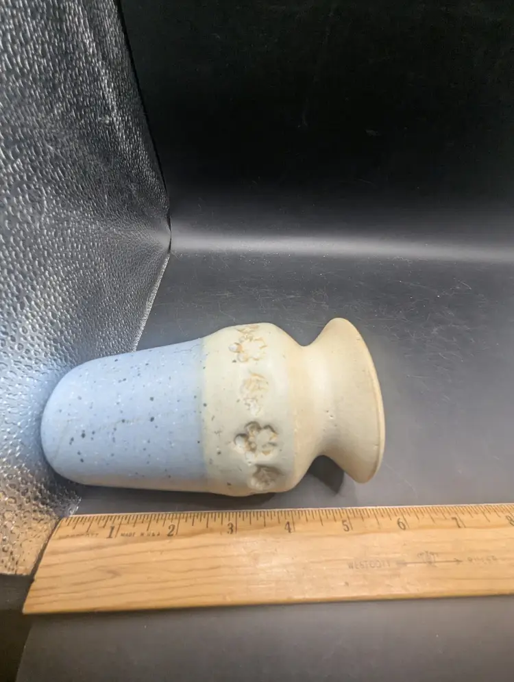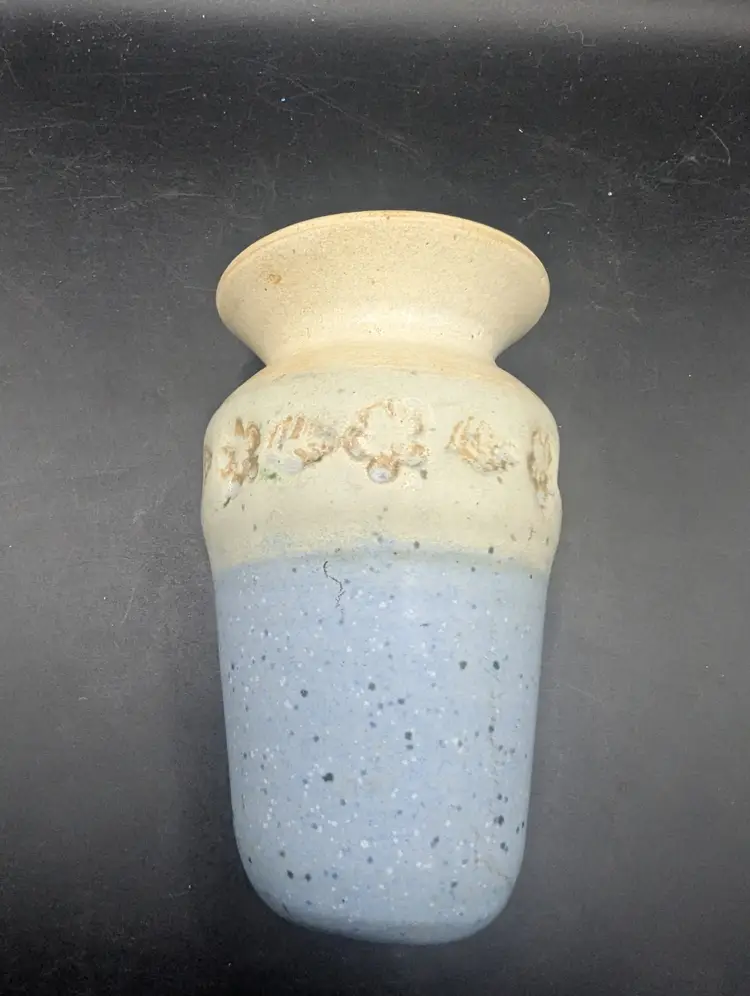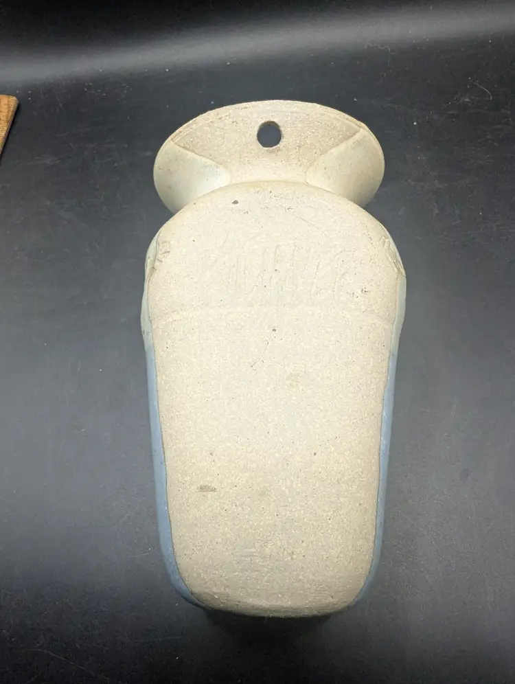 This is a lovely Studio Art Pottery Signed Unidentified Stoneware Wall Pocket Vase. It is done in blue and tan with floral imprints around the front. No chips or cracks. Please see all pictures for details and measurements.
