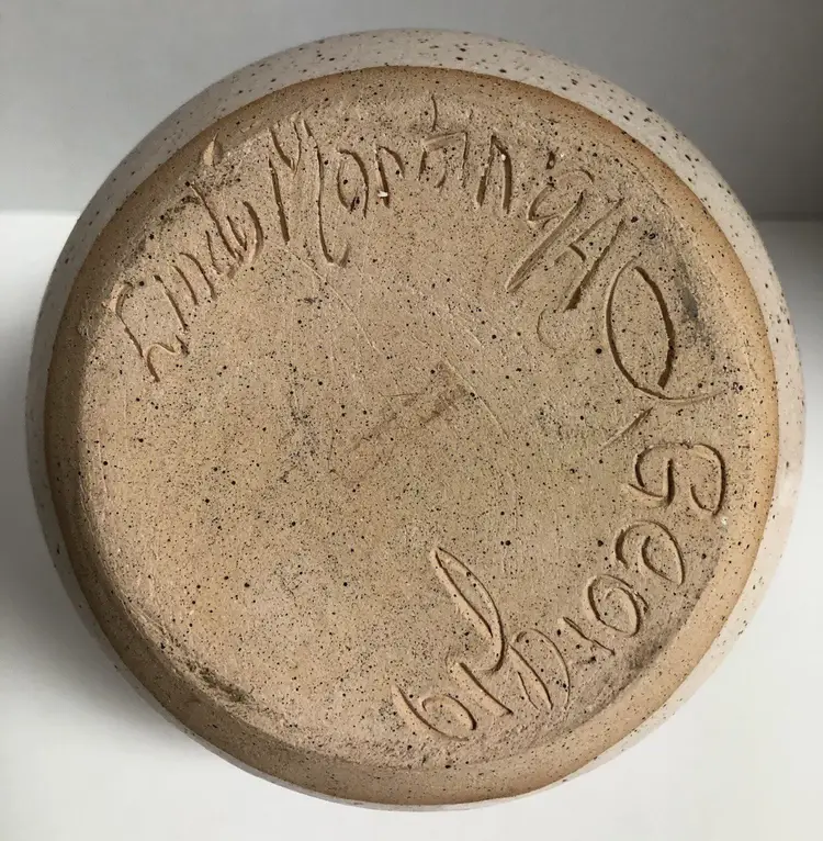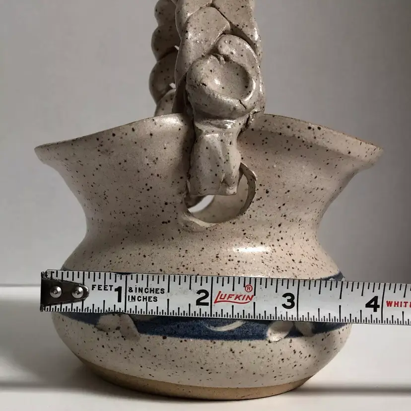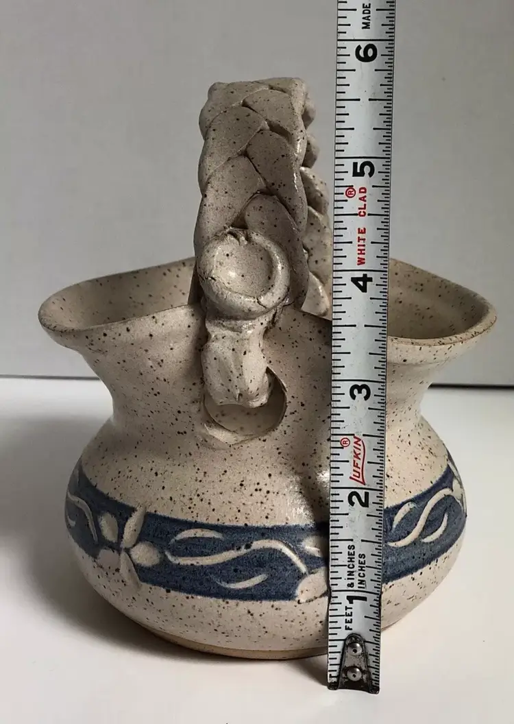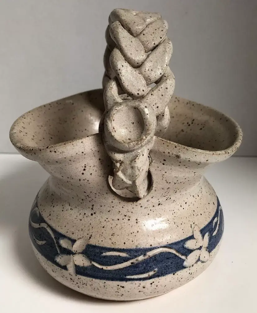 This is a beautiful piece with a braided handle and has a speckled glossy glazed finish. It is signed “Linda Martin 94’ Georgia” on the bottom and is very well made. There are no chips or cracks.
