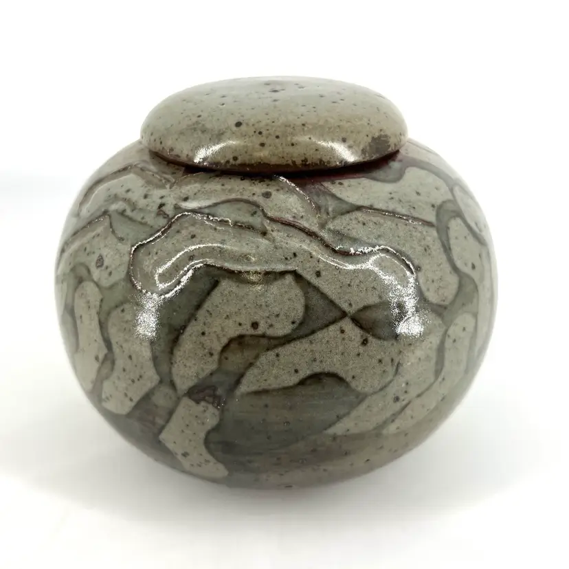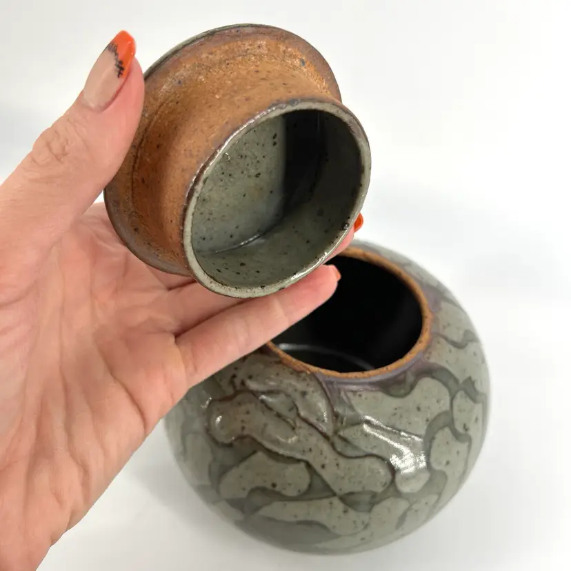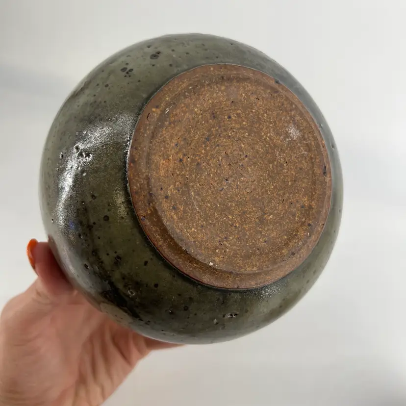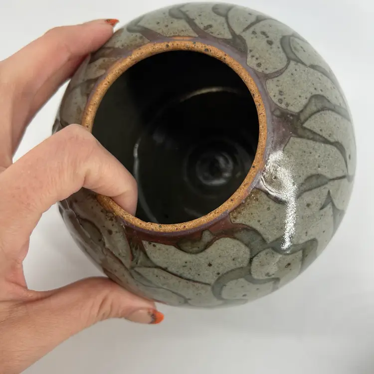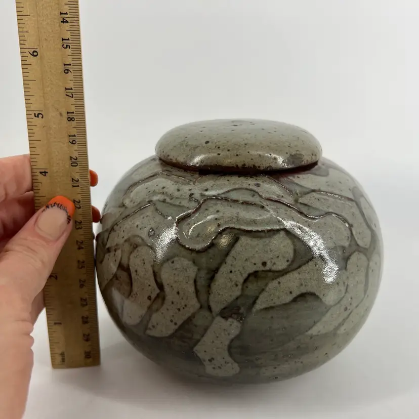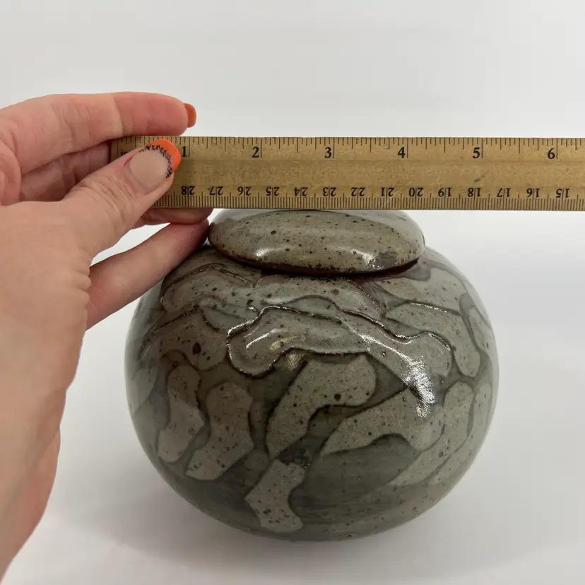 This jar is made from a speckled stoneware clay. It measures approx 5" tall and 5" wide. There are no chips or cracks. The bottom is signed.
