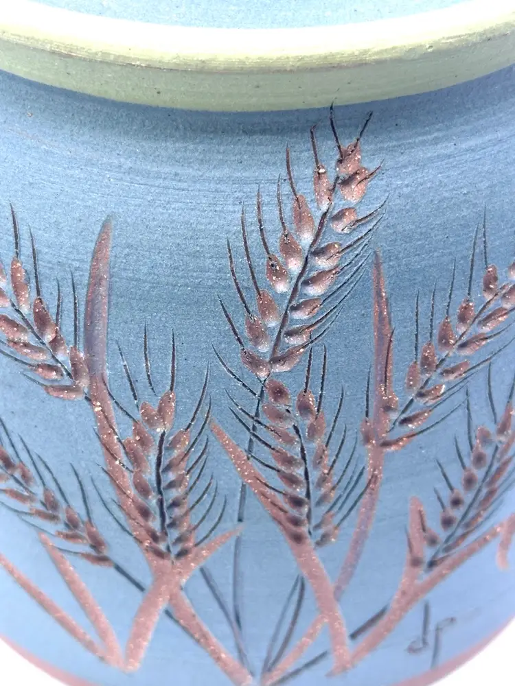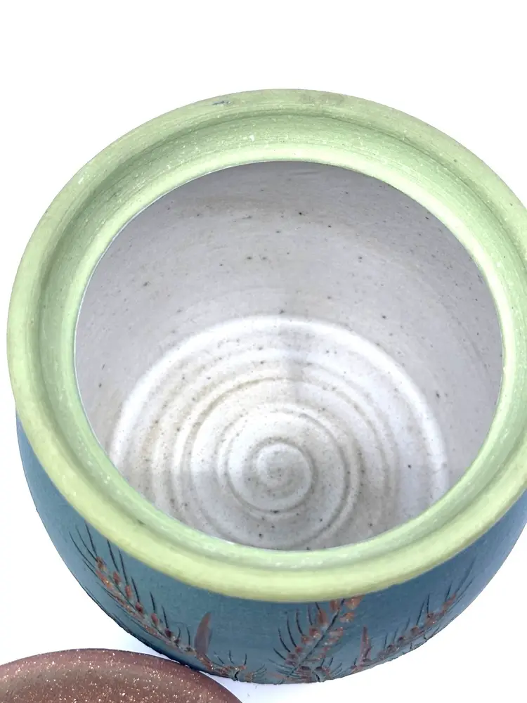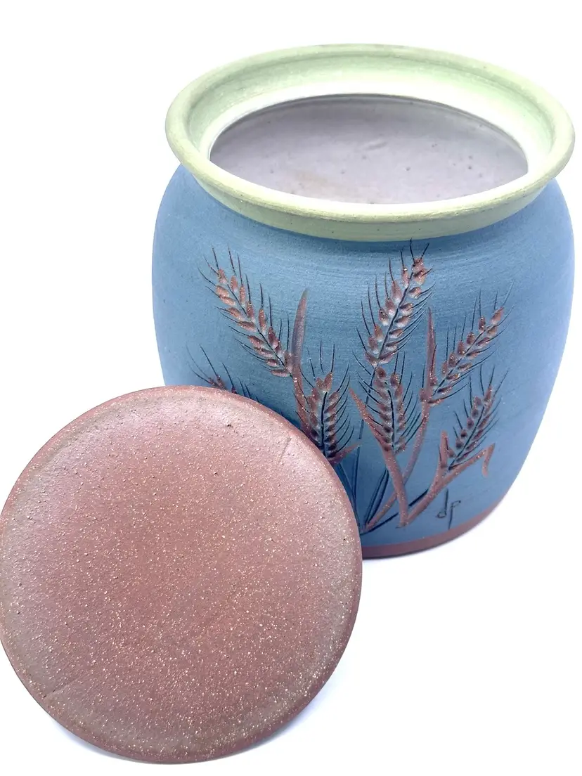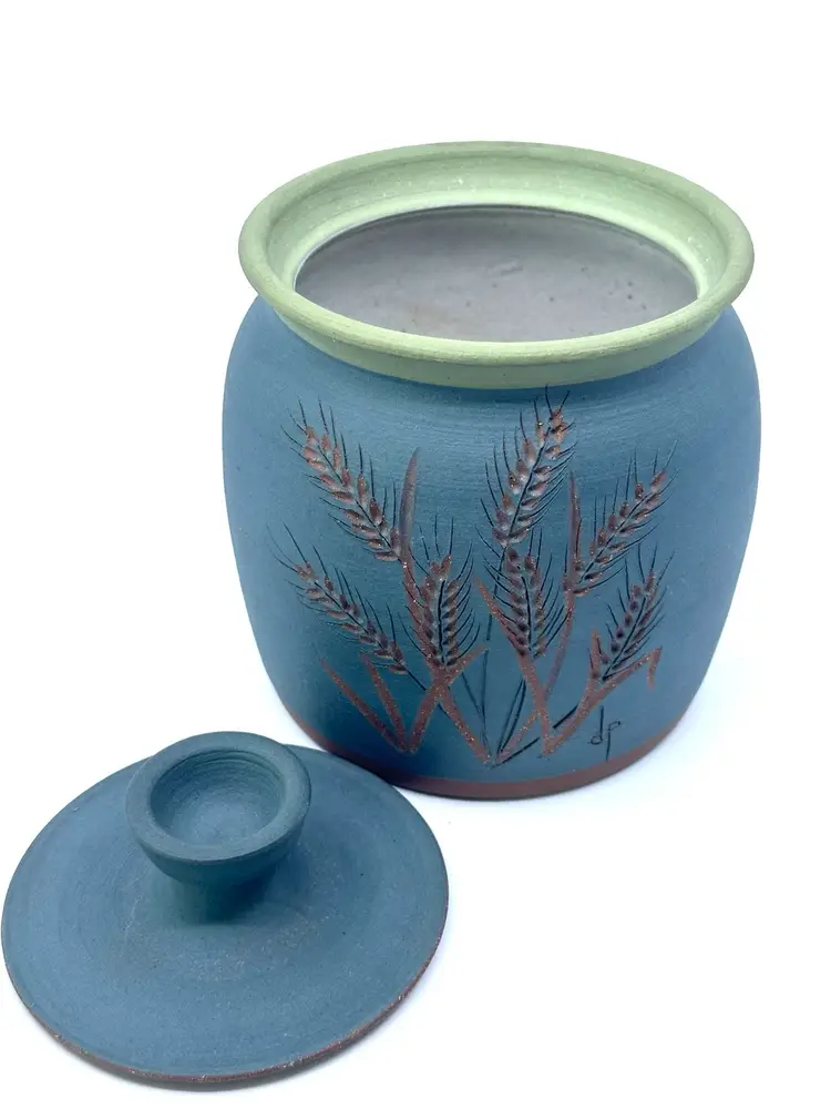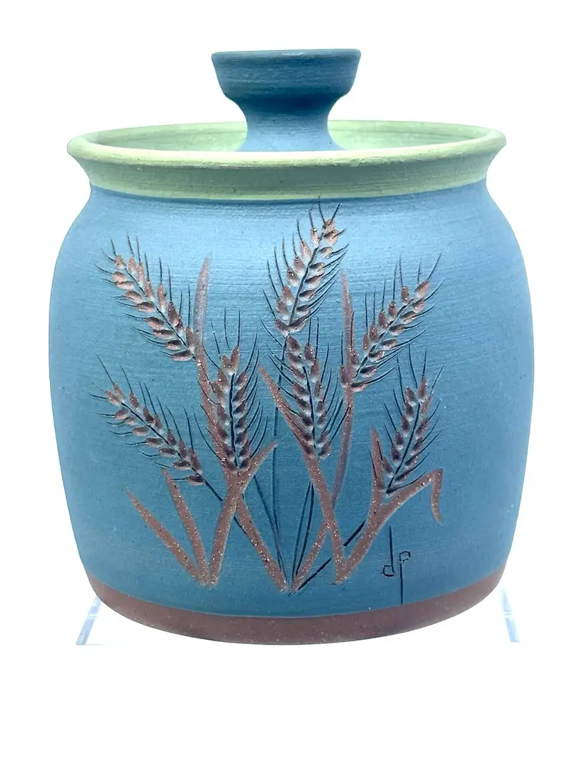 his beautiful jar from Studio brand is a one-of-a-kind piece of art pottery. Made of stoneware material, it features a unique size of 5.5” by 7” by 5.5”. The jar comes with a lid and has a vintage touch to it, making it a great addition to any collection.