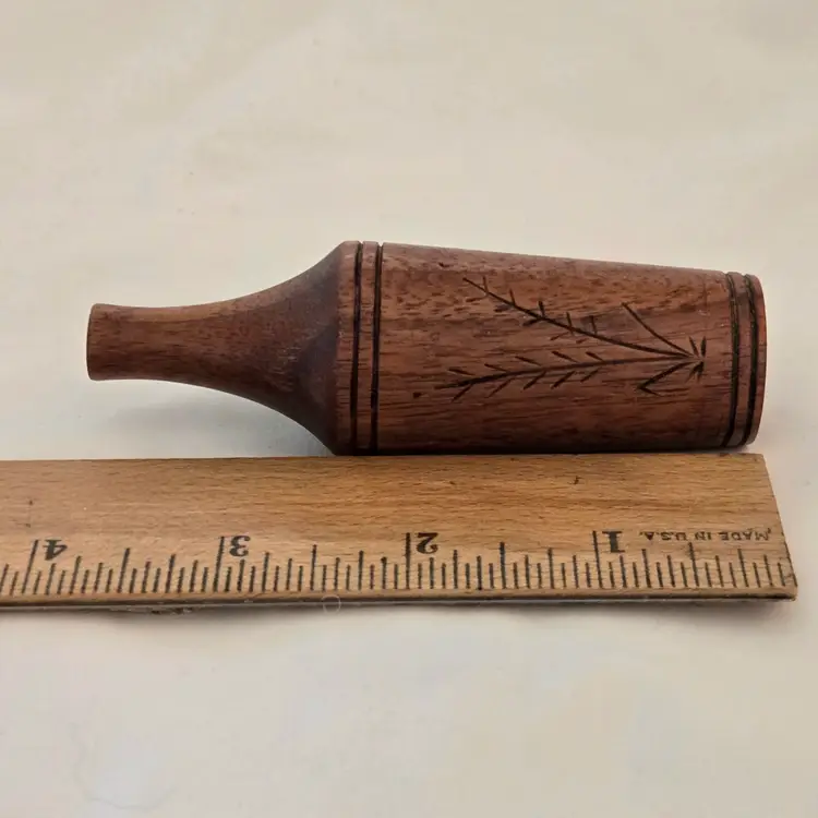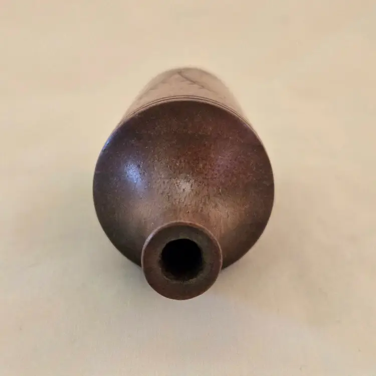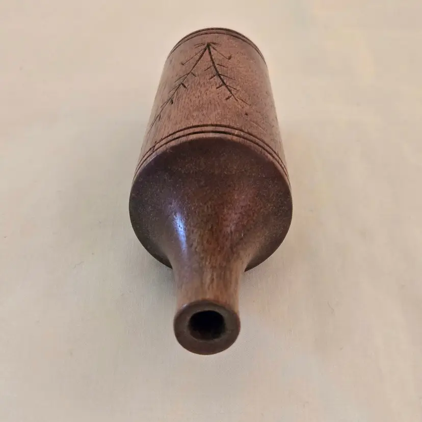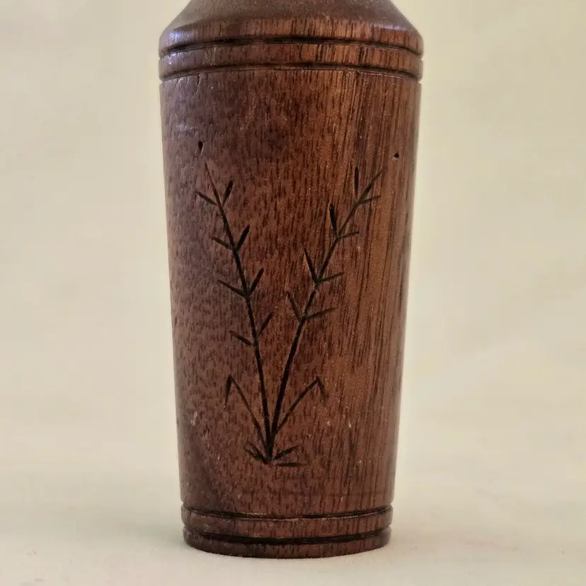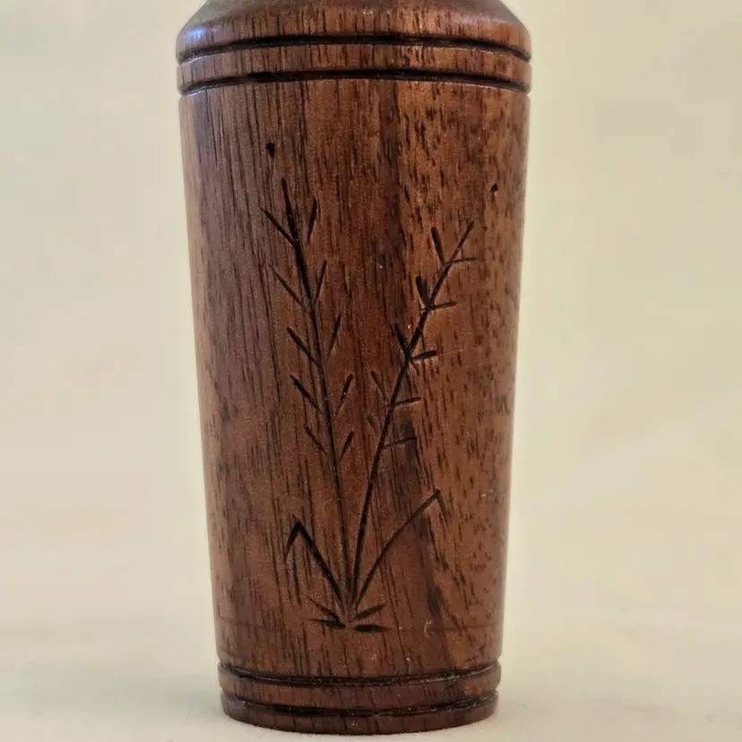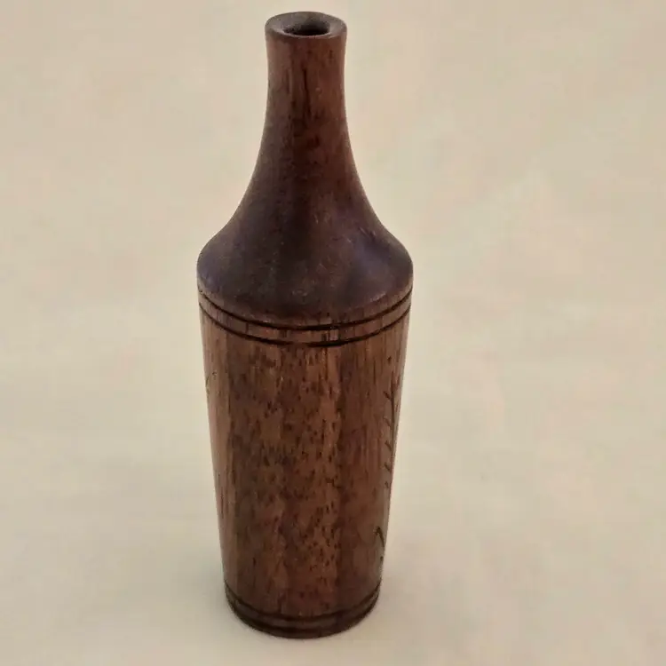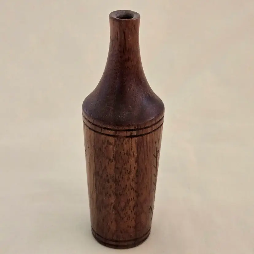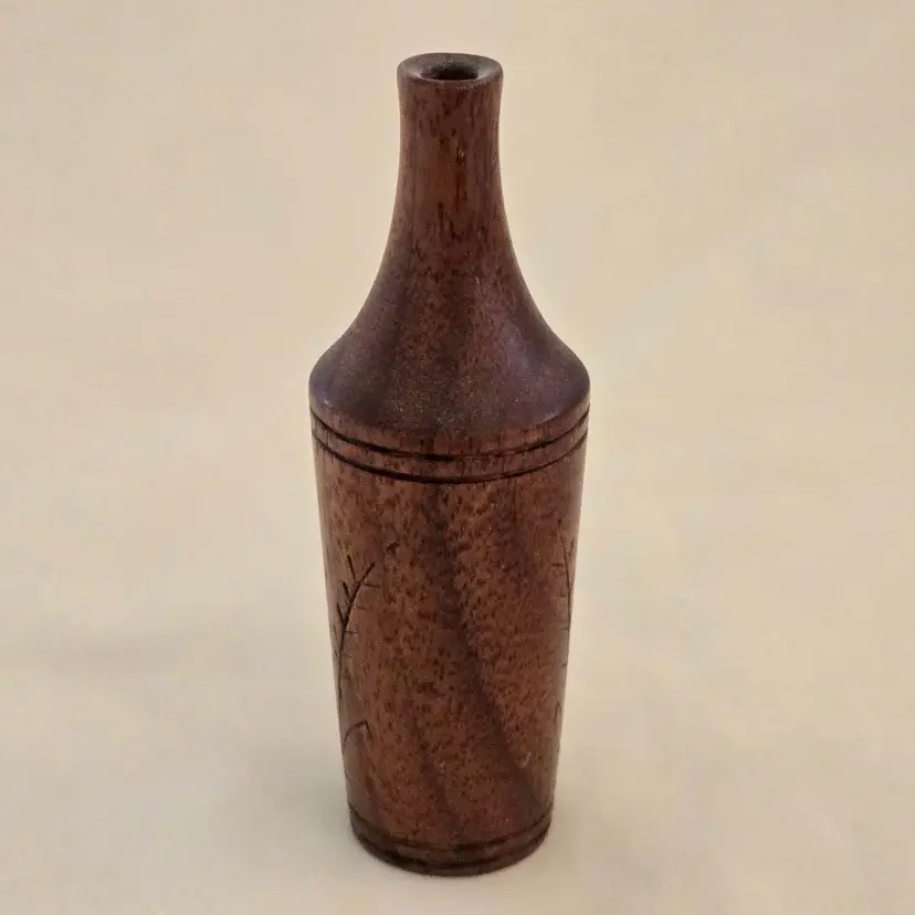 Studio Art Vase Handcarved Wood 4" Tall Thin Initialed Unbranded with Carvings Vintage. Used condition with typical signs of use. Please view all the photos and please ask any questions prior to purchase when possible.