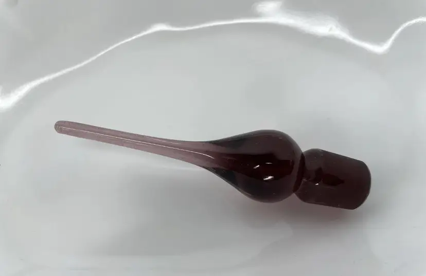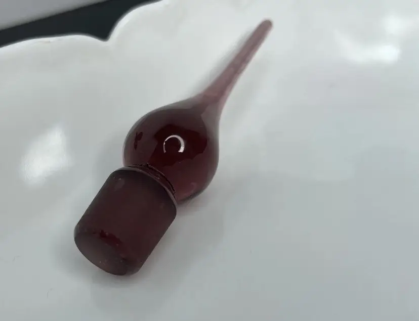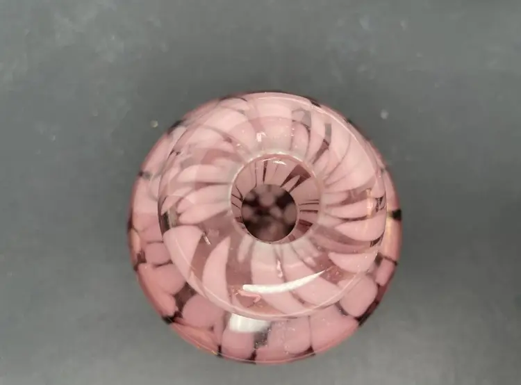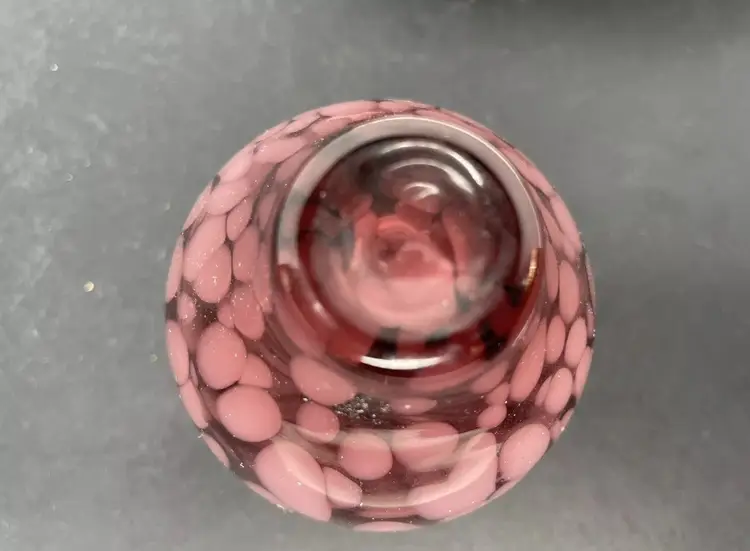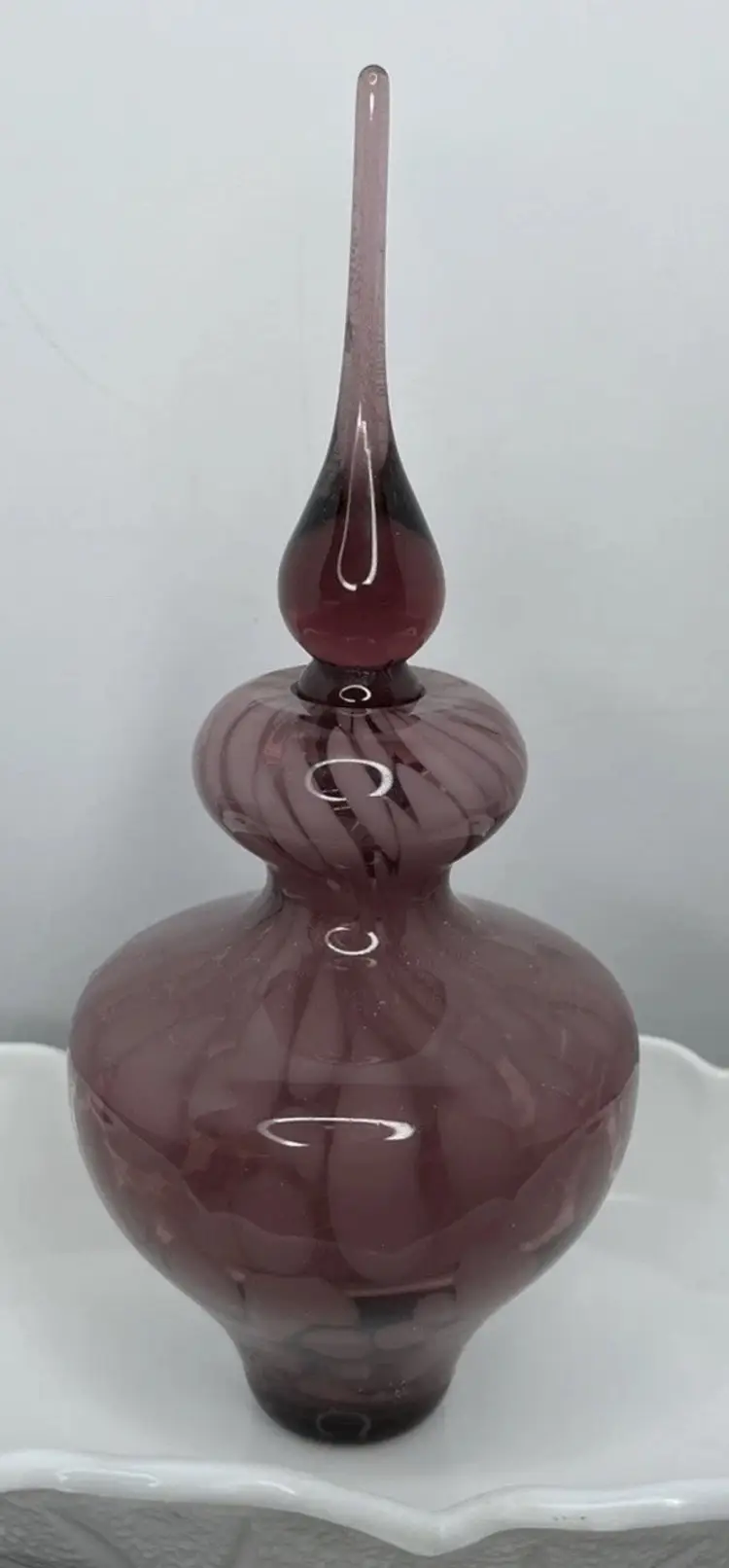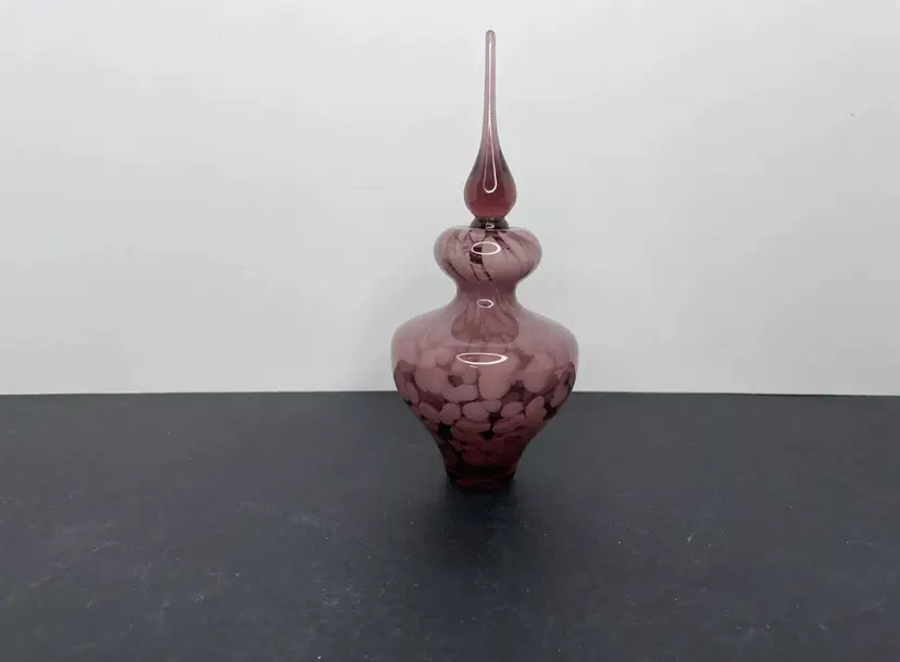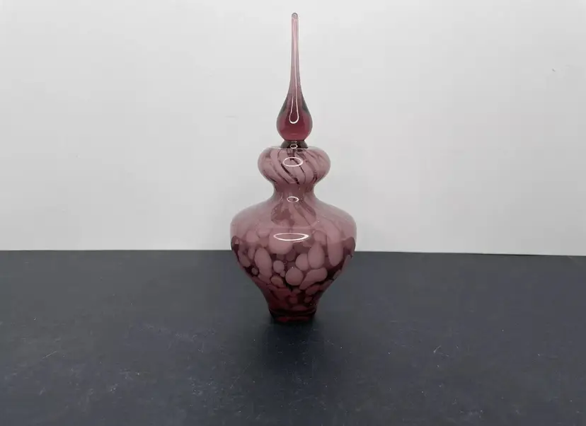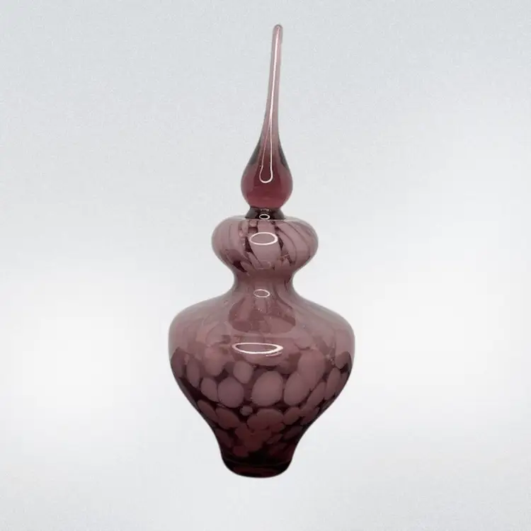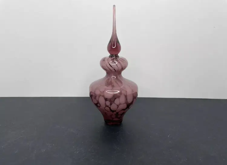 This unique perfume bottle is a stunning piece of art glass. The hand-blown glass has a beautiful mottled pattern in shades of purple & white, making it a perfect addition to any collection. The bottle is 7 inches tall with stopper and has a width of 3 inches at the widest point, with a stopper to ensure that it is secure.