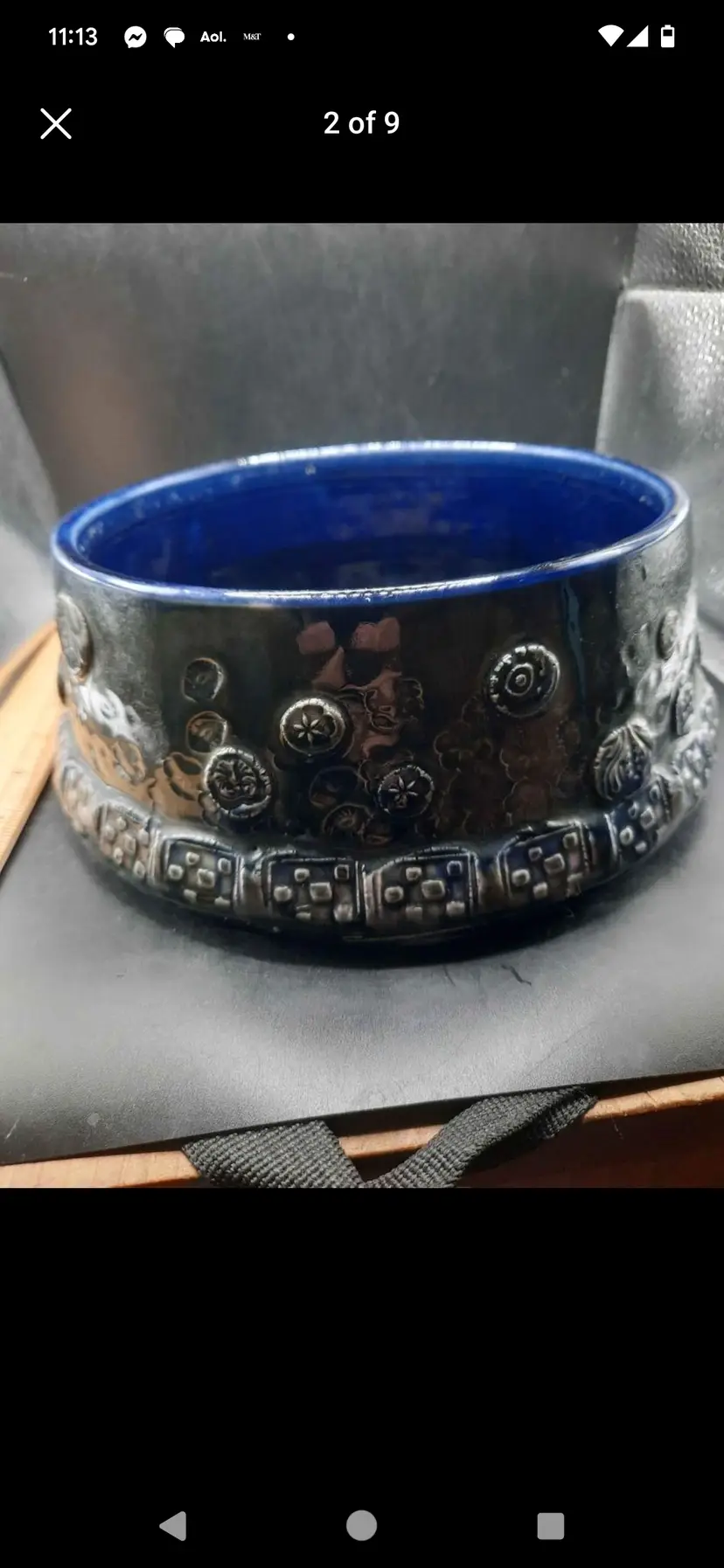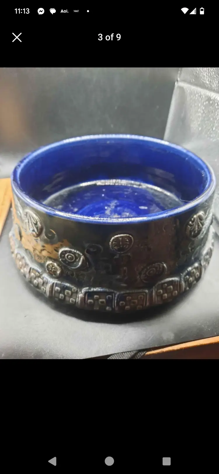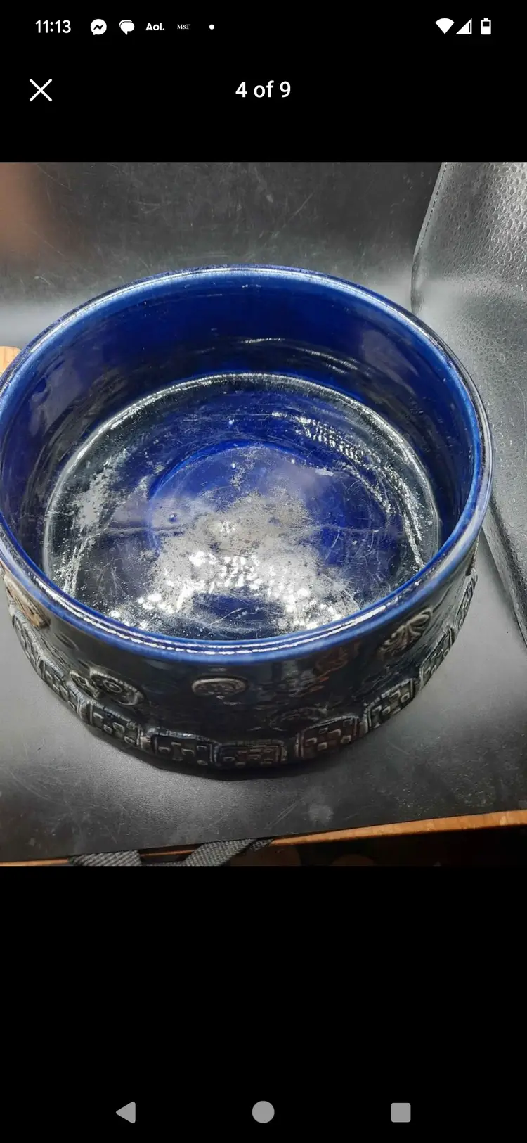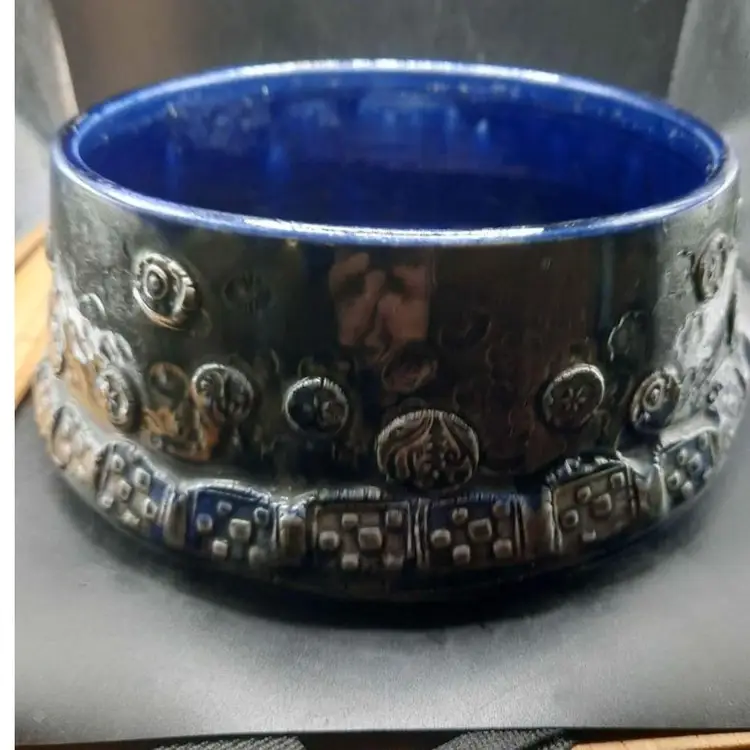 This is a stunning vintage 1960 to 1970s Studio Line Rosenthal Bjorn Wiinblad Large Center Bowl. It is done in an amazing cobalt blue and gray glazes with embossed button and rectangular edging design all around the outside. There are no chips or cracks. There is some inside wear as seen in pictures. Seems to be a rare piece. Only able to find a couple others listed for much more.