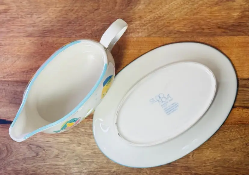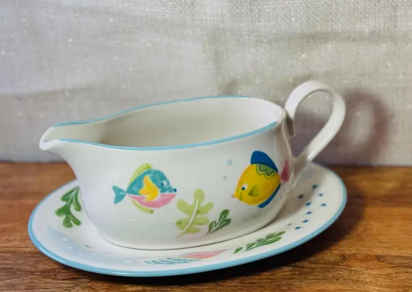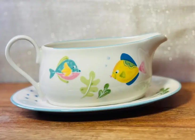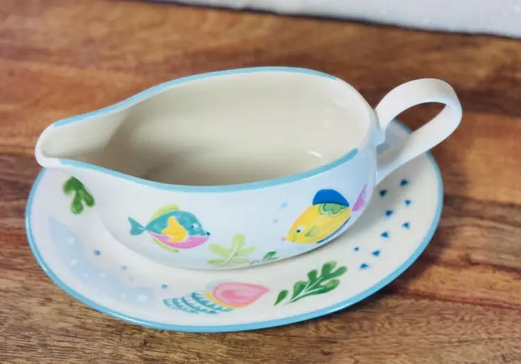 Studio Nova Barrier Reef Gravy Boat w/ Tray #Y2310 Gravy Boat Measures 8" by 3" tall Underplate Measures 8 1/2" by 6" Holds 14oz to rim Beige with Aqua Trim 4 multicolor Fish & Green Leaves
