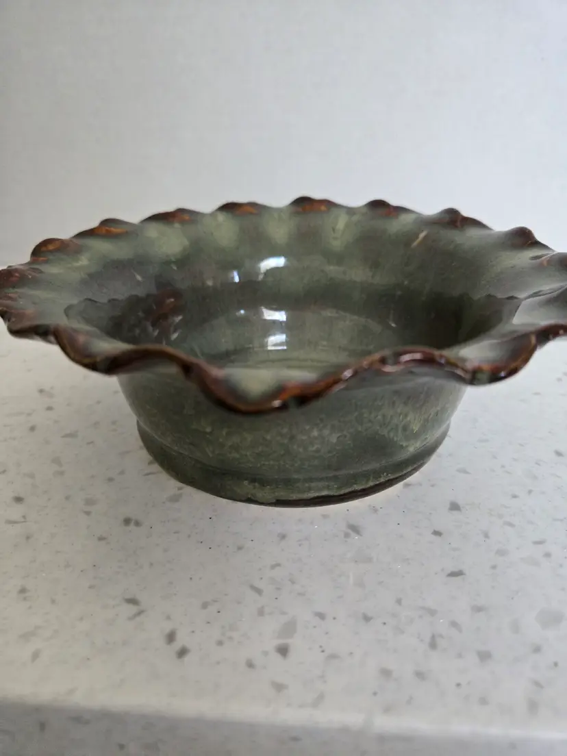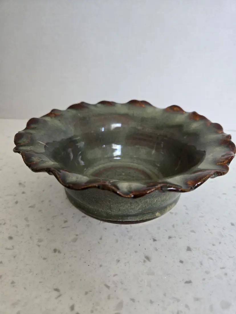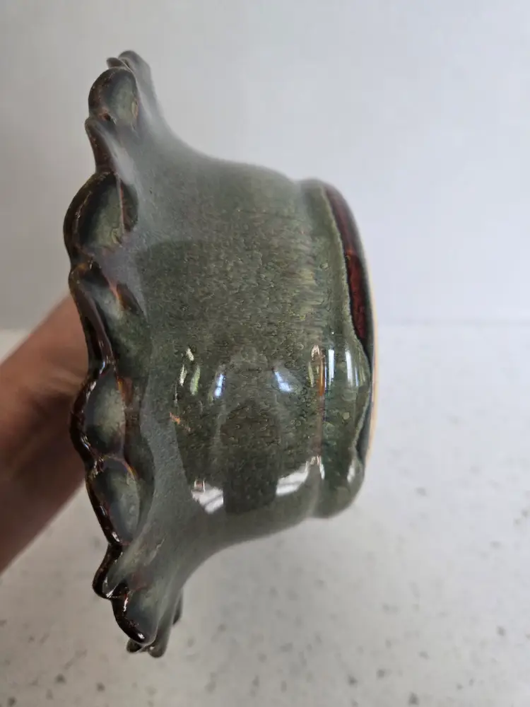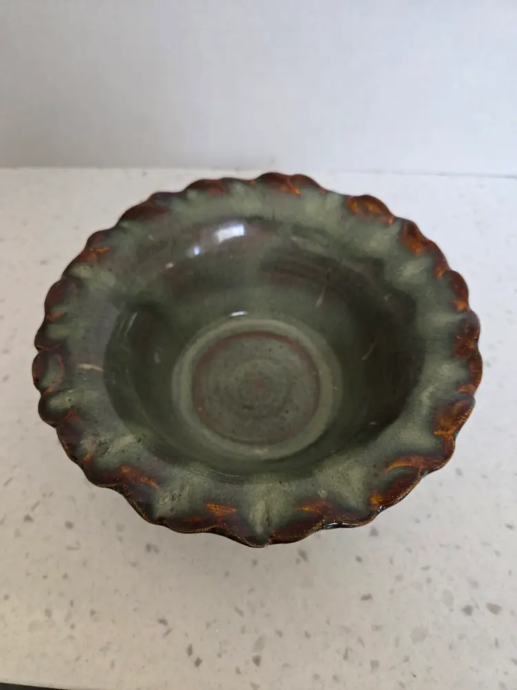 6" Studio Pottery Bowl, glazed teal & brown, signed KG '06, BVP , Scalloped edge, approximately 2½" tall, no chips or cracks