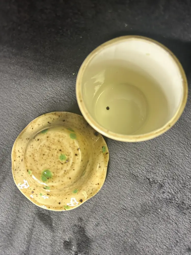 This product is a unique green and yellow ceramic dip chiller. The art pottery production style gives it a distinctive aesthetic, making it a stylish addition to any table setting or kitchen decor. The use of ceramic material adds a touch of elegance and durability to the piece, making it both functional and visually appealing for serving dips or other snacks. 5”x 4.5”