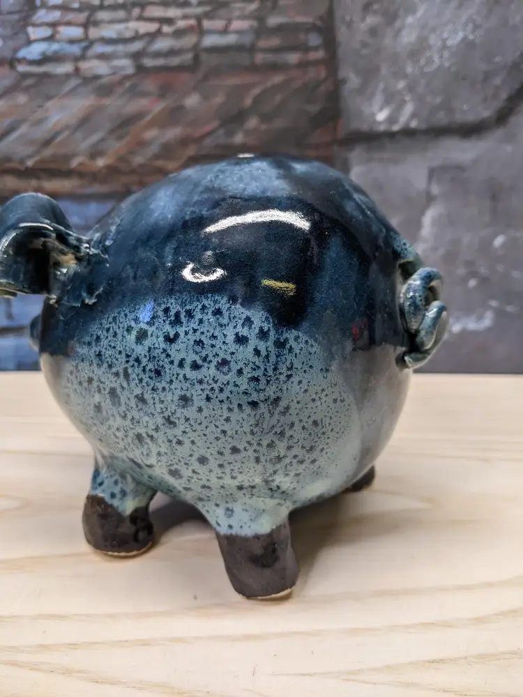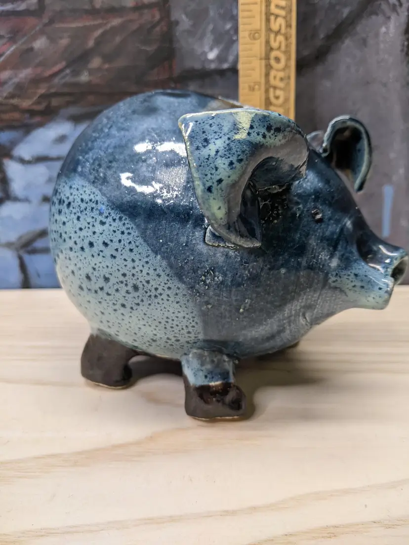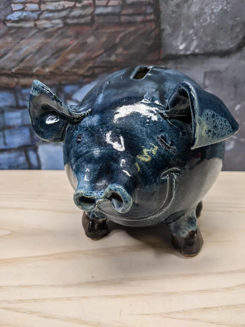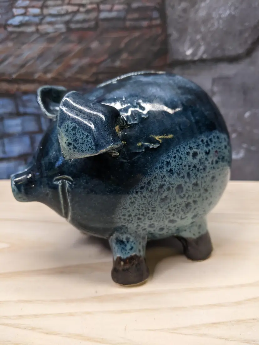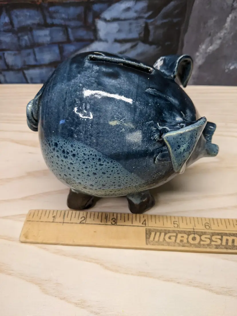 Studio Pottery Blue Black Piggy Pig Coin Bank Made of Stoneware . He is 5in wide and about 5in tall .Nice Dark blue and black Glaze. It has a pinched Nose and craved out smile . There is no way to get your coin s only with a cardboard in the slot or break the bank. Long term savings. Very good condition no chips or cracks he has some small unglazed spots . Please check the photos for details.