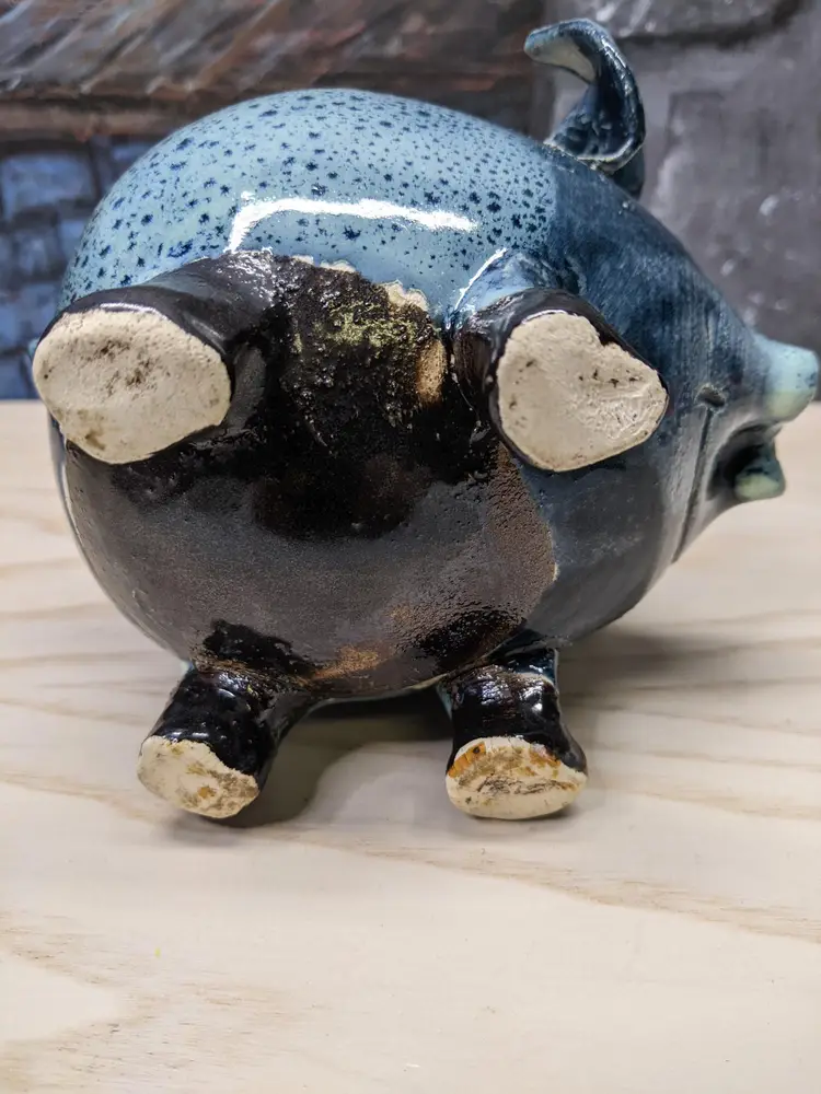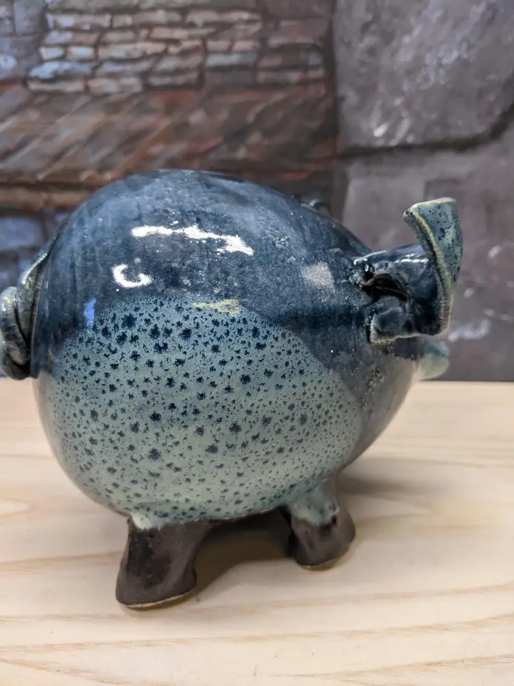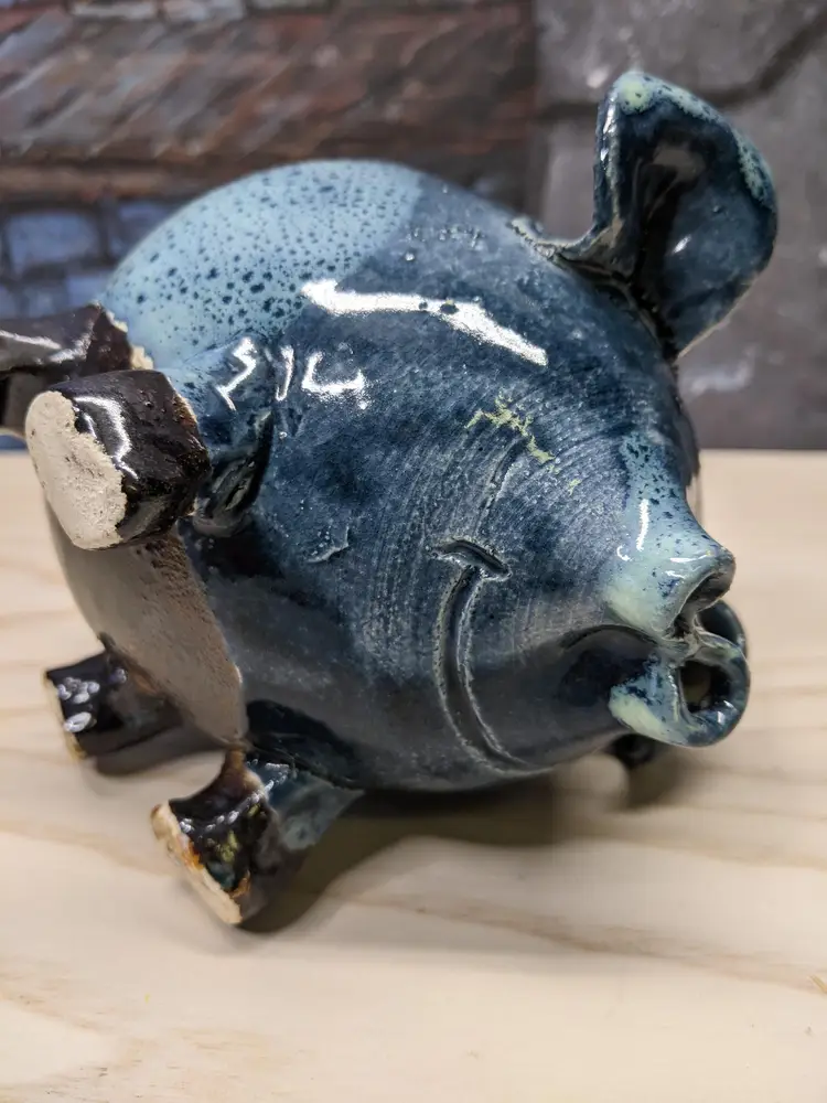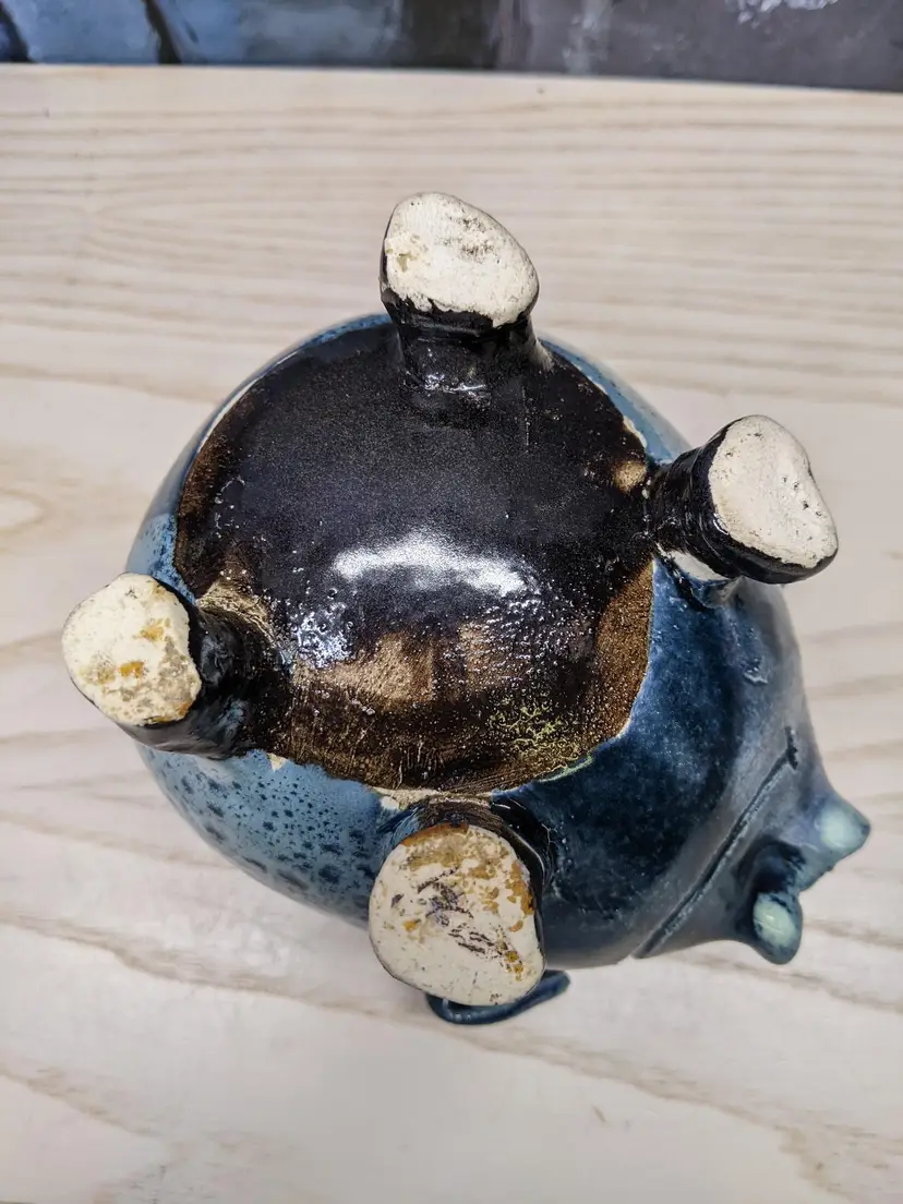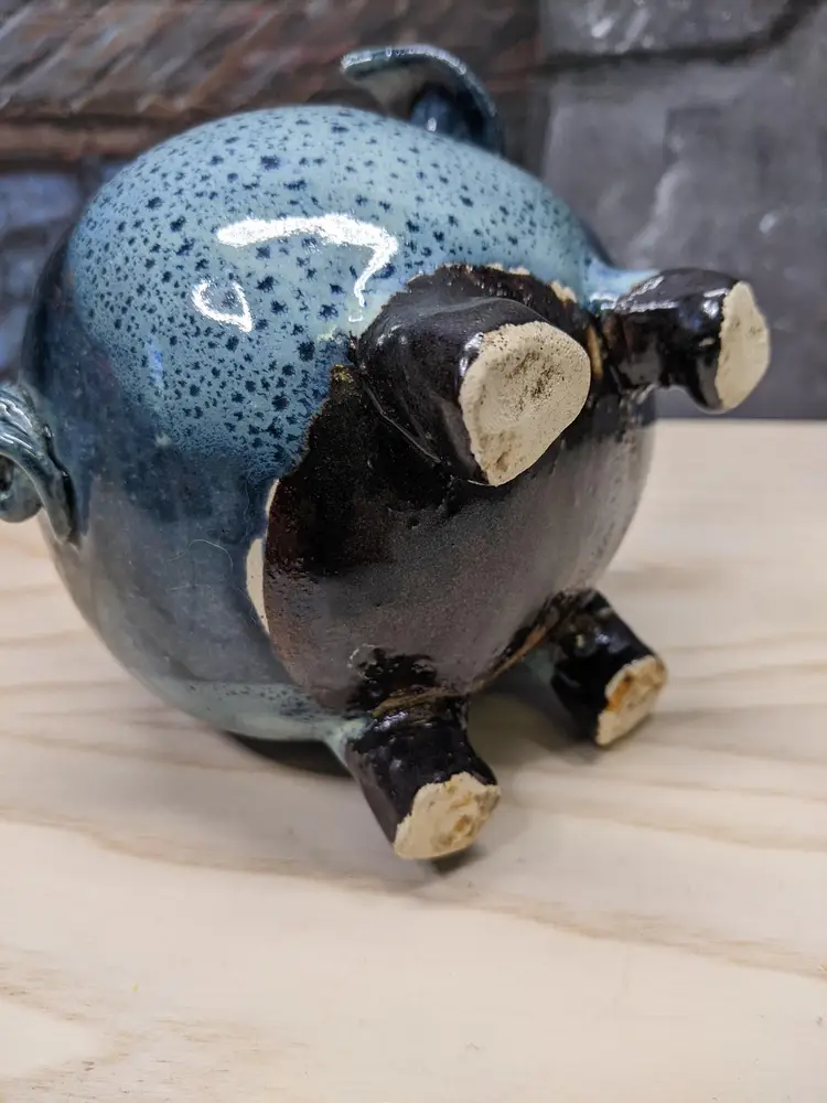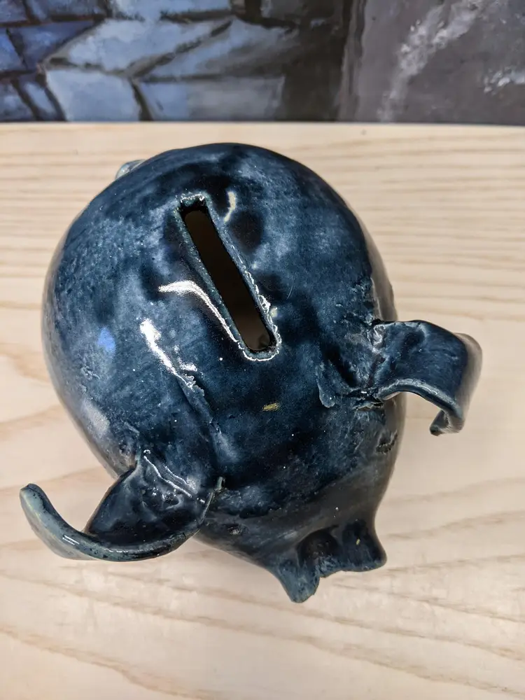 Studio Pottery Blue Black Piggy Pig Coin Bank Made of Stoneware . He is 5in wide and about 5in tall .Nice Dark blue and black Glaze. It has a pinched Nose and craved out smile . There is no way to get your coin s only with a cardboard in the slot or break the bank. Long term savings. Very good condition no chips or cracks he has some small unglazed spots . Please check the photos for details.