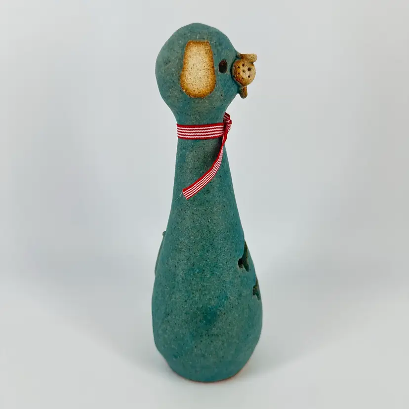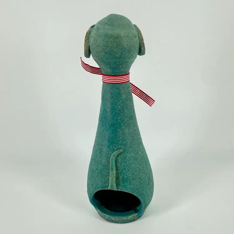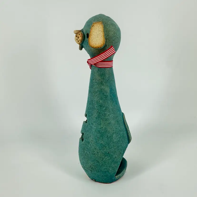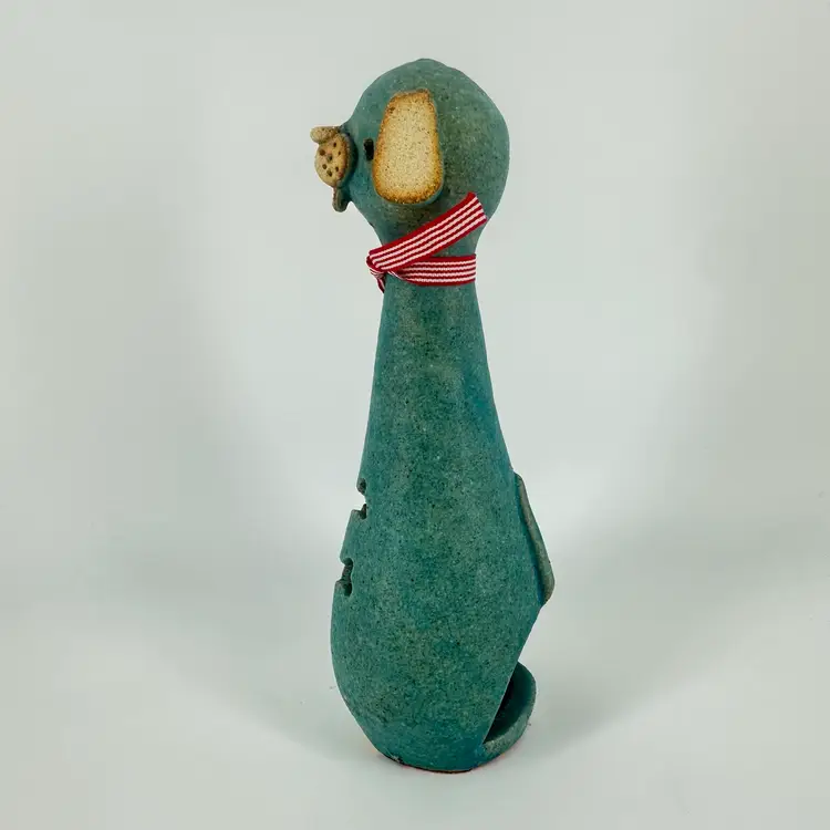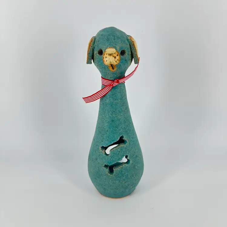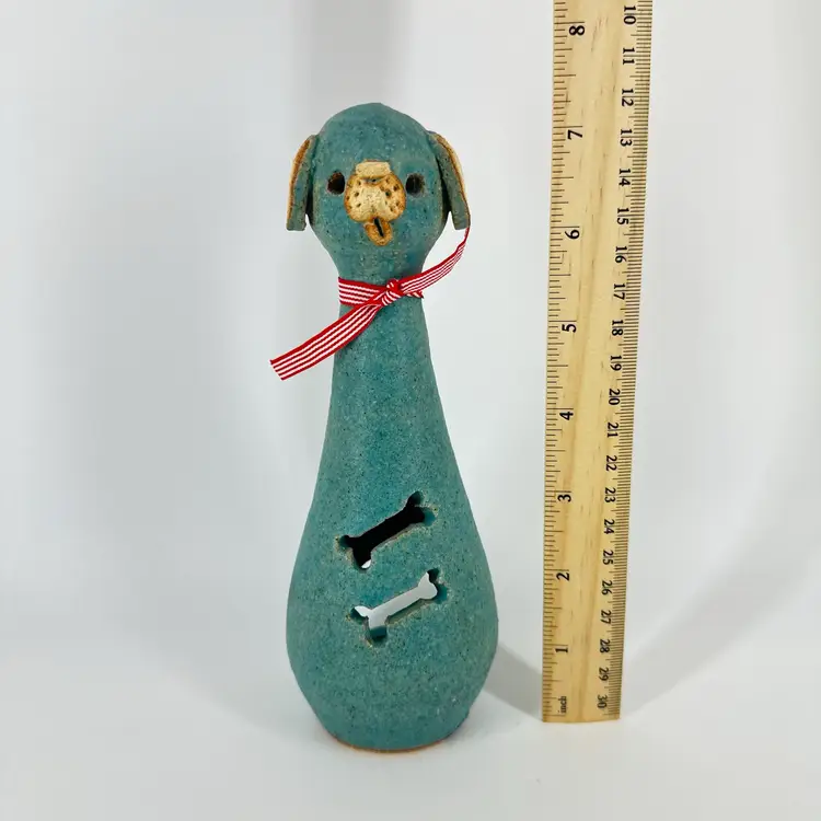 Studio pottery blue dog with striped fabric ribbon tea light holder. No chips or cracks. Measures approximately 7.5” tall. Marked on the bottom. See photos.