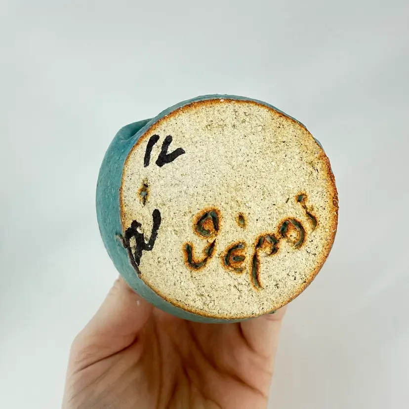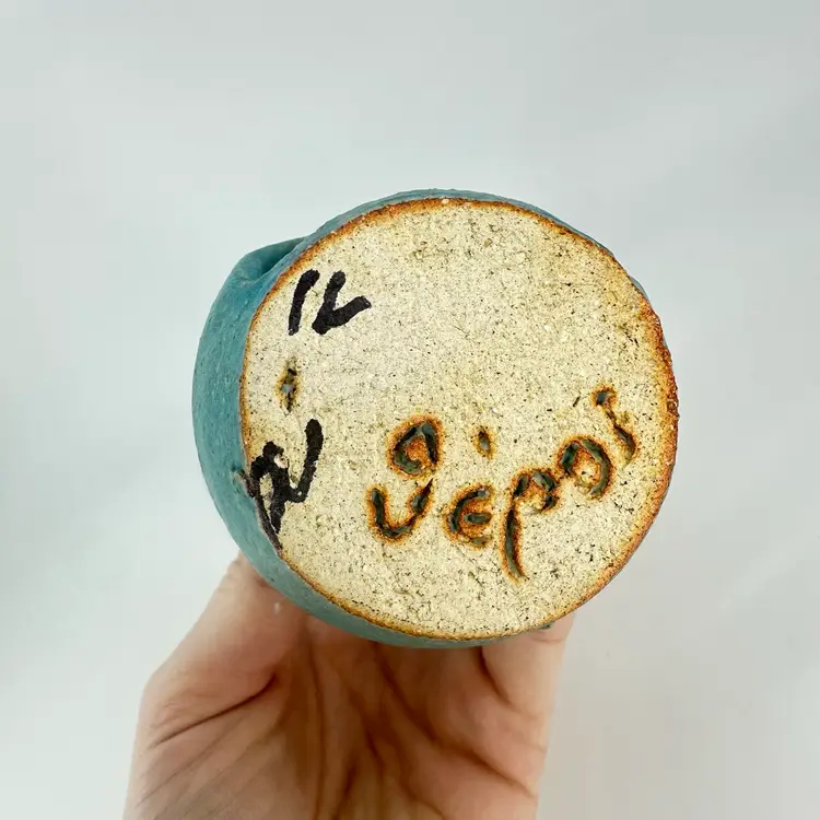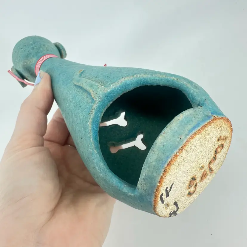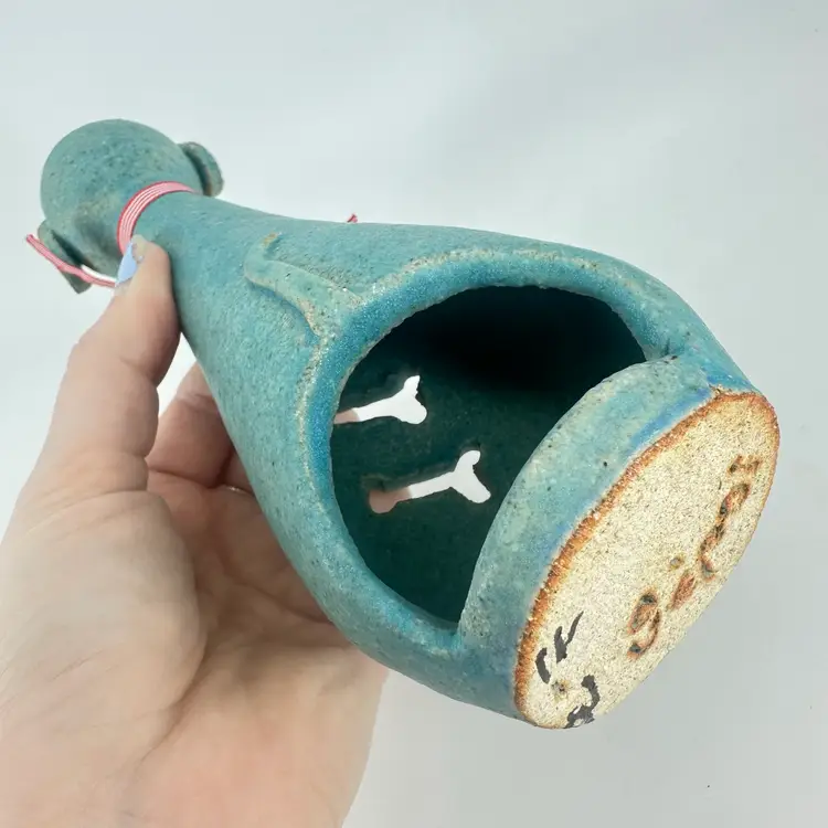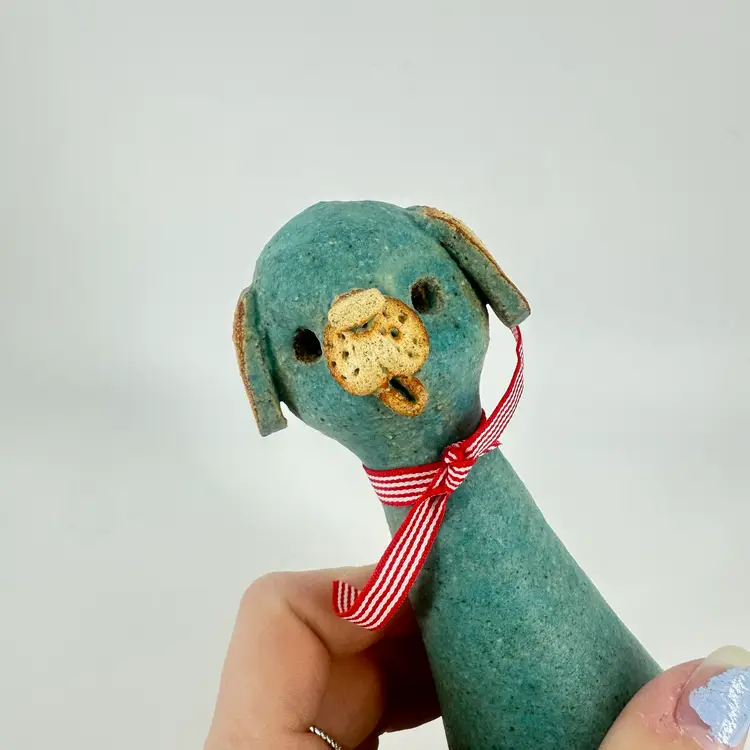 Studio pottery blue dog with striped fabric ribbon tea light holder. No chips or cracks. Measures approximately 7.5” tall. Marked on the bottom. See photos.