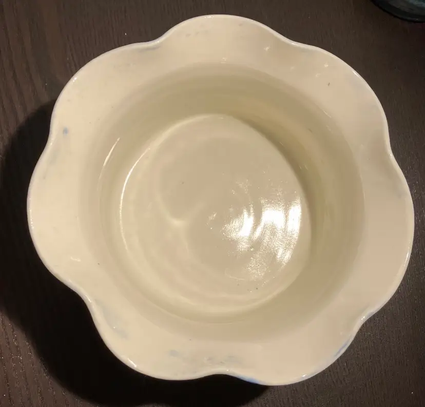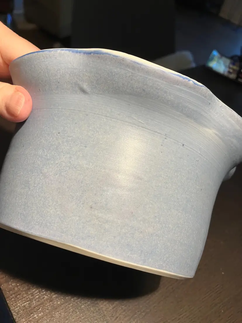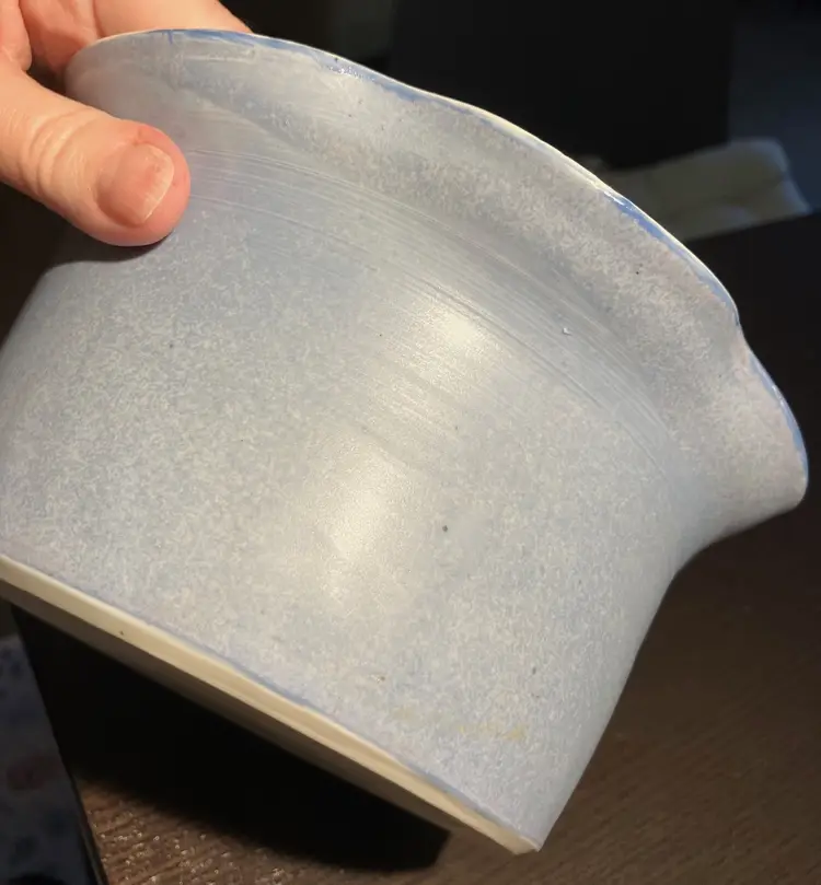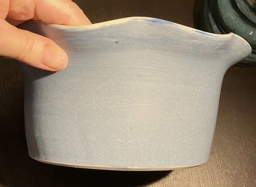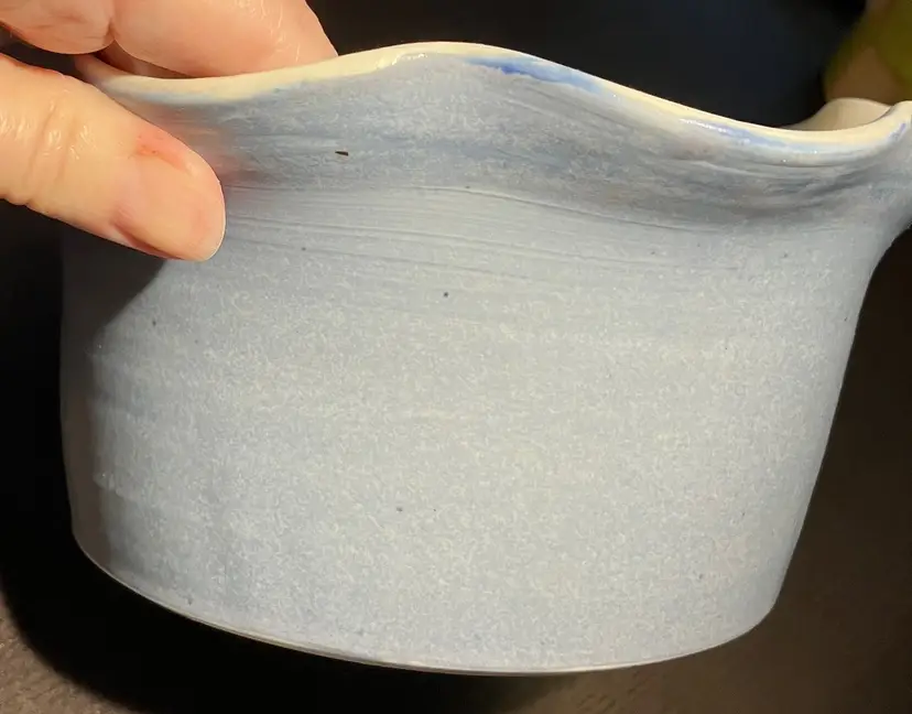 No chips or cracks. It is blue on the outside and cream on the inside. There is blue coloring in the glaze on the inside of the scalloped rim - done during the handmade process. Measurements: 5 1/2" diameter at the base and 7 1/2" diameter at the opening, 3 1/2" tall. Weighs almost 2 lbs.