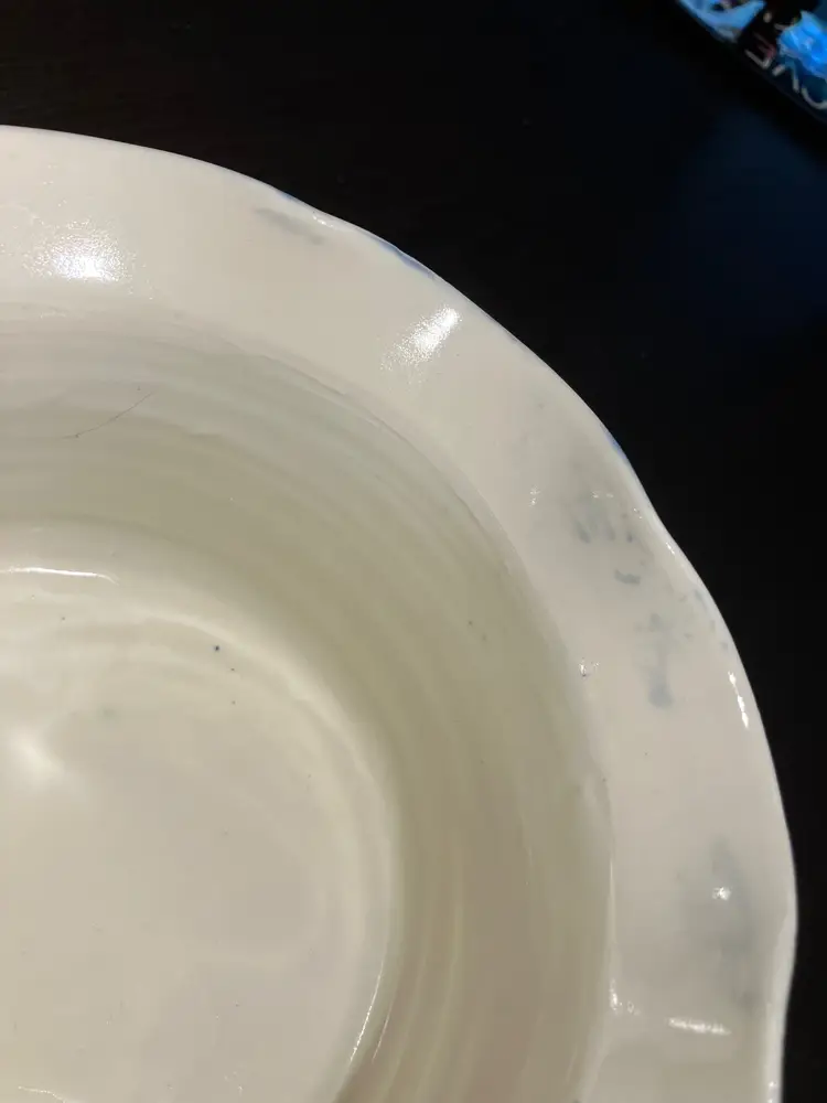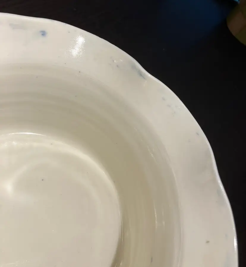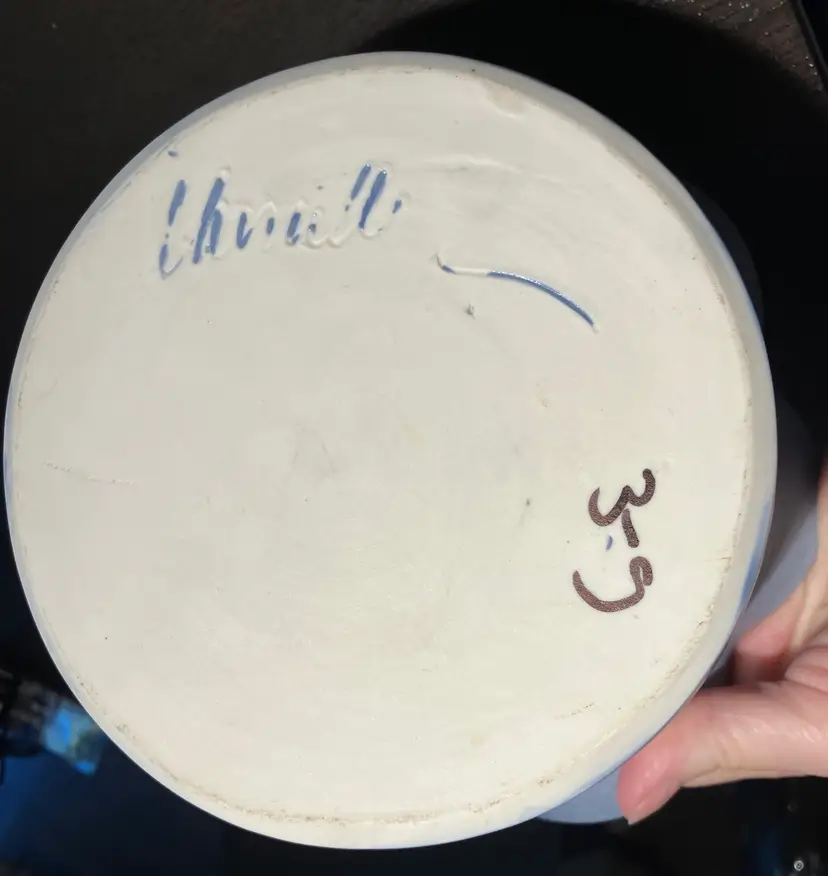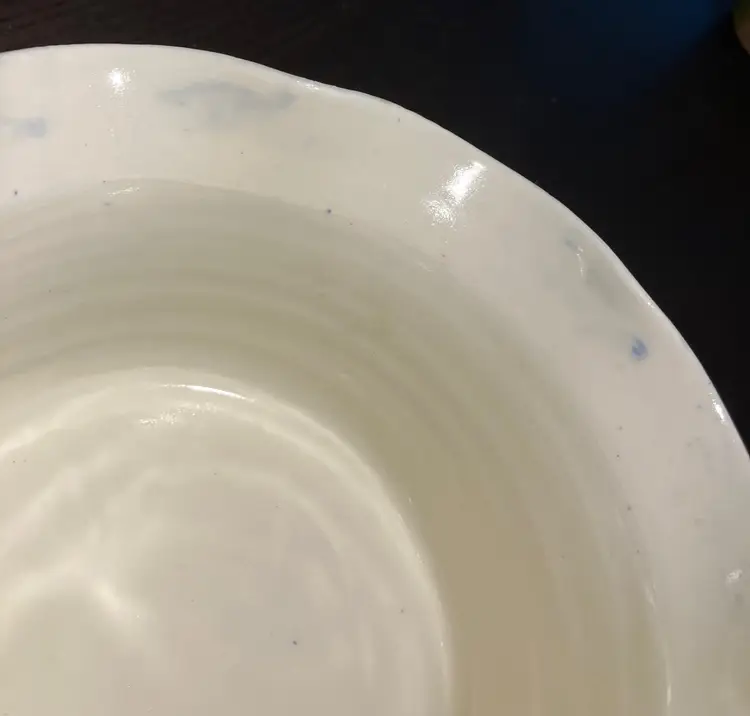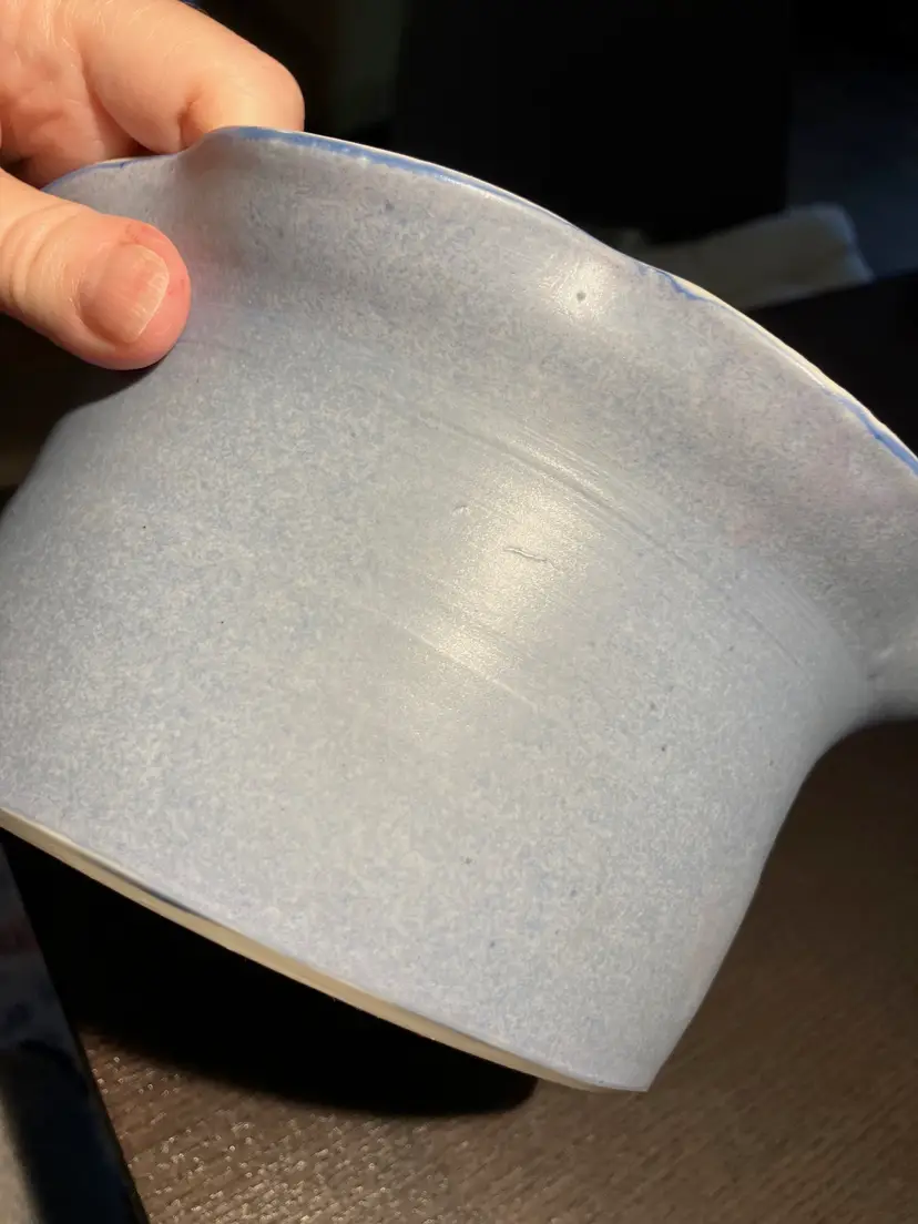 No chips or cracks. It is blue on the outside and cream on the inside. There is blue coloring in the glaze on the inside of the scalloped rim - done during the handmade process. Measurements: 5 1/2" diameter at the base and 7 1/2" diameter at the opening, 3 1/2" tall. Weighs almost 2 lbs.