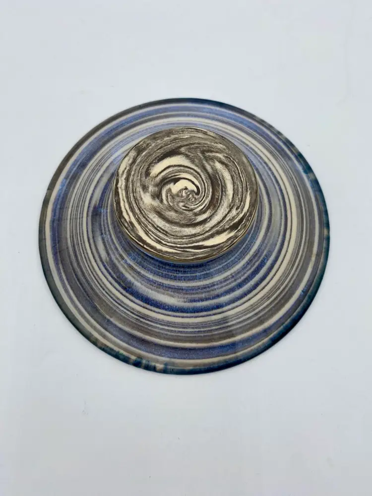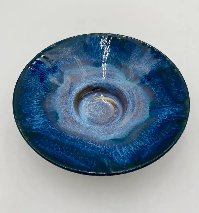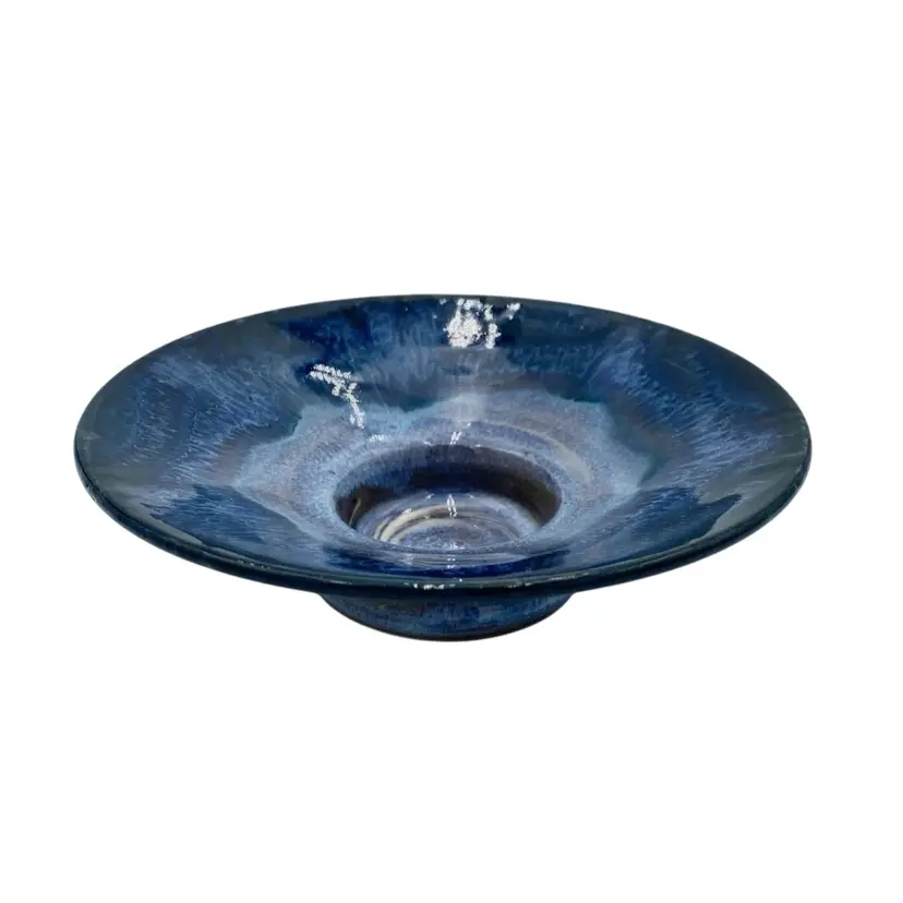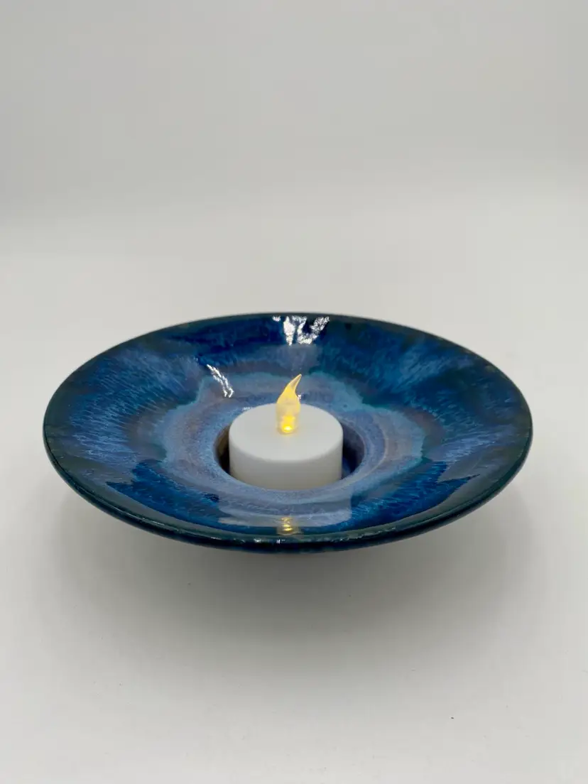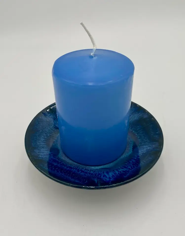 This lovely studio pottery candle holder is features a base glaze of blue and purple, with a vibrant blue drip glaze on top. On the underside of the holder, there is a swirl (spun) glaze that creates its own interest. Made from clay, this candle holder is suitable for flameless/LED candles, small pillar candles, votive candles, mini candles, and tea lights. With dimensions of 1.5 inches in height and 5.6 inches in width, this handmade piece weighs 7 ounces. The glaze is similar to a Bill Campbell piece, but there is no signature to verify its creator.