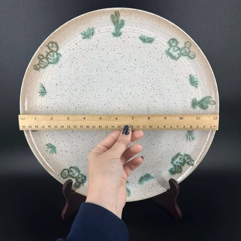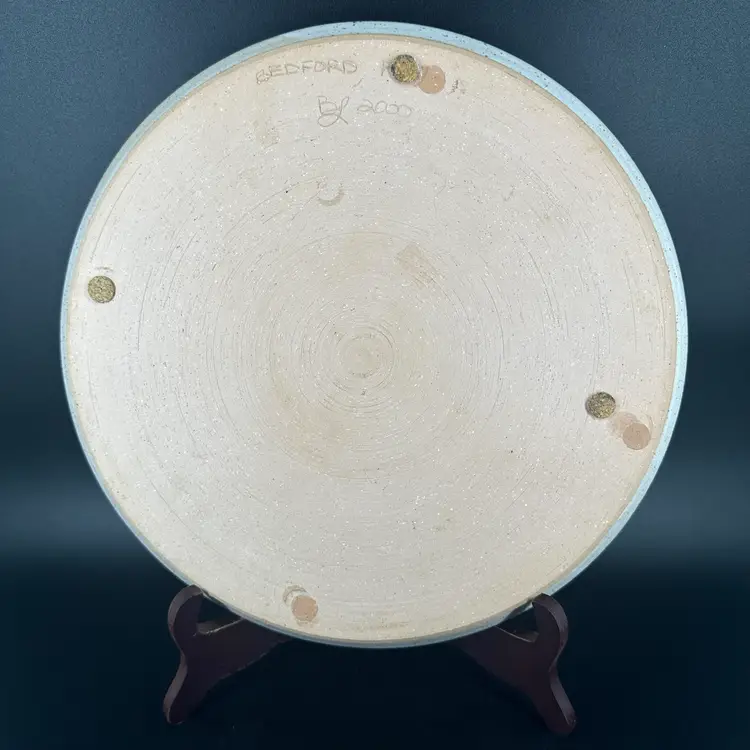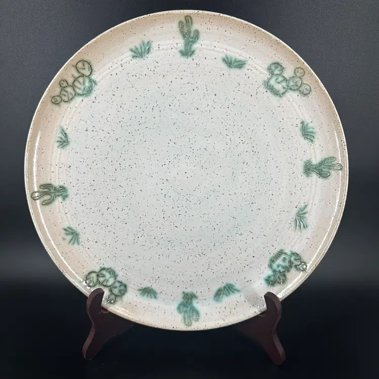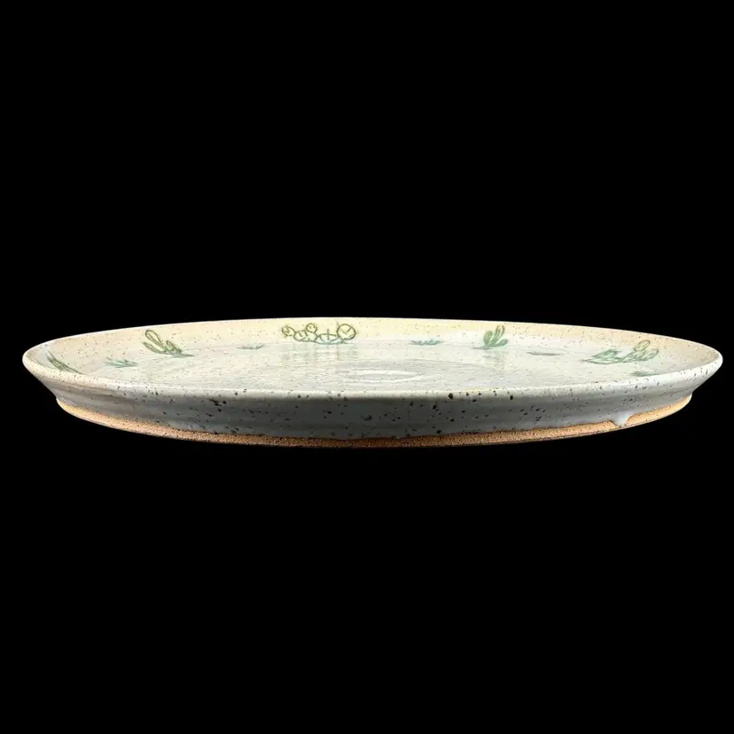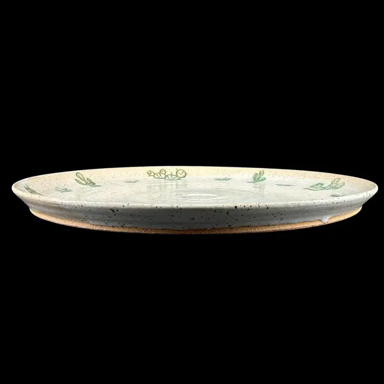 Handmade studio pottery large plate featuring an eggshell colored speckled glaze and a cactus/grass designed rim. Plate is thin with a ~.5” rim. Measures approximately 12” wide. Engraved signature on bottom “BEDFORD, PA BL 2000”. No chips or cracks, all four cork cushions on bottom. Plate holder NFS