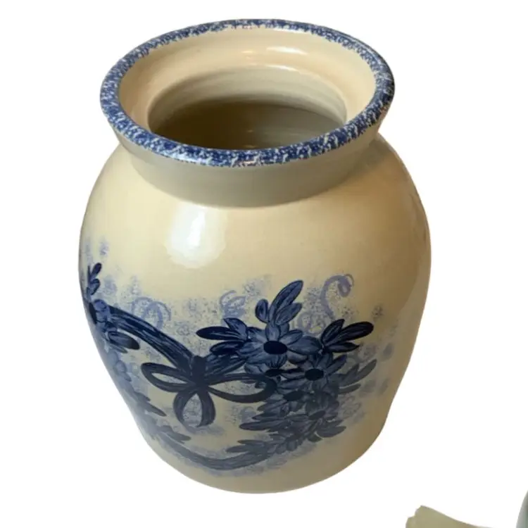 Heavy studio pottery jars/canisters with lids. They look really great. Beautiful blue scene on a cream colored background. Would look great with any vintage style decor.