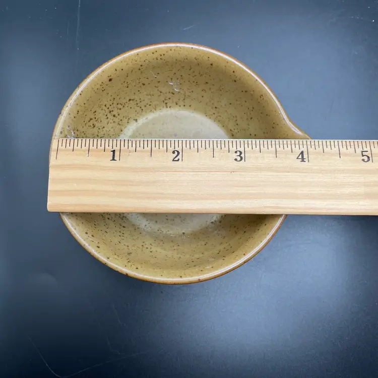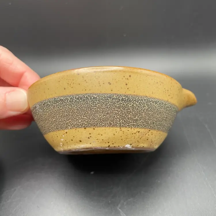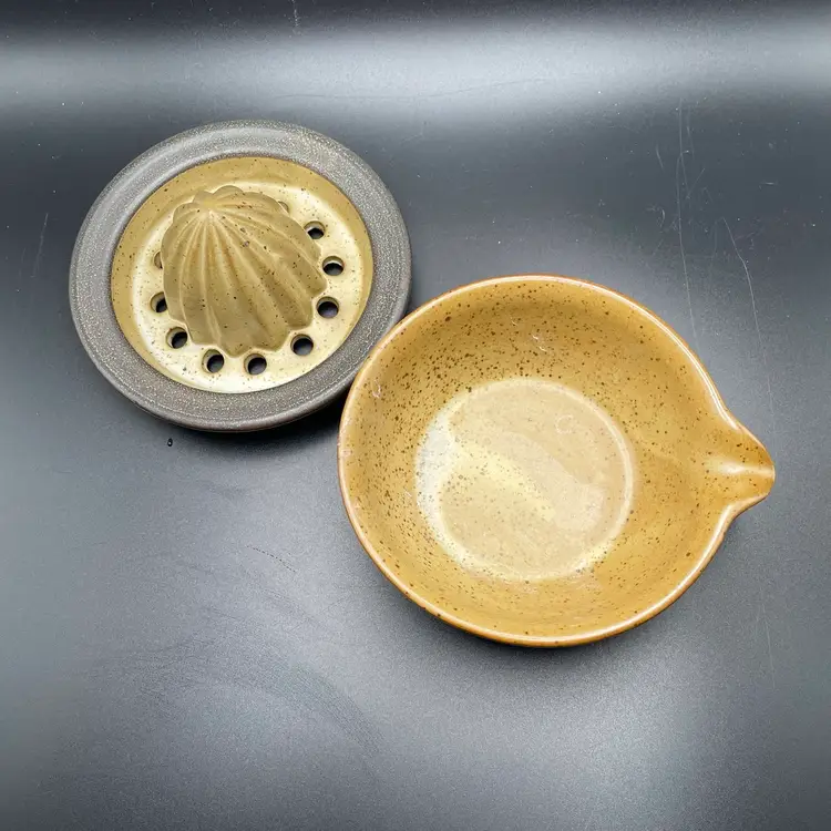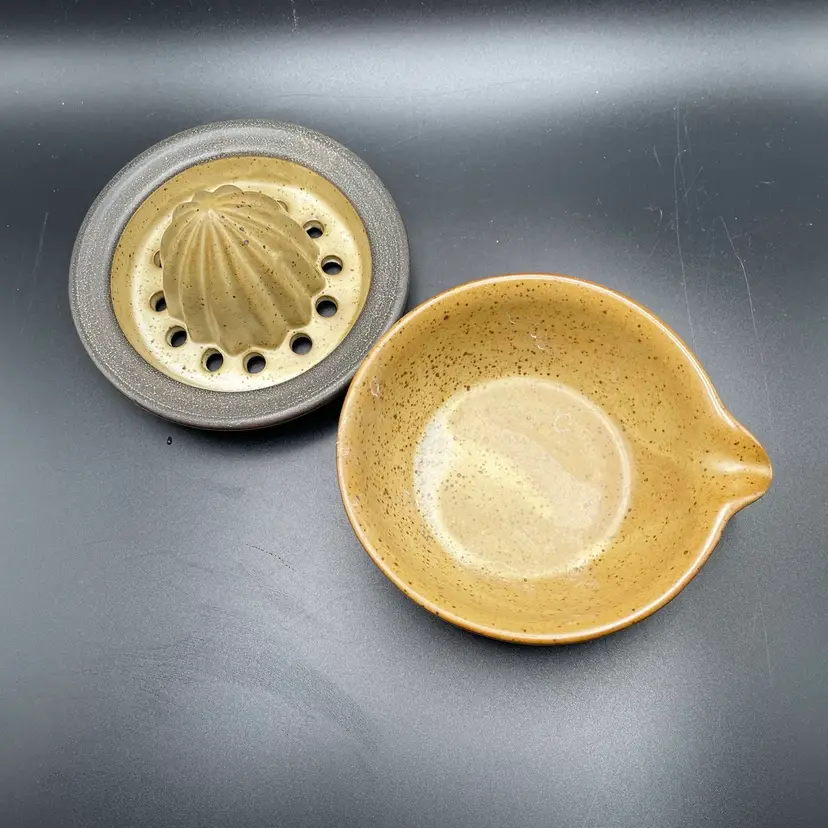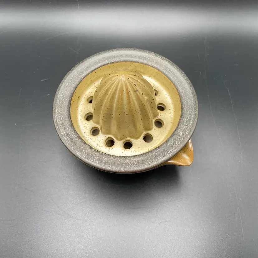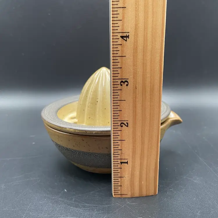 This is a studio pottery citrus juicer/reamer. Measures approximately 3.25" tall x 4" across to the spout. There are a couple of spots missing glaze. No chips or cracks.