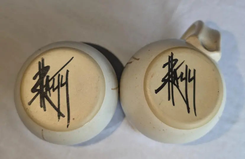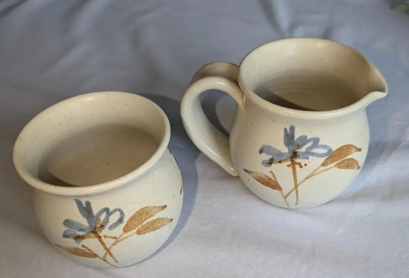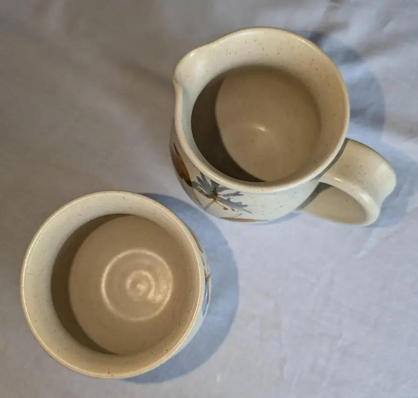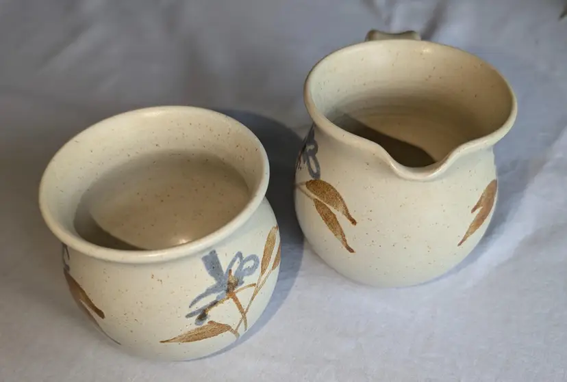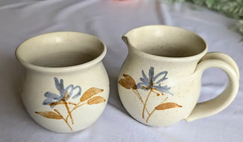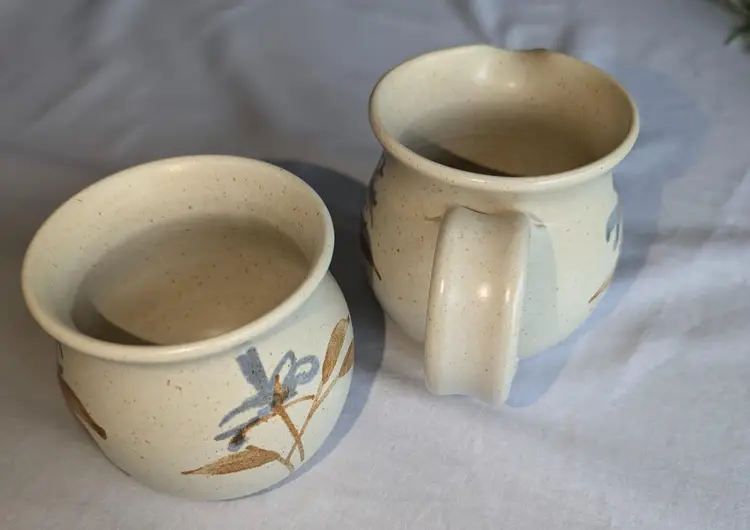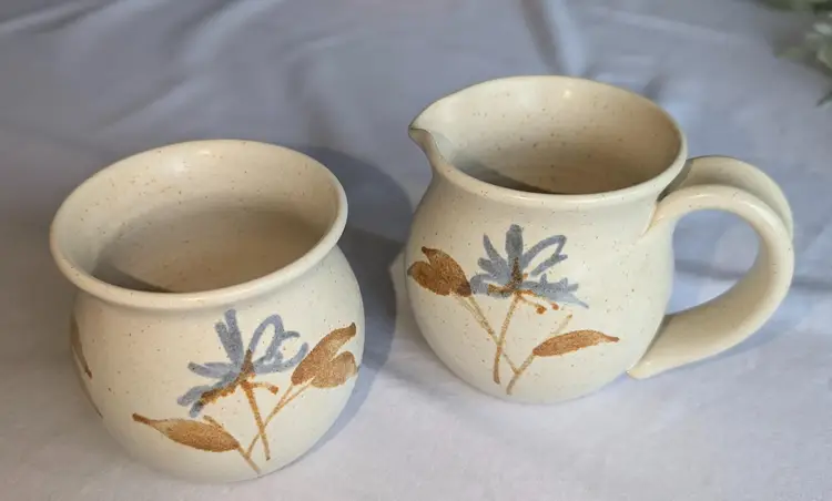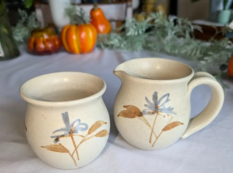 Hand painted florals on speckled glaze pottery. Gorgeous for fall. 3.5" high x 3" wide diameter bowls. X 5" long including handle.