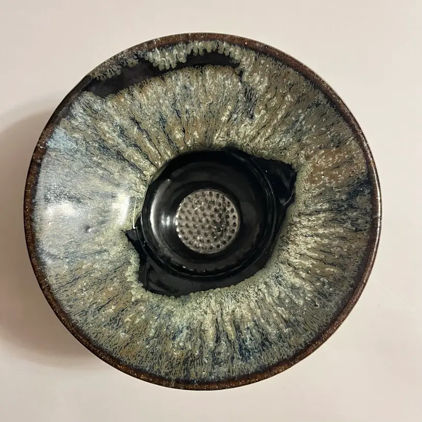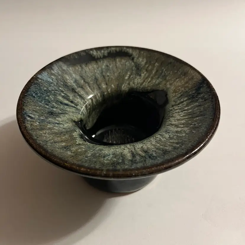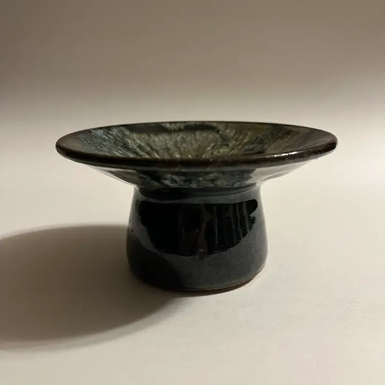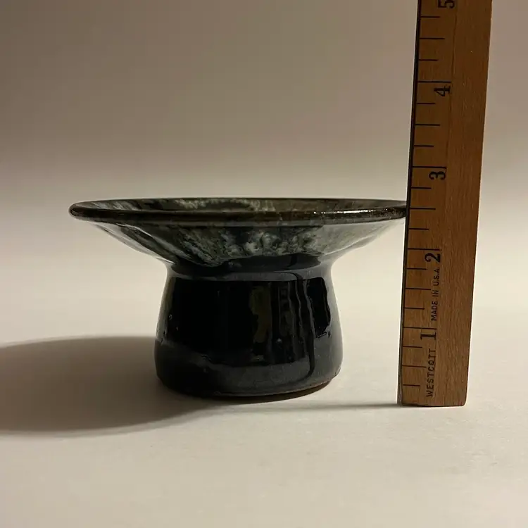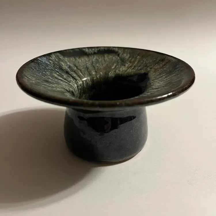This studio pottery Ikebana vase features a striking drip glaze in earthy tones of black, green, and blue, attached metal floral frog nestled within its 2-inch diameter opening. Overall, the piece measures 4.75 in diameter and stands 2.5 in high. Hand-thrown stoneware, signed by the artist on the base. The glossy finish and organic glaze flow evoke natural landscapes, making it a compelling choice for collectors of studio pottery or practitioners of Japanese flower arranging. Excellent pre-owned condition with no chips, cracks, or repairs. Please refer to photos for full details
