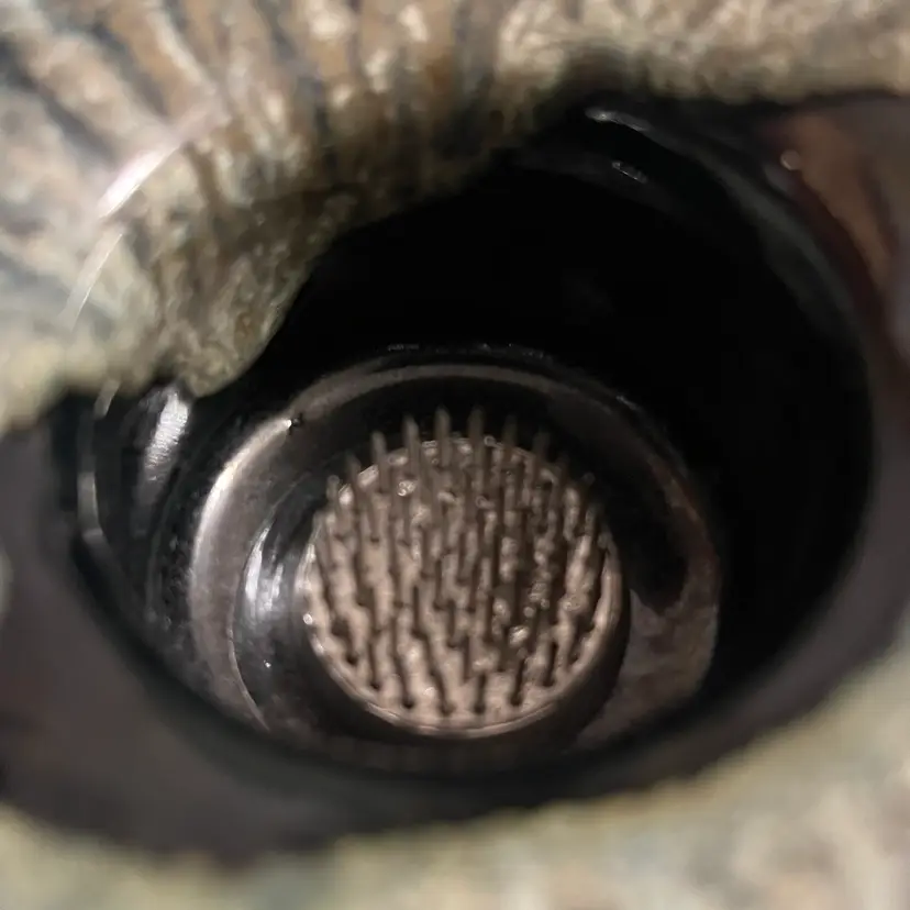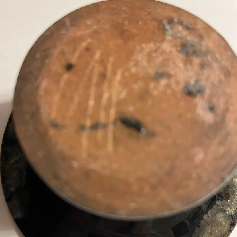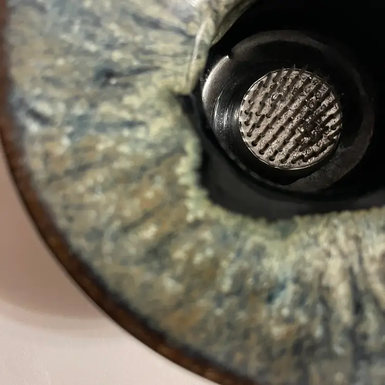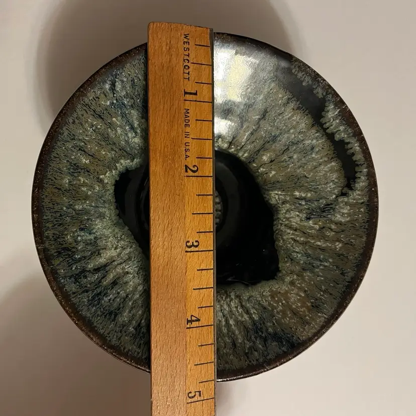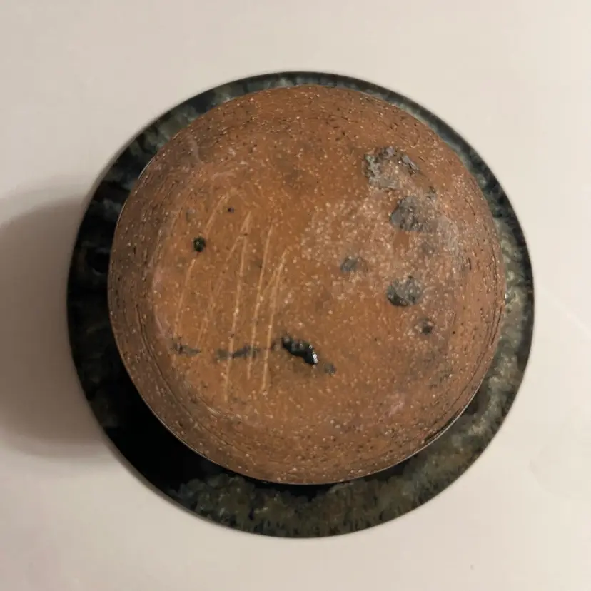 This studio pottery Ikebana vase features a striking drip glaze in earthy tones of black, green, and blue, attached metal floral frog nestled within its 2-inch diameter opening. Overall, the piece measures 4.75 in diameter and stands 2.5 in high. Hand-thrown stoneware, signed by the artist on the base. The glossy finish and organic glaze flow evoke natural landscapes, making it a compelling choice for collectors of studio pottery or practitioners of Japanese flower arranging. Excellent pre-owned condition with no chips, cracks, or repairs. Please refer to photos for full details