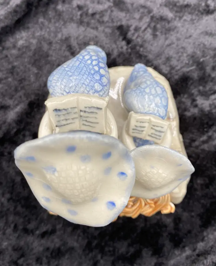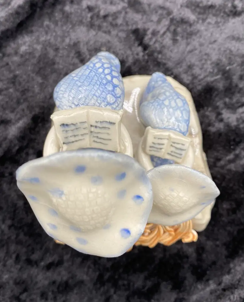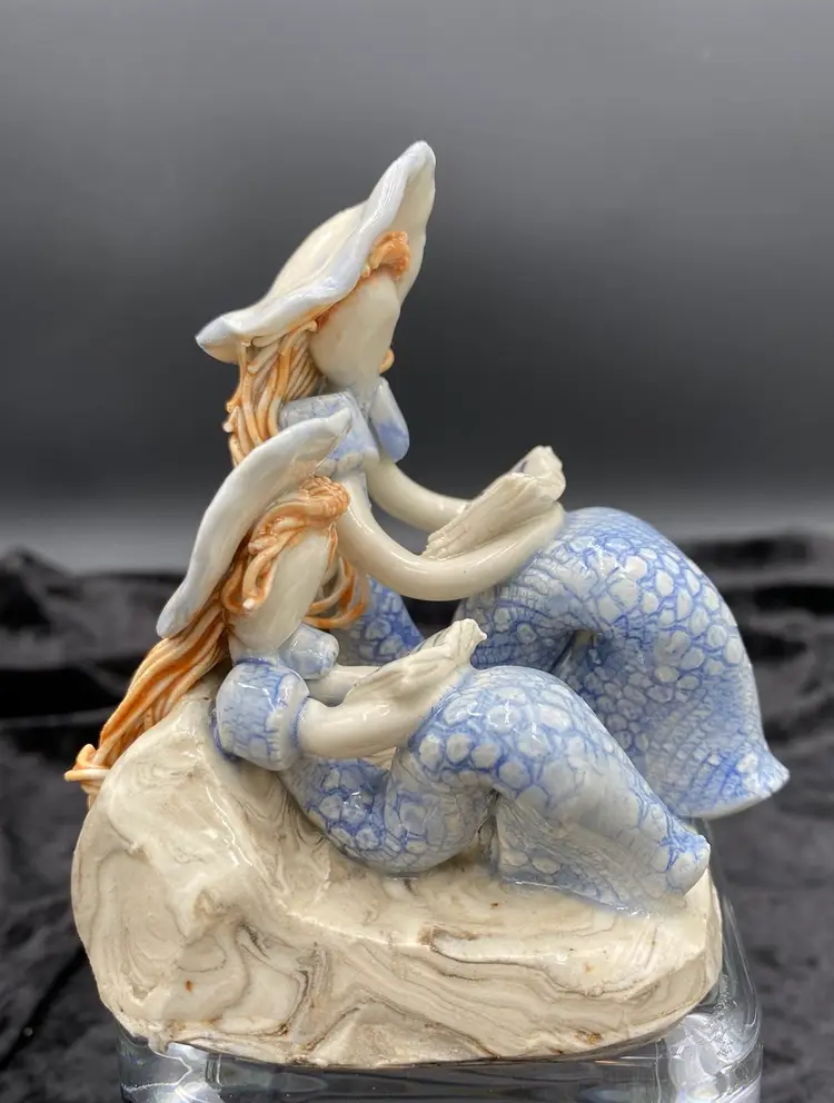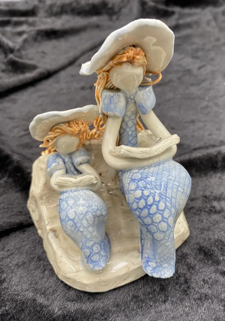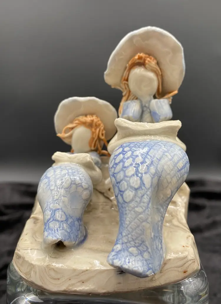 This beautiful studio pottery figurine depicts a mother and daughter in matching long dresses & sunhats reading on the beach. The figurine is handmade with care and features bubble glazing, marbling, and individually-crafted strands on hair, making it a unique addition to any room. Their long, strawberry blonde hair is intricate and beautifully done, capturing the curls and flow of their hair being blown by the wind. Their hats have textured centers where the hat rests on each head, an exquisite execution of just one detail! Both pottery books have blue lines of text and the long gowns have a lovely sense of movement. Measuring 3.25 inches in length, 4 inches in height, and 3.5 inches in width, this small sculpture is perfect for any occasion. The underside is signed "M & F", where the center figure is a musical treble clef (see photo). It is dated '07. Whether you're a collector or simply looking for a special gift, this mother and daughter figurine is sure to impress.