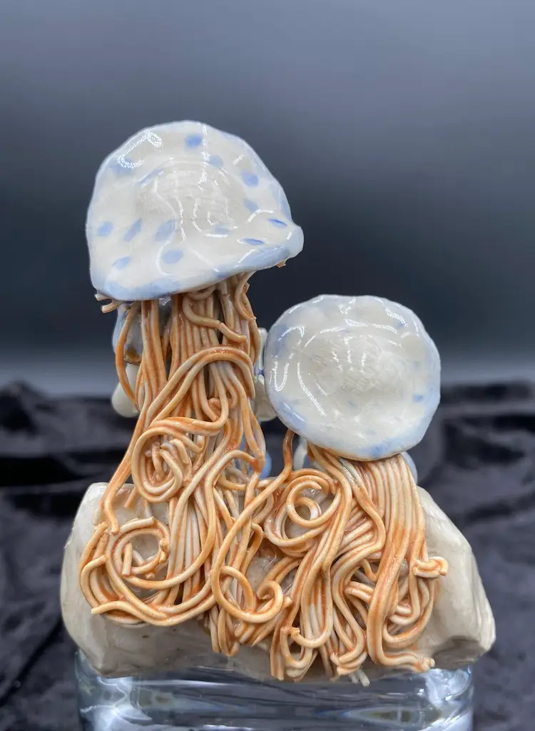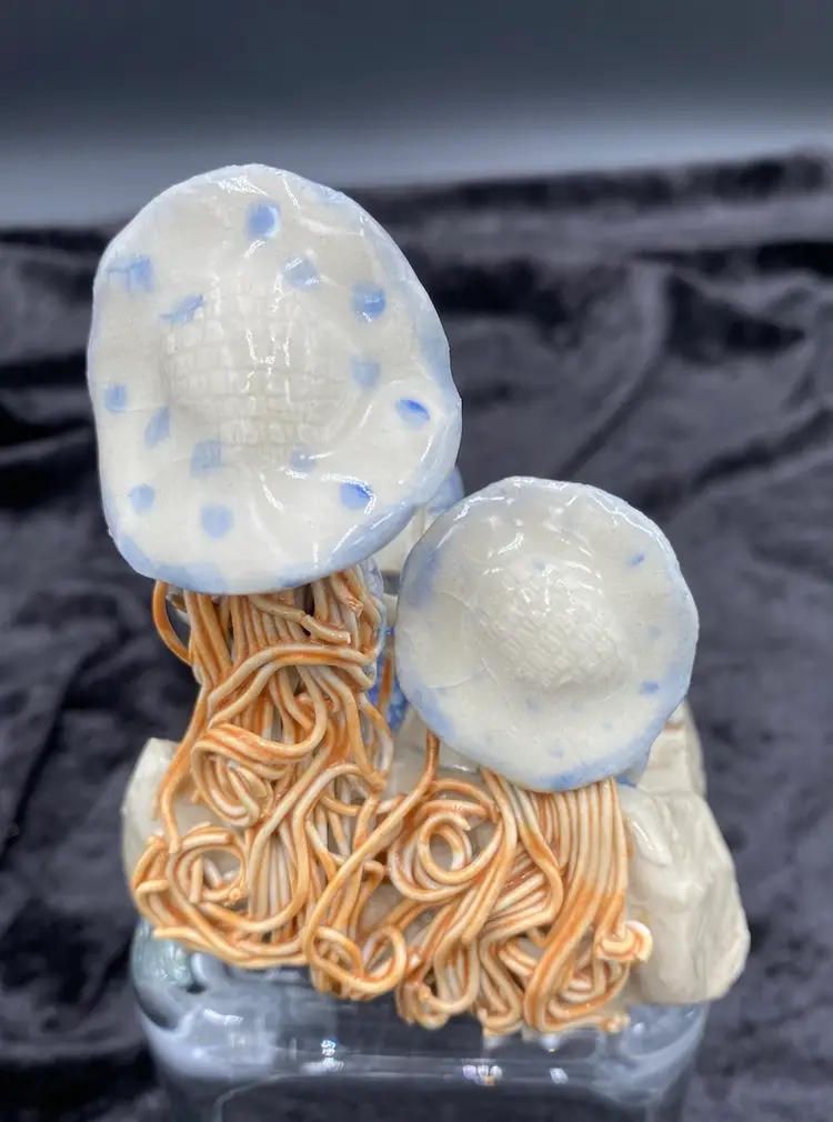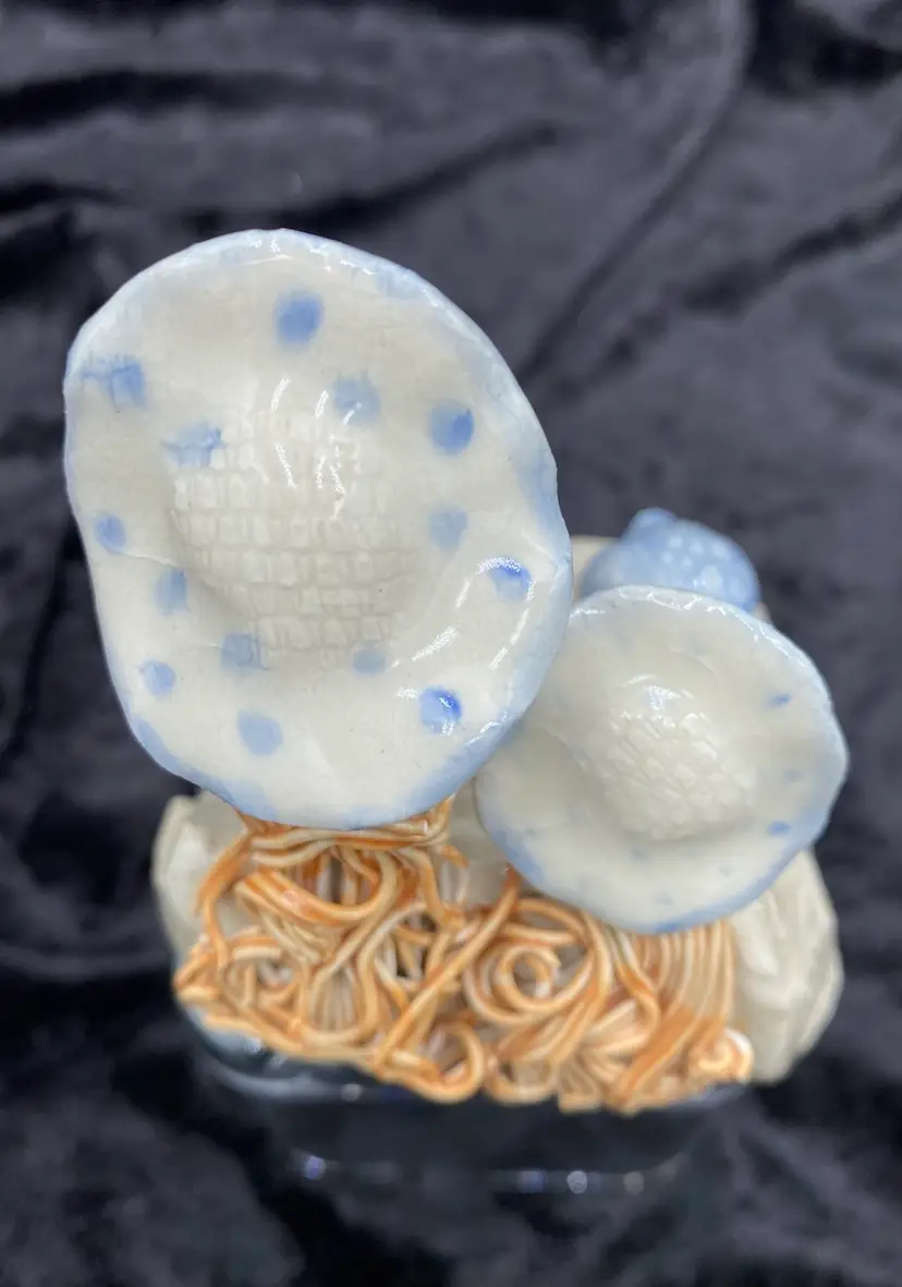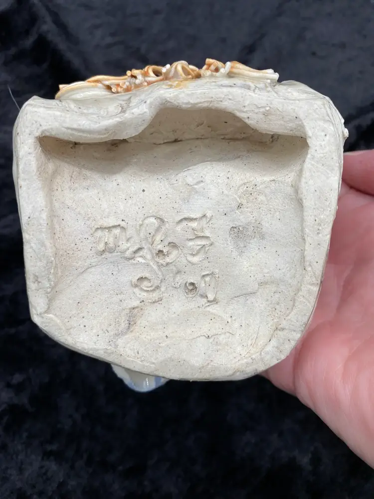 This beautiful studio pottery figurine depicts a mother and daughter in matching long dresses & sunhats reading on the beach. The figurine is handmade with care and features bubble glazing, marbling, and individually-crafted strands on hair, making it a unique addition to any room. Their long, strawberry blonde hair is intricate and beautifully done, capturing the curls and flow of their hair being blown by the wind. Their hats have textured centers where the hat rests on each head, an exquisite execution of just one detail! Both pottery books have blue lines of text and the long gowns have a lovely sense of movement. Measuring 3.25 inches in length, 4 inches in height, and 3.5 inches in width, this small sculpture is perfect for any occasion. The underside is signed "M & F", where the center figure is a musical treble clef (see photo). It is dated '07. Whether you're a collector or simply looking for a special gift, this mother and daughter figurine is sure to impress.
