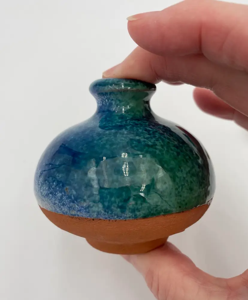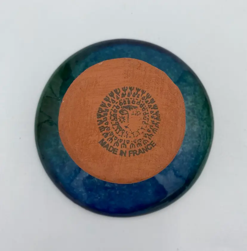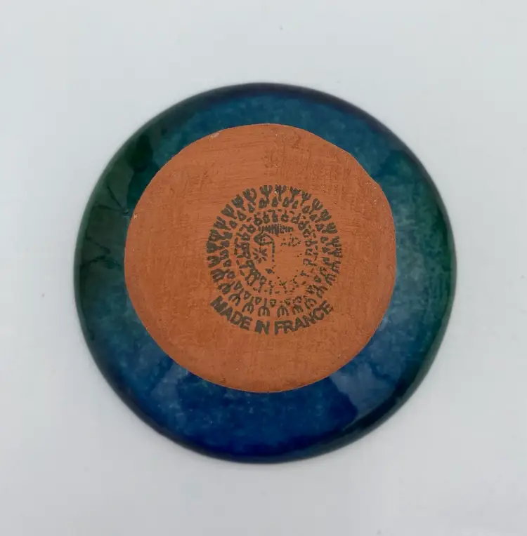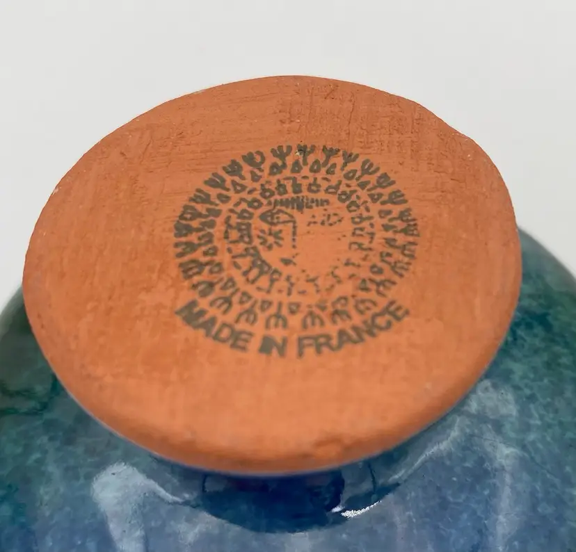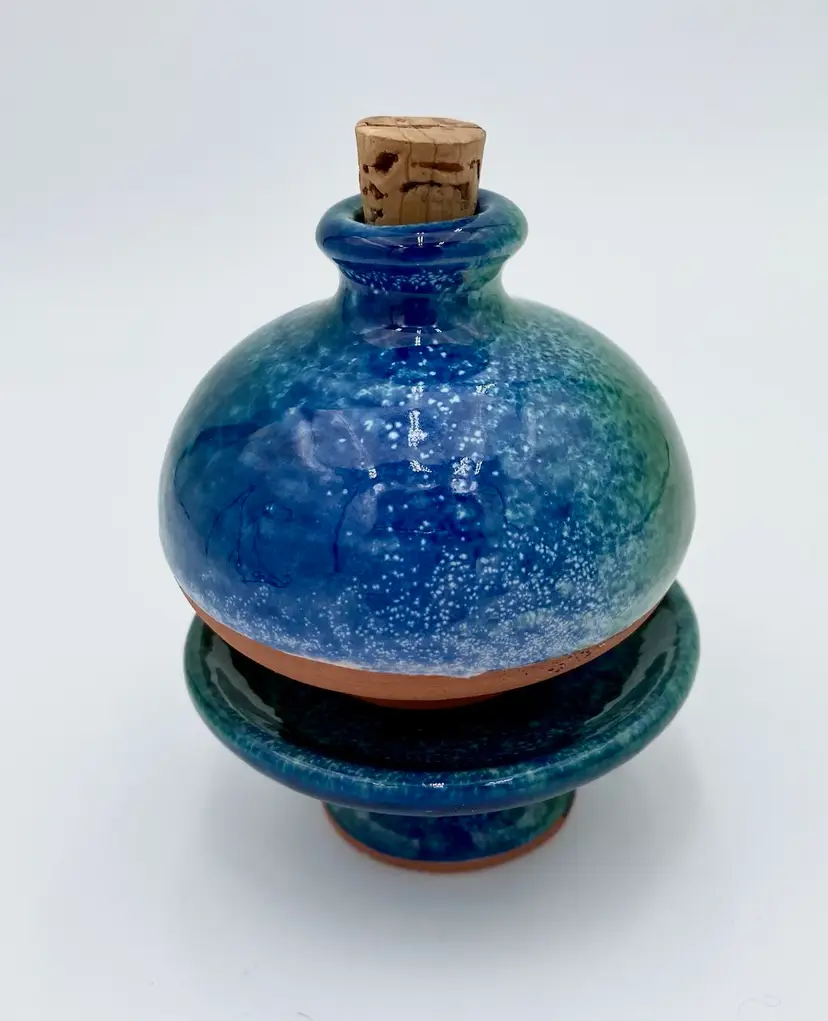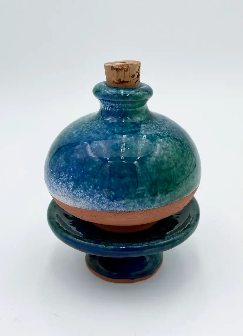 This French studio pottery Red Clay Oil Diffuser is a medium-sized piece that is handmade. Made of red clay and featuring blue and green speckled glazes, the corked jar sits atop a matching pedestal base. The piece weighs 8.1 ounces and can be used in any room of the home. The jar would also work with incense or scent sticks. Its a lovely piece! While I have not been able to determine the exact studio pottery based on their design logo, the piece is clearly marked as coming from France.