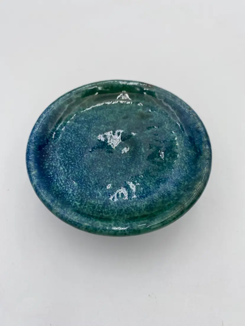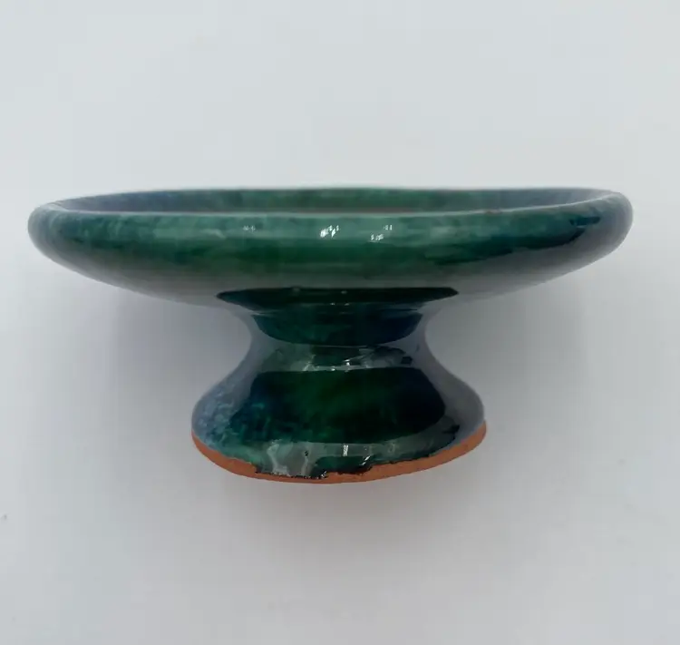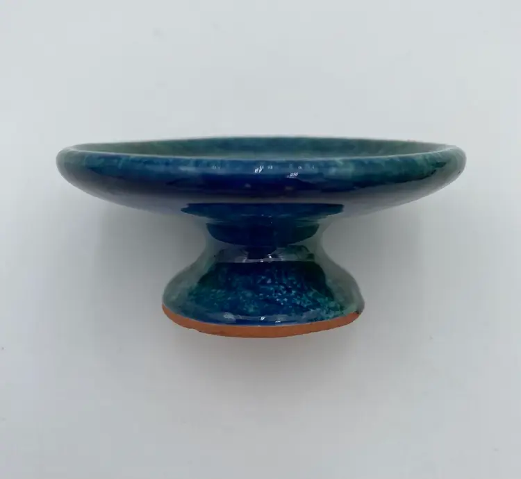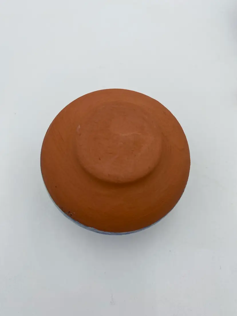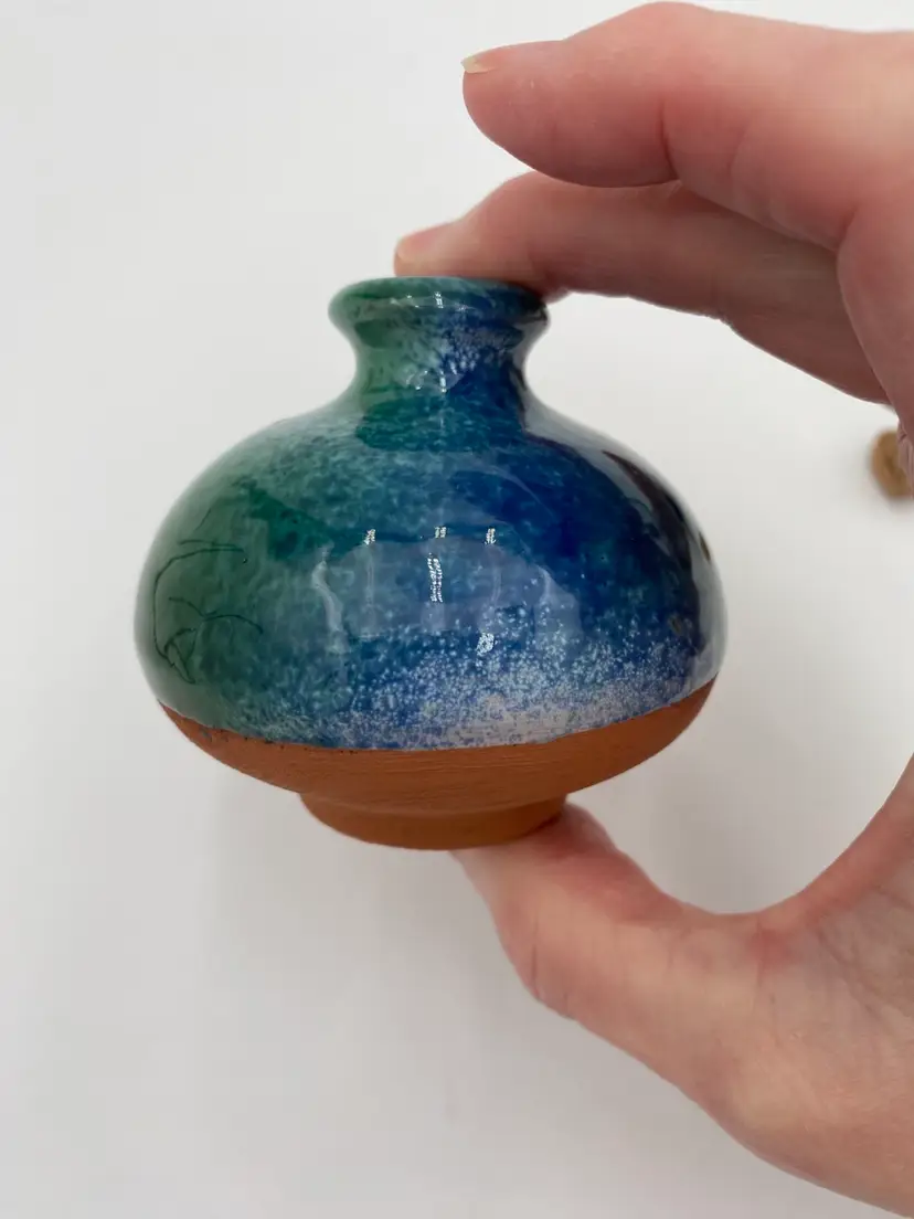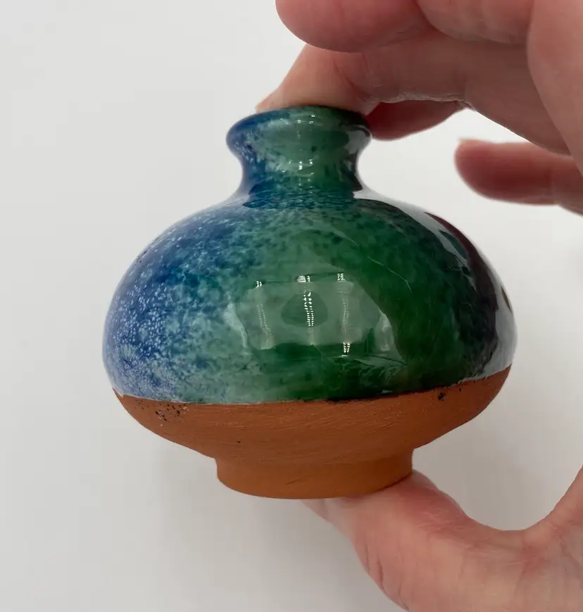 This French studio pottery Red Clay Oil Diffuser is a medium-sized piece that is handmade. Made of red clay and featuring blue and green speckled glazes, the corked jar sits atop a matching pedestal base. The piece weighs 8.1 ounces and can be used in any room of the home. The jar would also work with incense or scent sticks. Its a lovely piece! While I have not been able to determine the exact studio pottery based on their design logo, the piece is clearly marked as coming from France.
