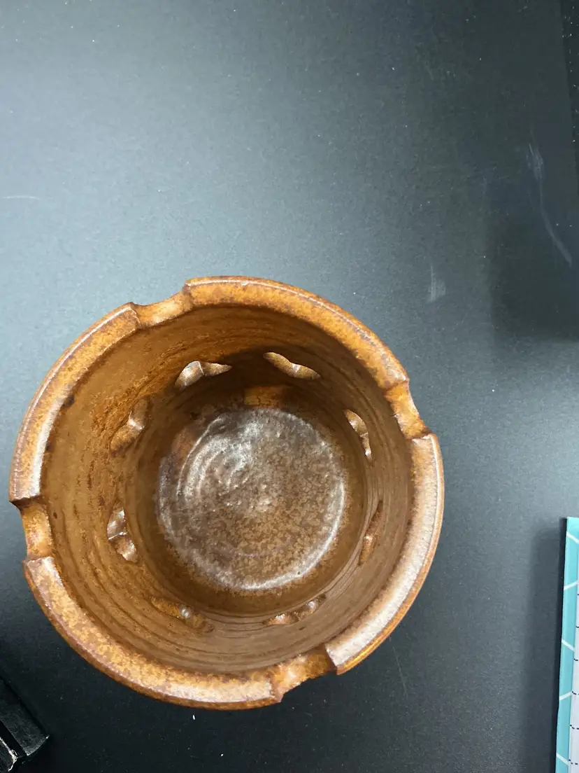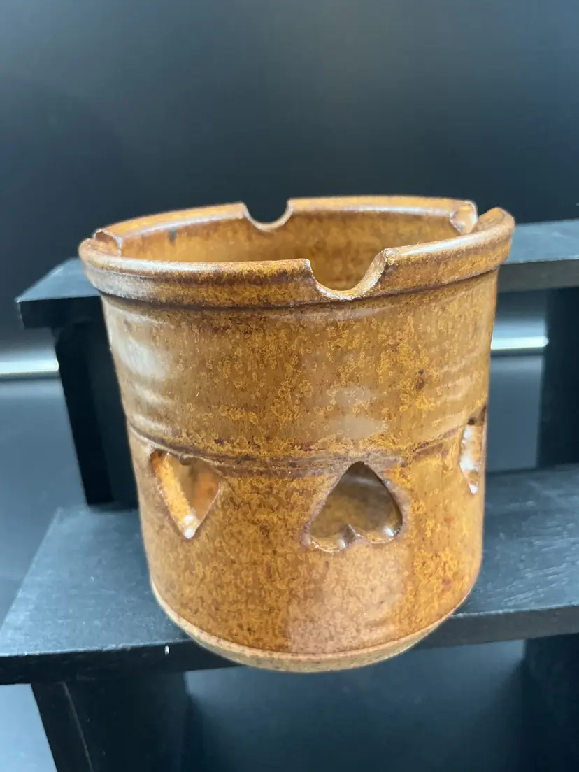 Studio pottery heart cut out, brown glaze with makers mark