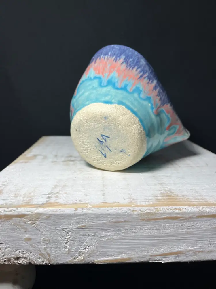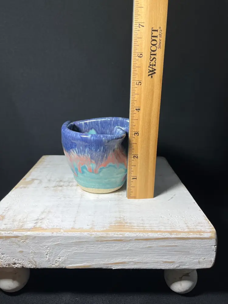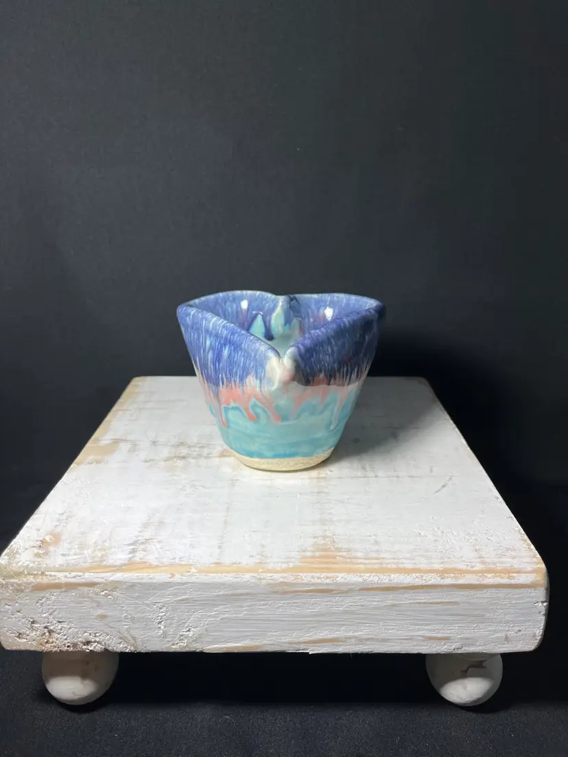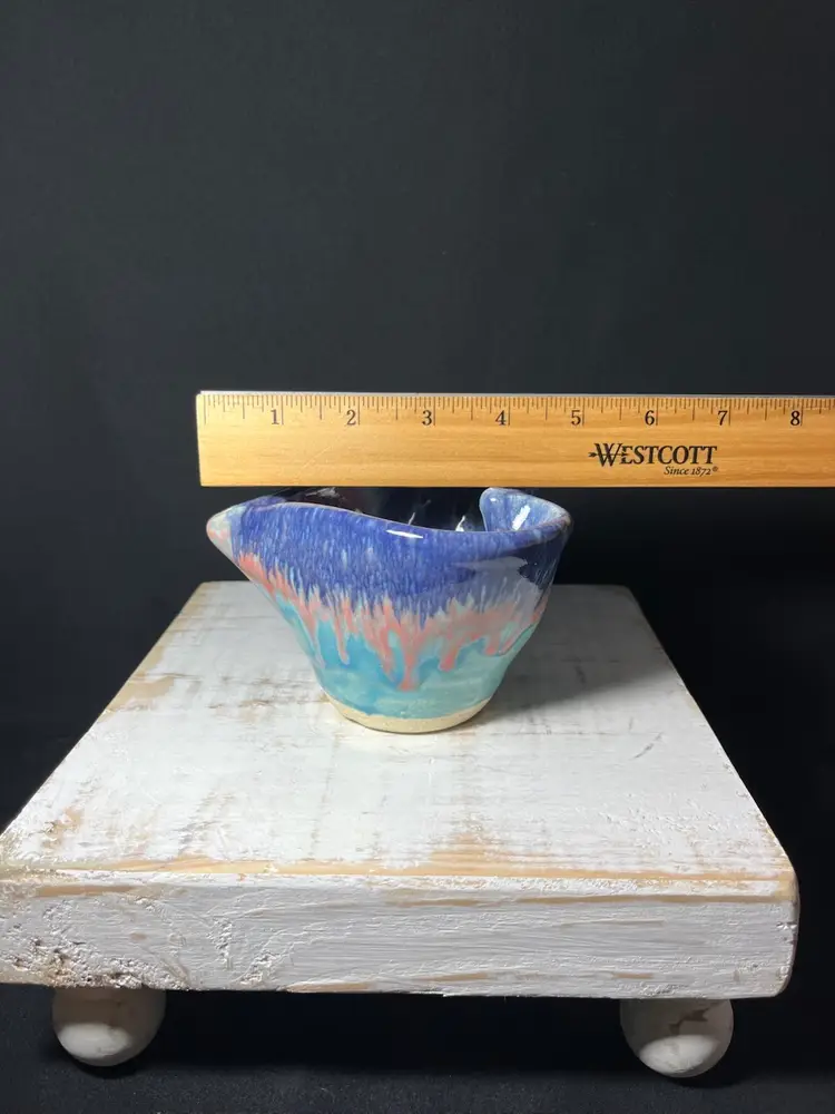 #1028 Signed Studio Pottery Heart Shaped Bowl. Blue/Purple/Pink tones. Measures 3.25” x 4.25” x 5”.