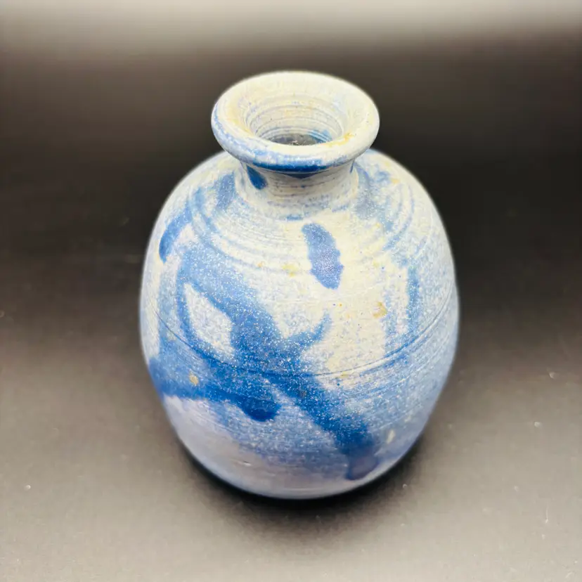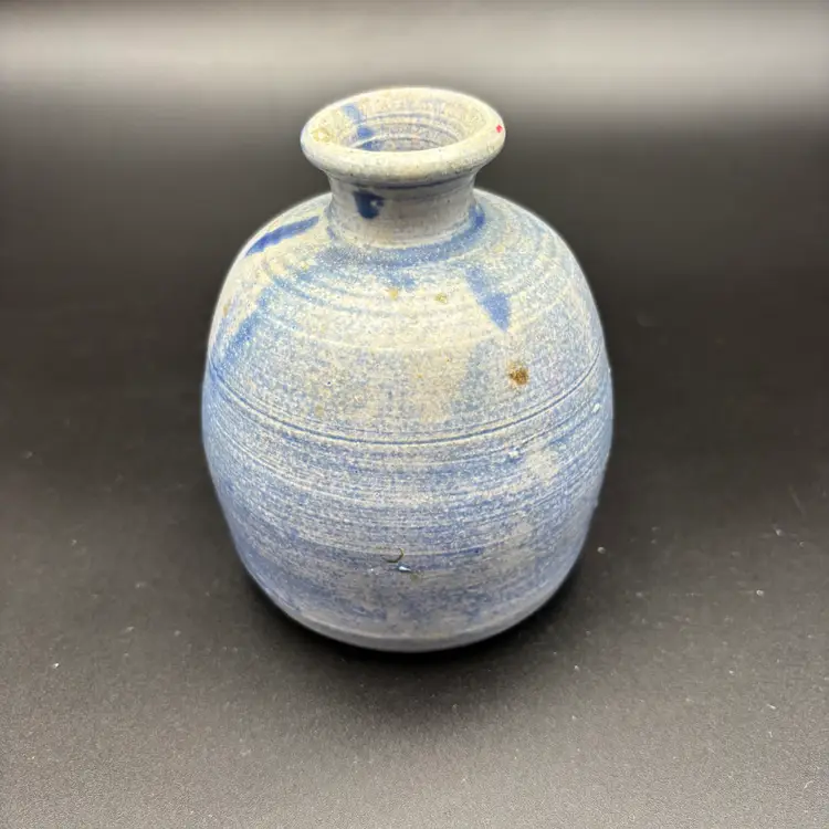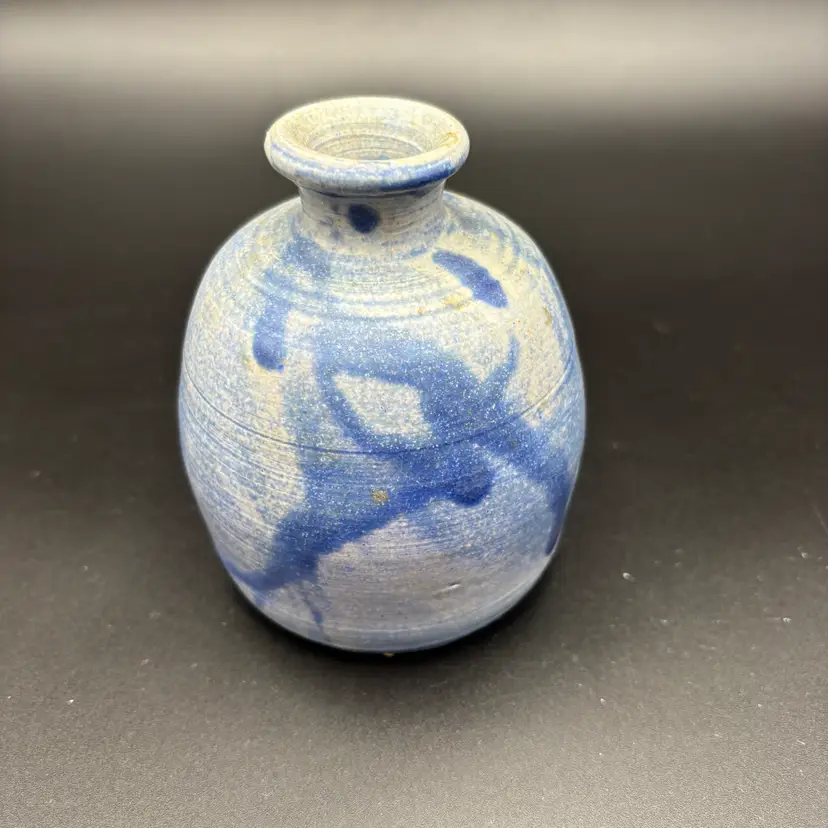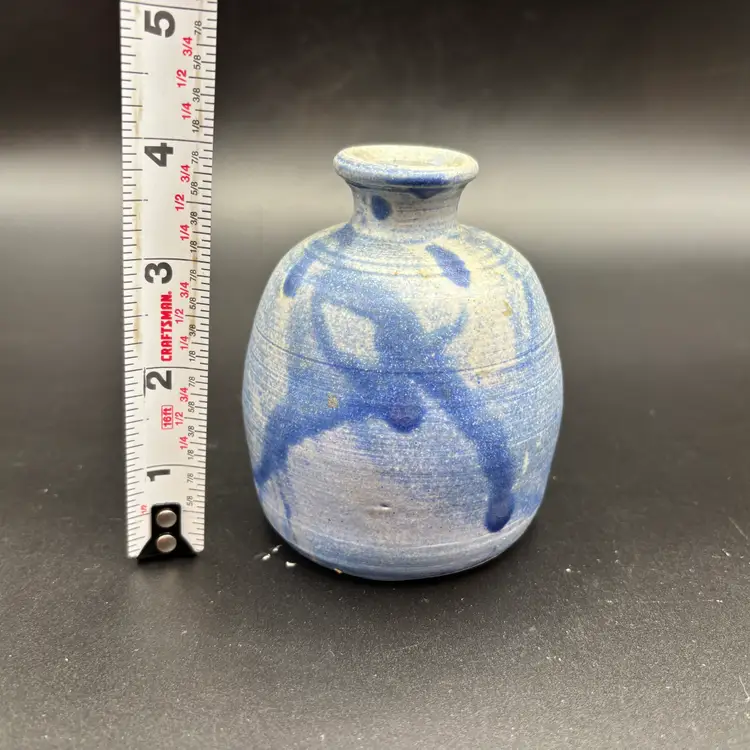 For sale is a Studio Pottery Mini Bud Vase Mini Jug Matte Blue Glaze Signed Sharon Camp