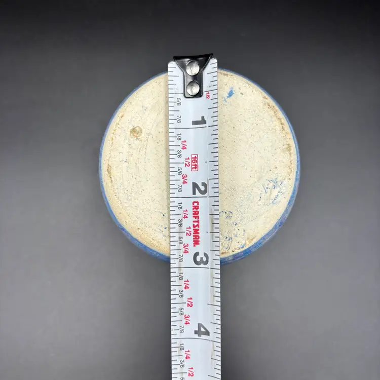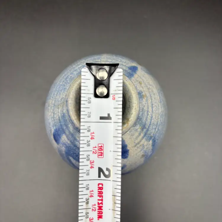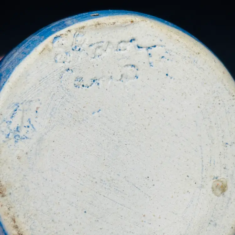 Features: it is signed "Sharon Camp" on the underside. She is a studio potterer from Georgia. The glaze is matte blue and the shape is similar to a jug without the handle.