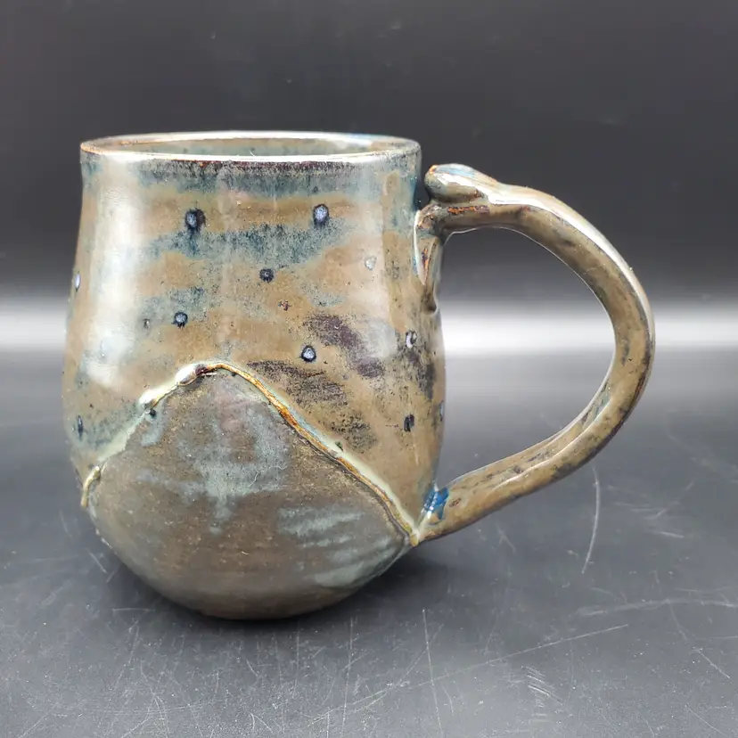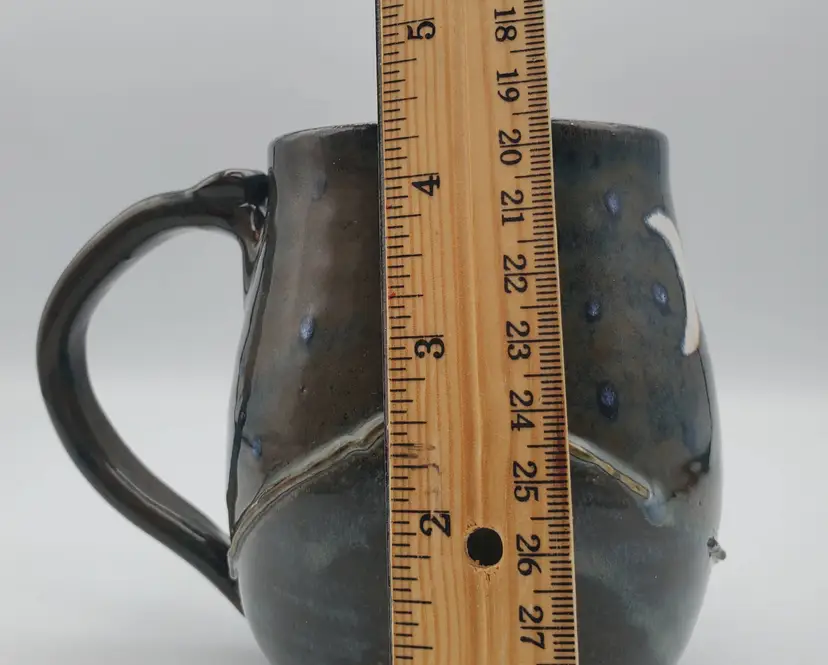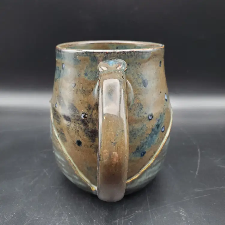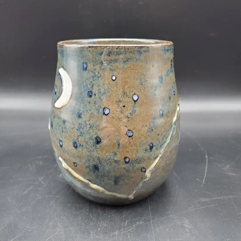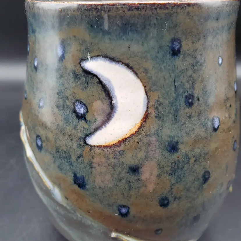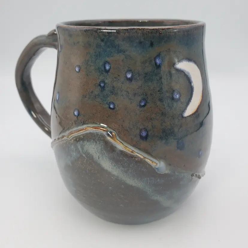 Beautiful hand thrown pottery mug featuring the Crescent moon and stars rising over mountains signed by the artist Cara B in 2022. Th glossy glaze is done in browns, blue and white. It measures approximately 4.5" tall and 3" at the rim. This cup is in very good pre owned condition.