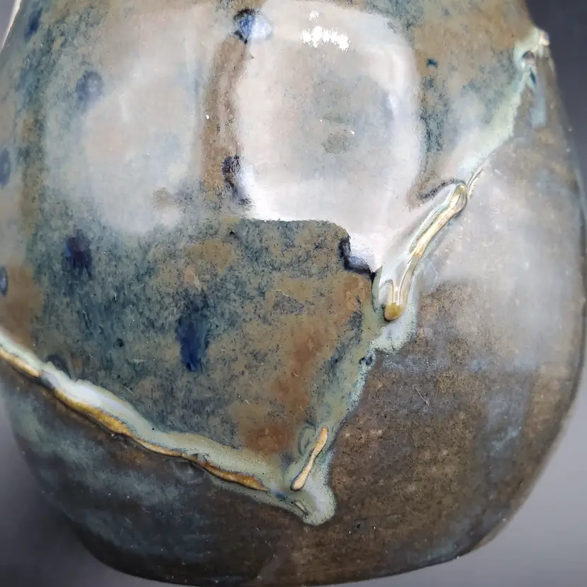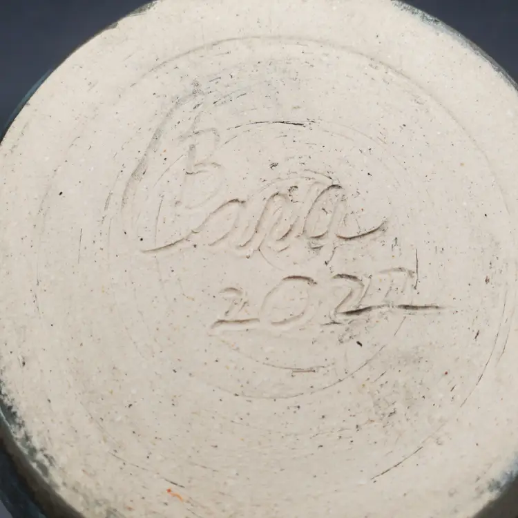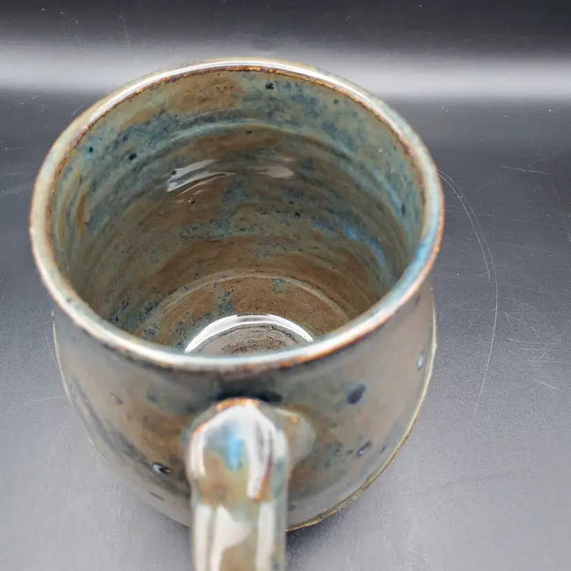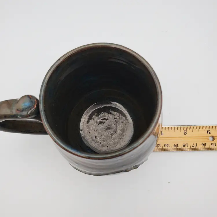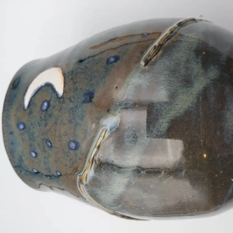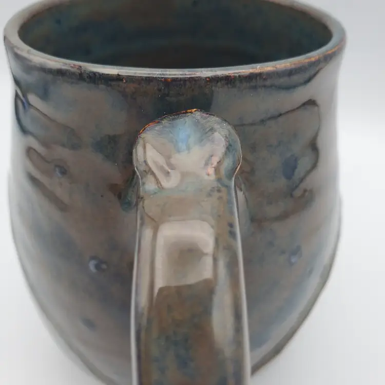 Beautiful hand thrown pottery mug featuring the Crescent moon and stars rising over mountains signed by the artist Cara B in 2022. Th glossy glaze is done in browns, blue and white. It measures approximately 4.5" tall and 3" at the rim. This cup is in very good pre owned condition.