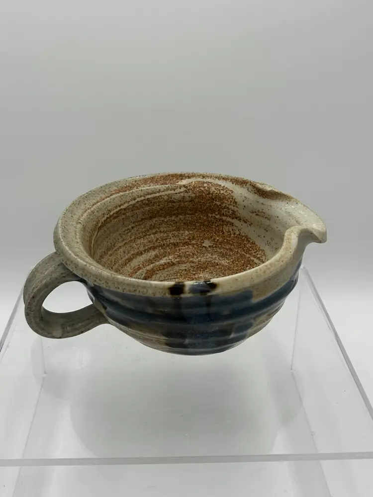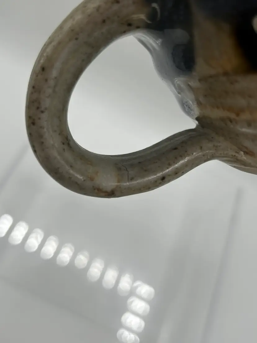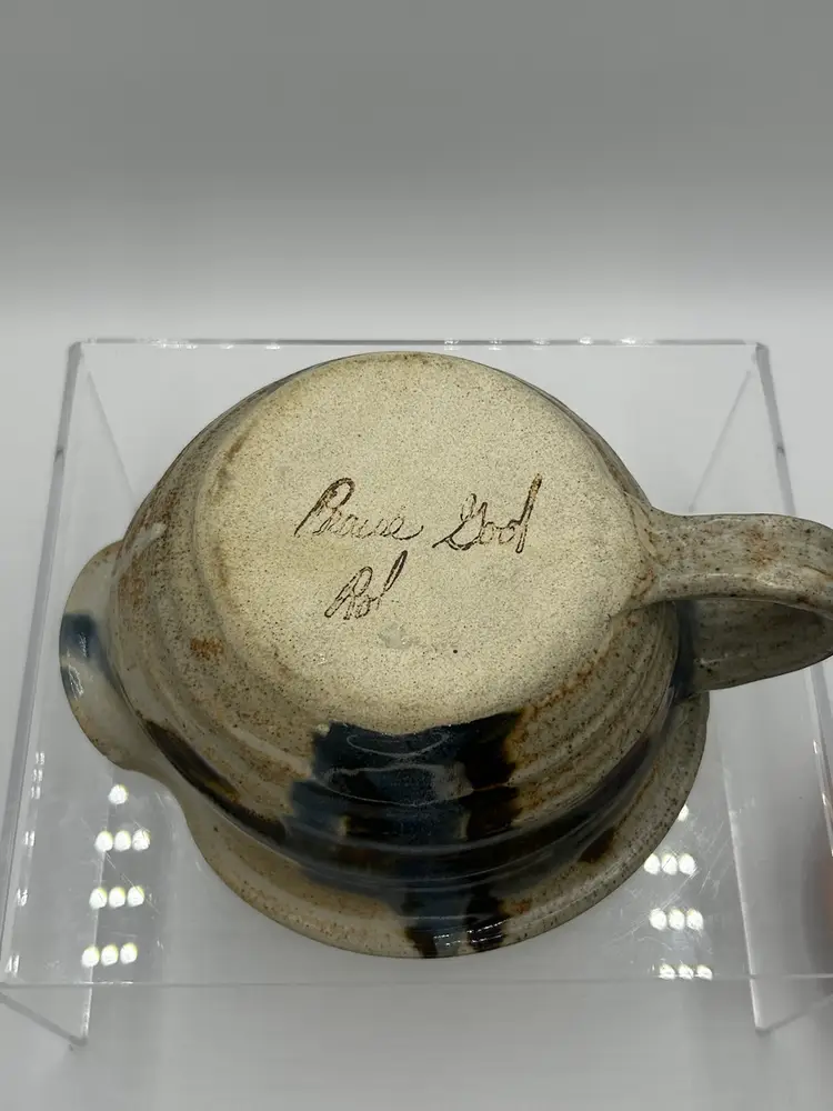 Signed. Small chip on spout. Small crack on handle. See photos. 6 inches diameter