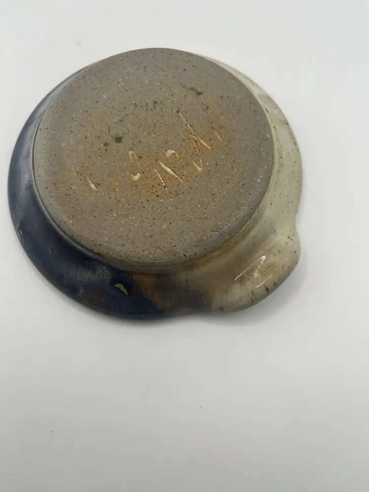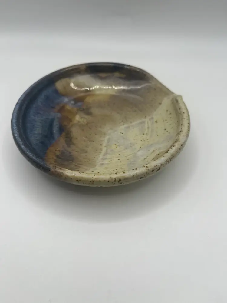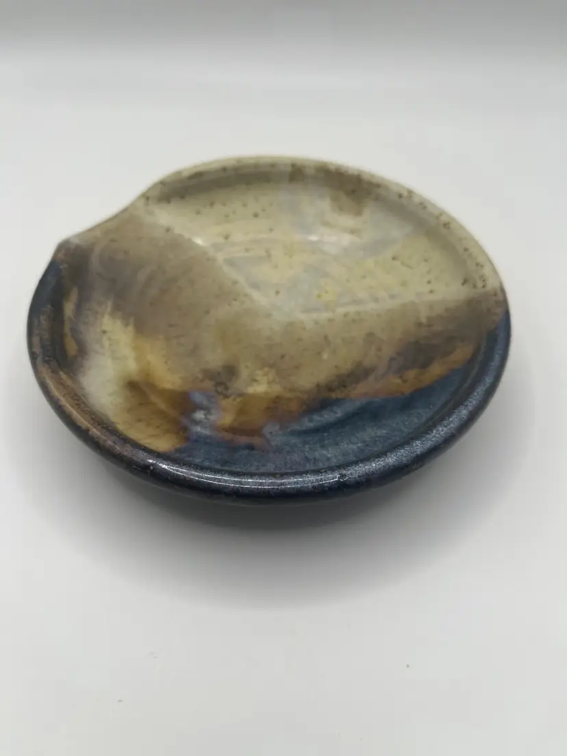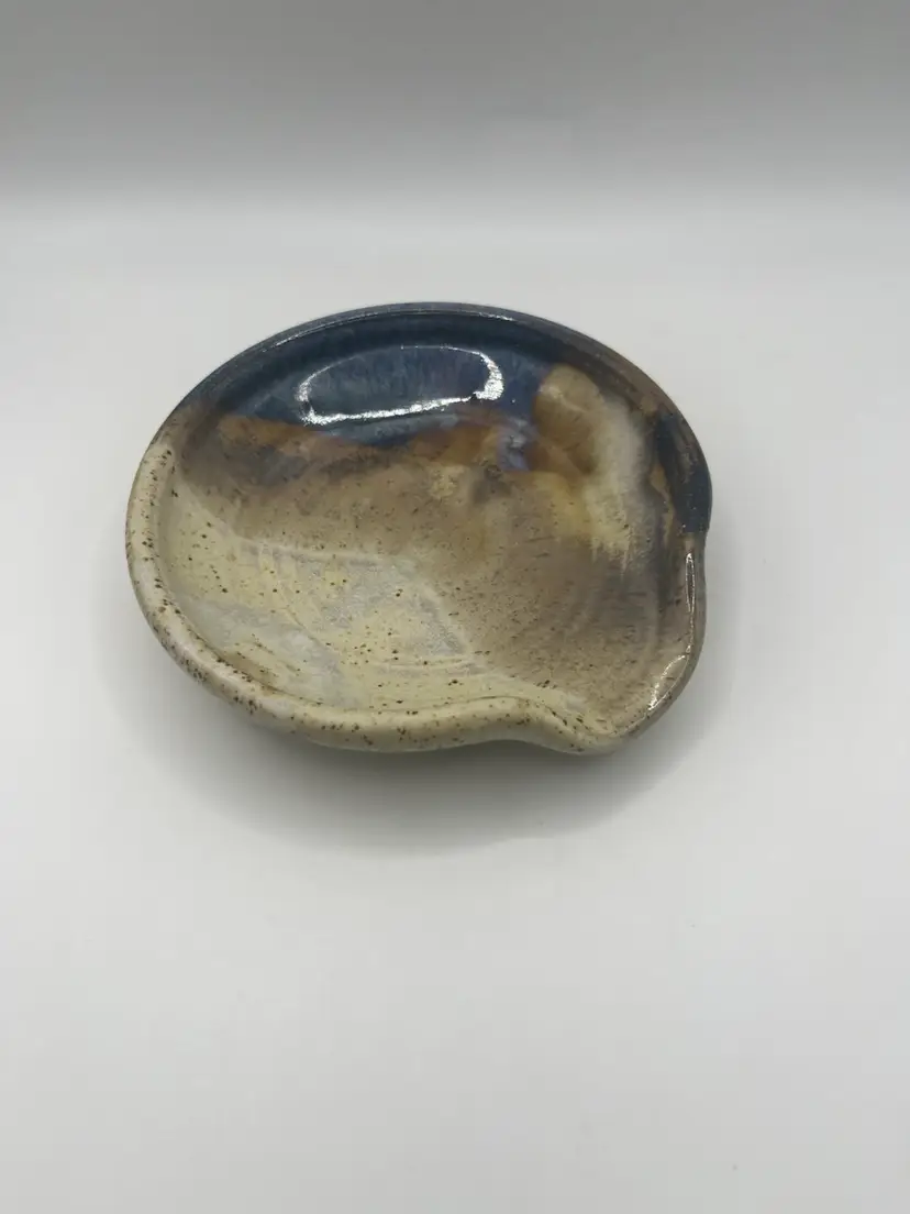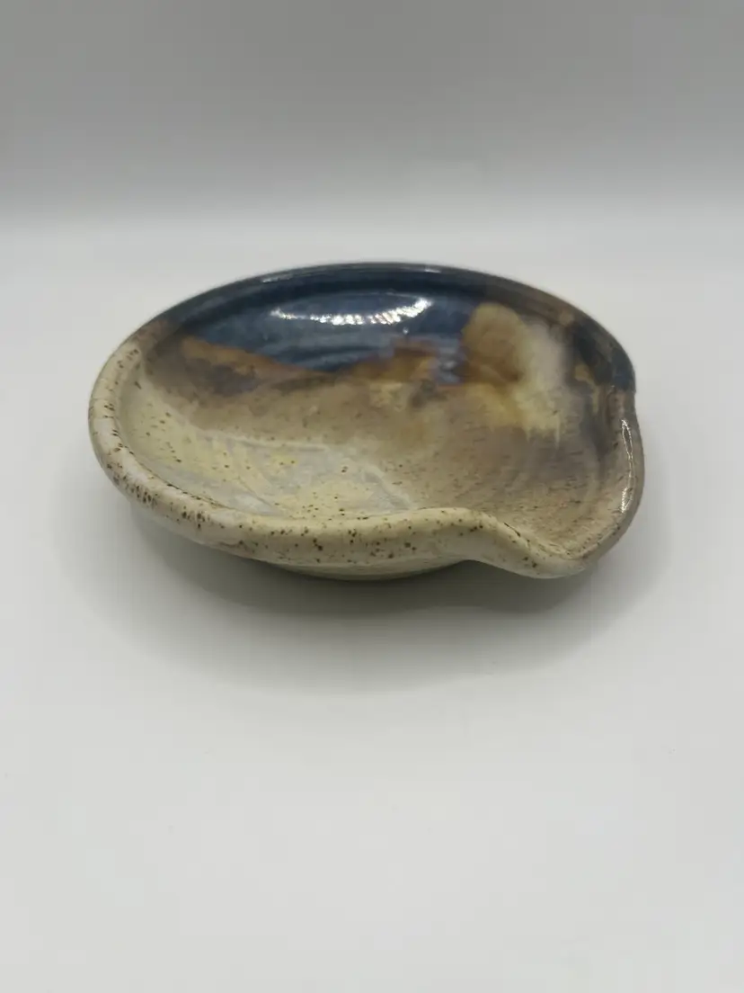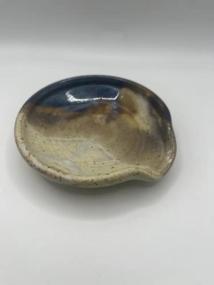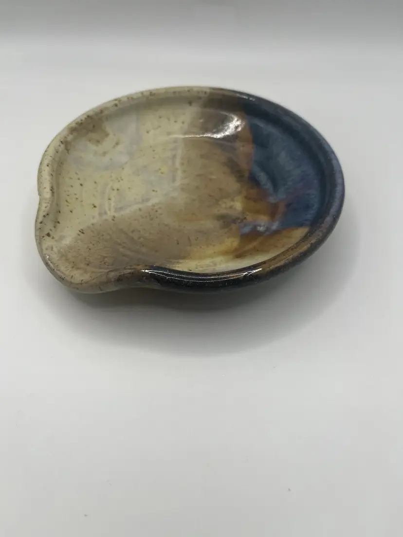 This beautifully glazed ceramic spoon rest measures 5” across. No chips or cracks. Artist signed.