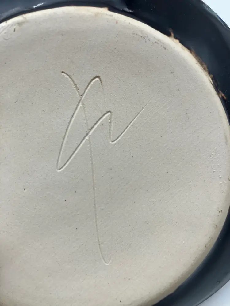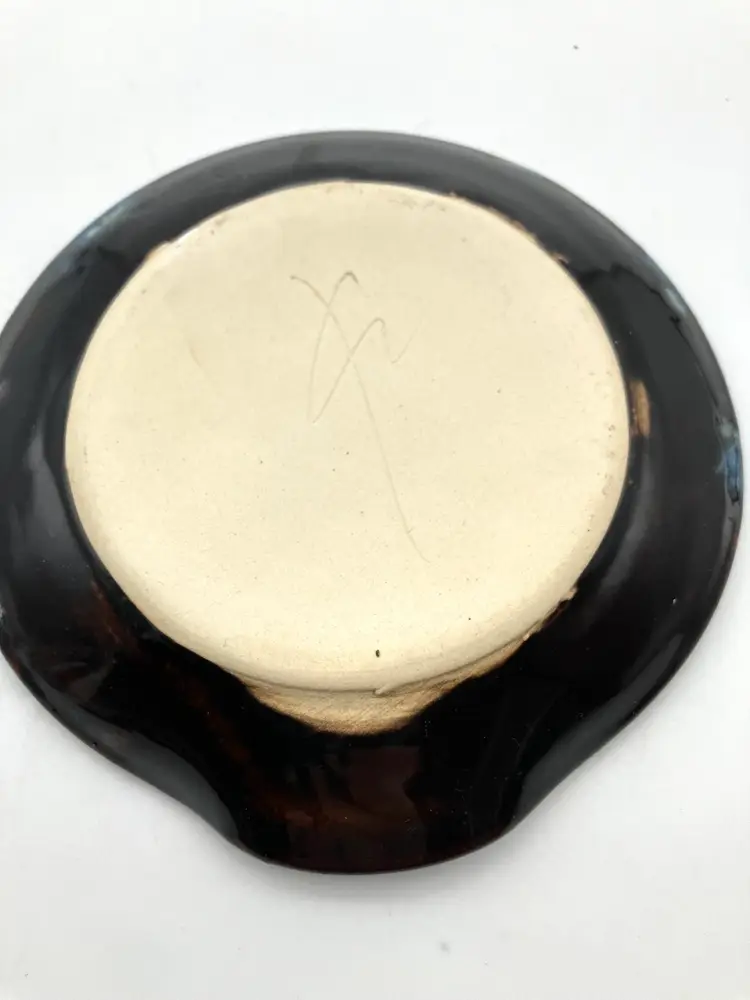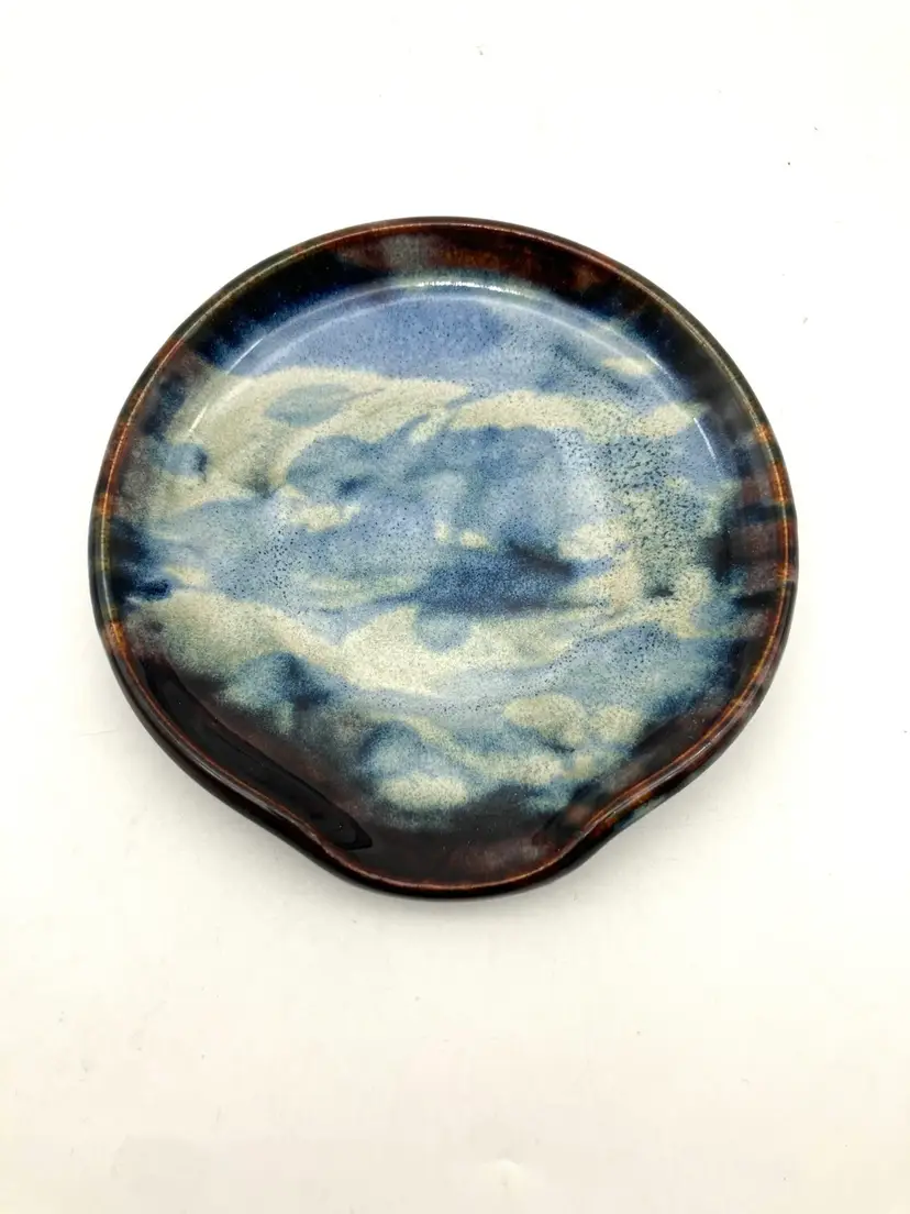 Spoon rest in blues and browns. 5.5” diameter and 0.75” tall. Excellent condition. I am not sure who made it but it is signed.
