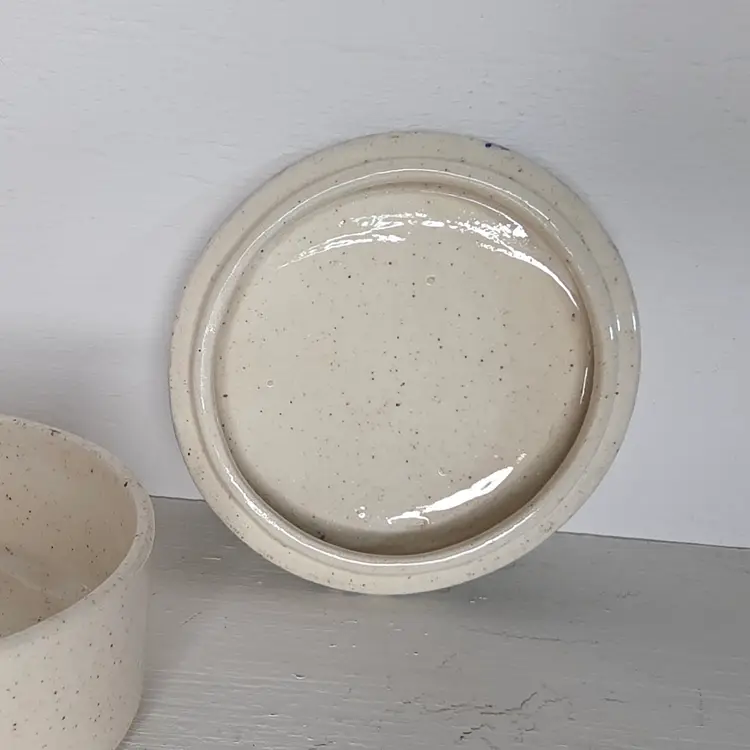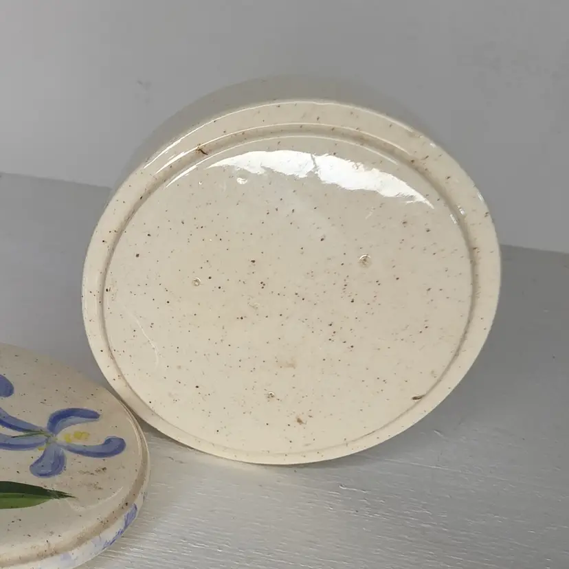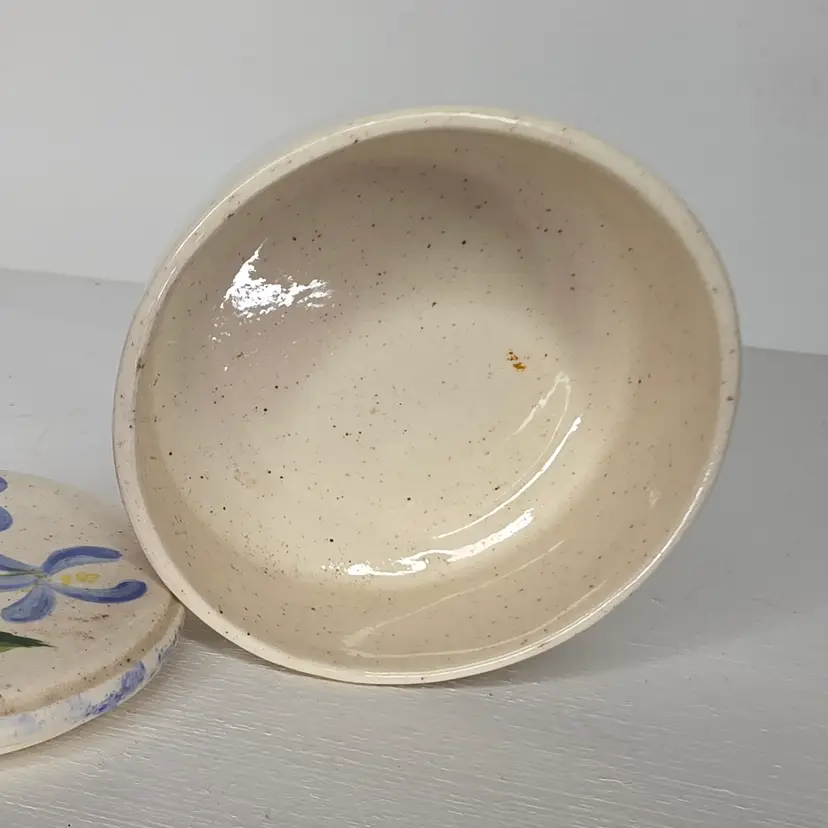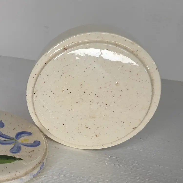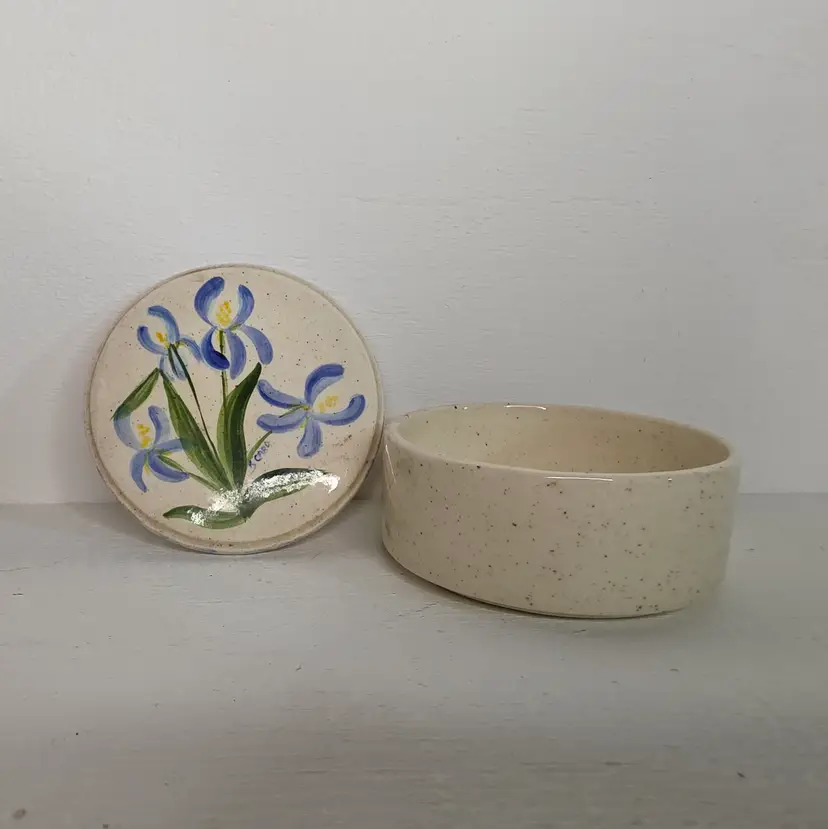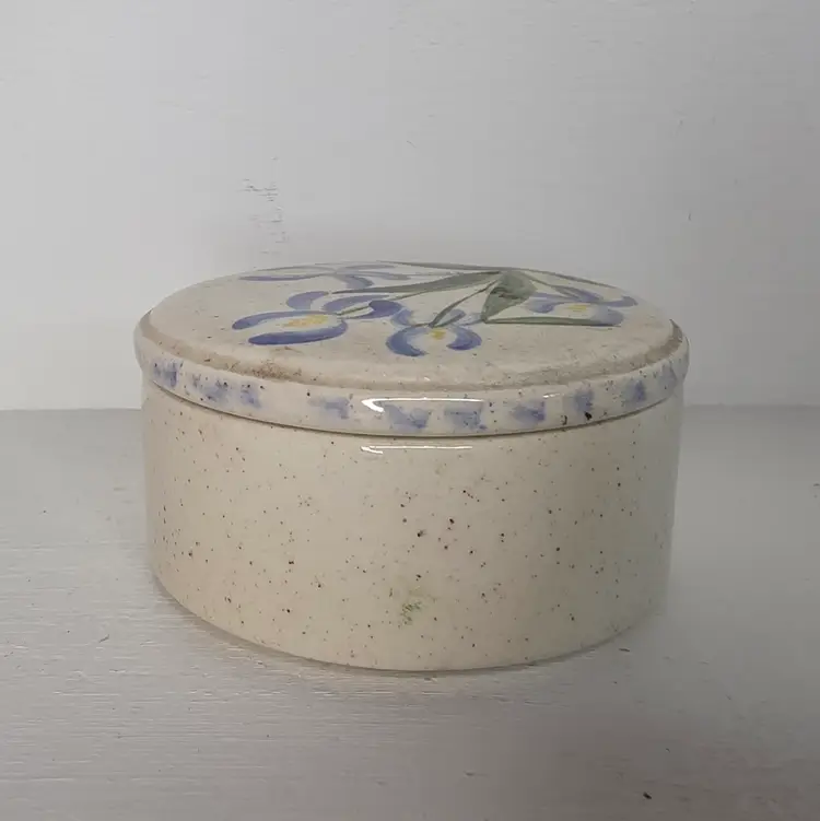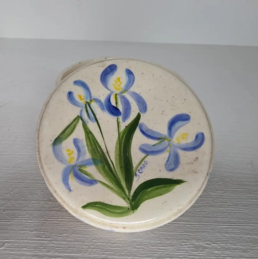 Studio Pottery Trinket Box or salt cellar with blue and yellow flowers. Signed "S. Card".
