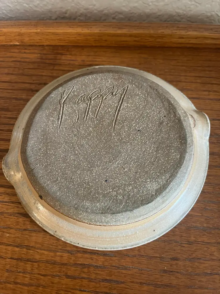 This beautiful piece of artist signed pottery could be used as a trinket dish or a spoon rest. You could even use a stand to display as a piece of art. It measures 6 1/2” across with no chips or cracks.