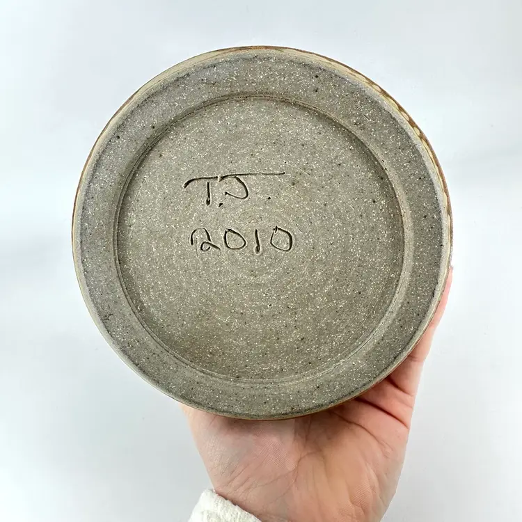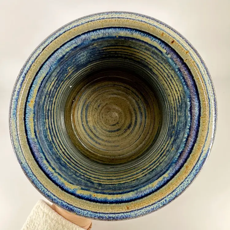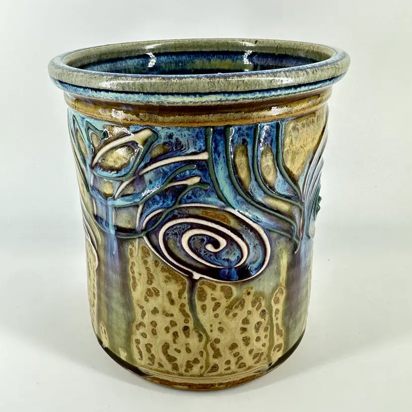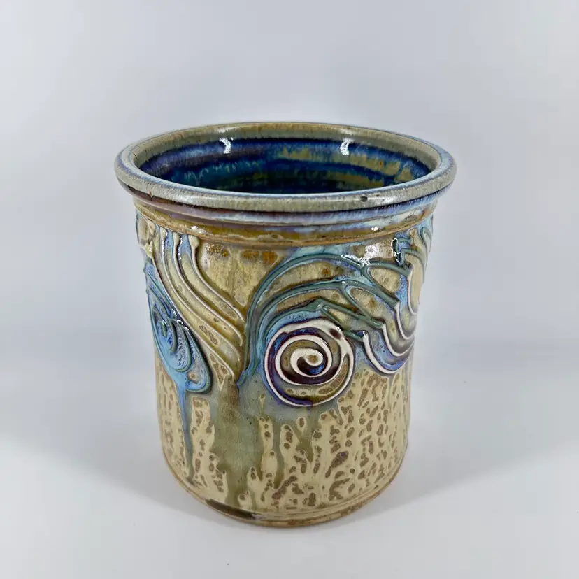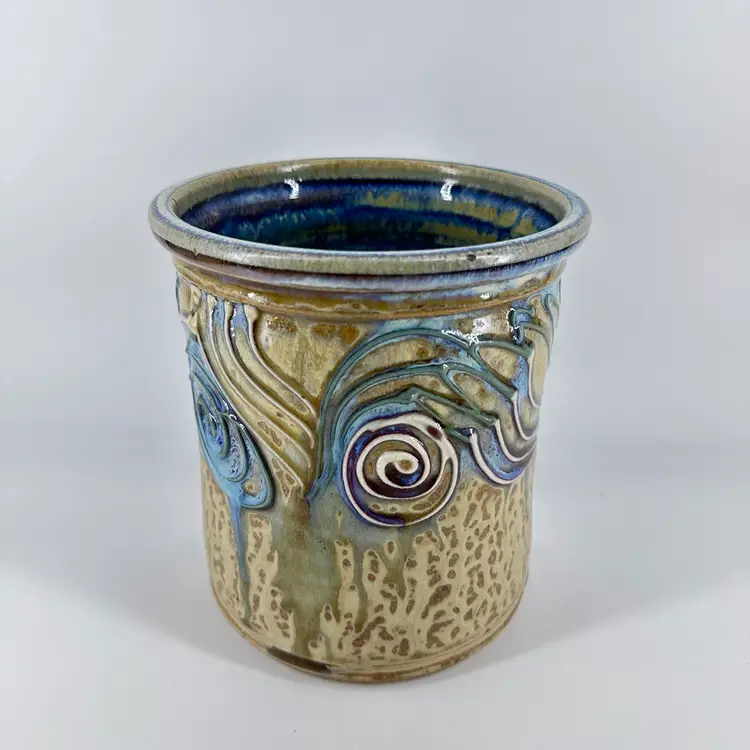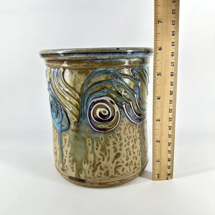 This studio pottery jar functions as a kitchen utensil holder. It features blue and white swirls and a unique glaze texture. There are no chips or cracks, however there is some crazing in the glaze as shown. Jar measures approximately 6” tall and has a 5” wide opening. Has a “T.J. 2010” marking on bottom.