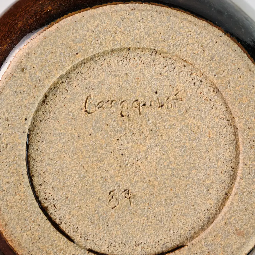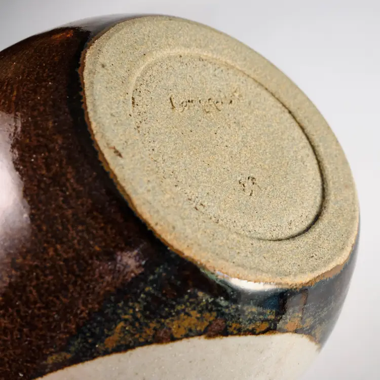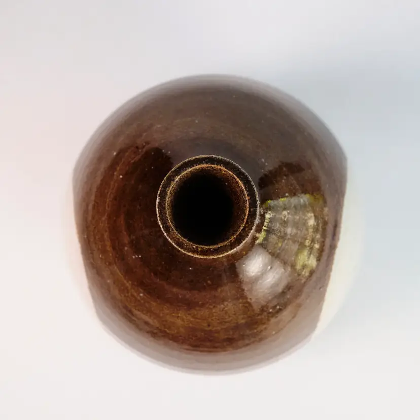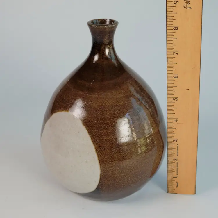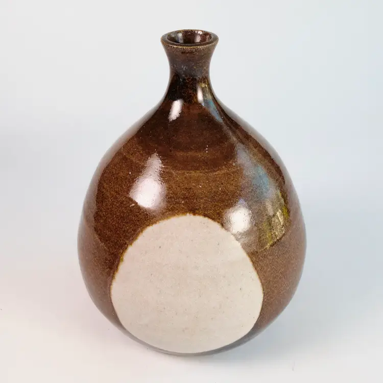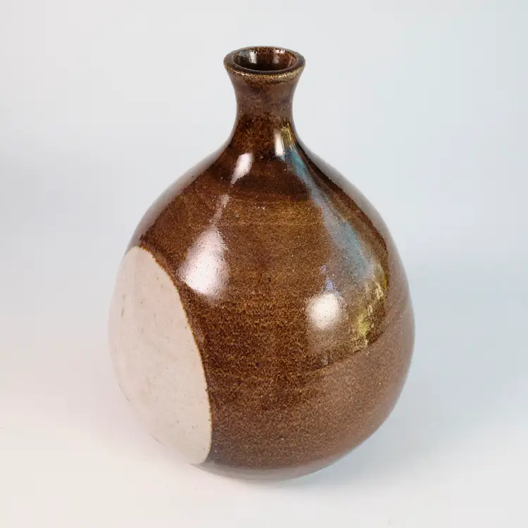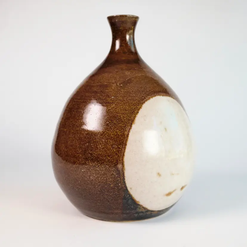 A wheel-thrown stoneware vase with a round body and tapering neck, glazed in brown with white at the center. Signed and dated on base Bergquist.