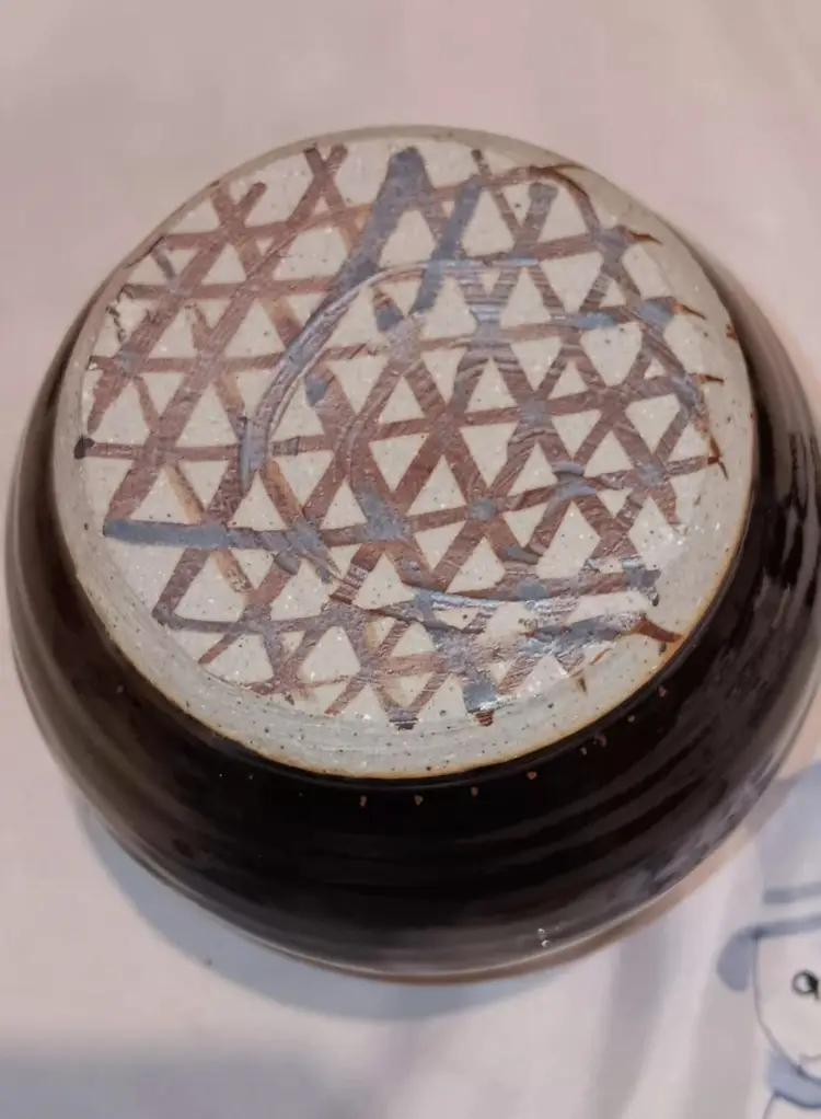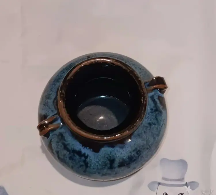 Pretty blue and black Drip Glaze vase with handles. Excellent condition no chips or cracks. Measuring 5"x5". Has a marking on bottom.